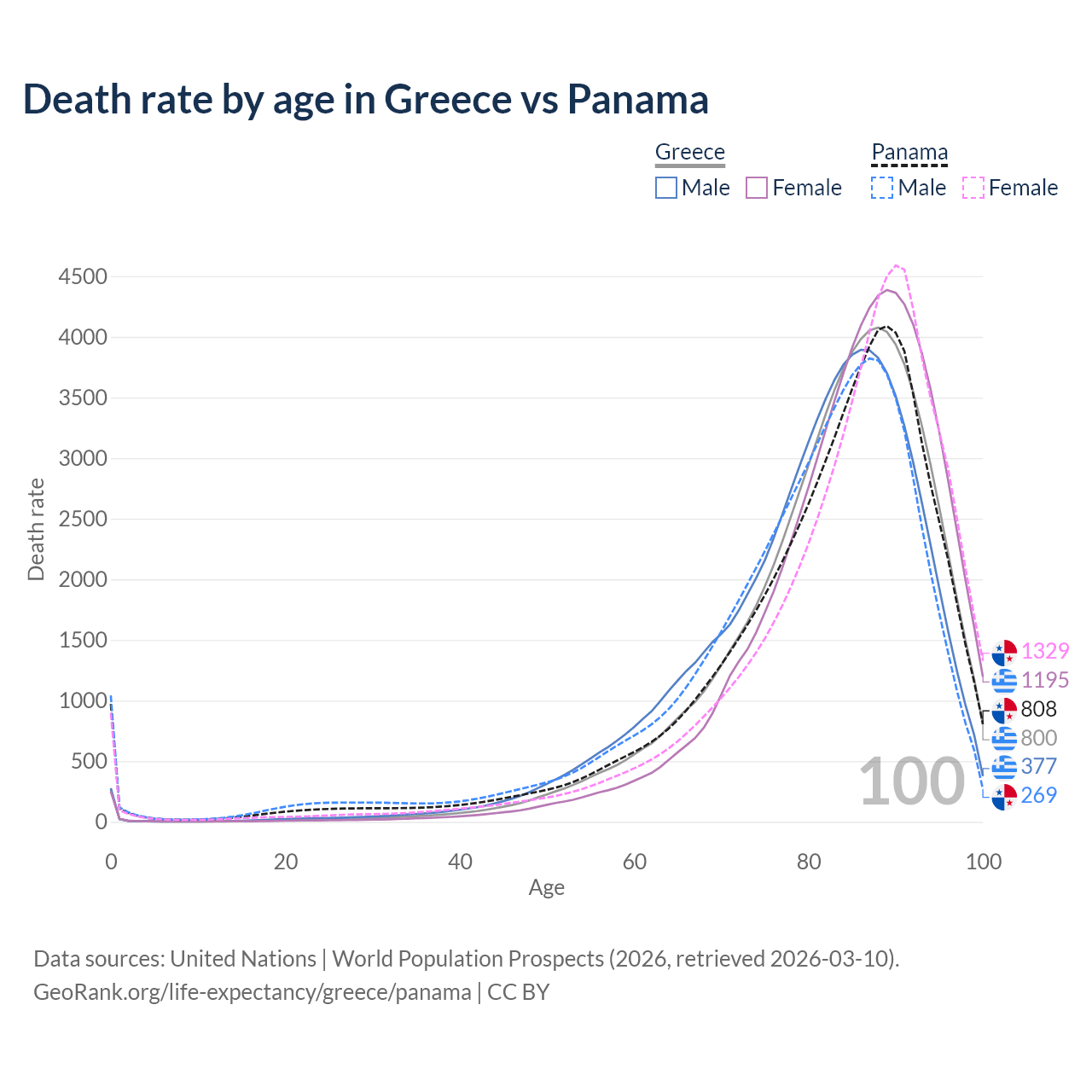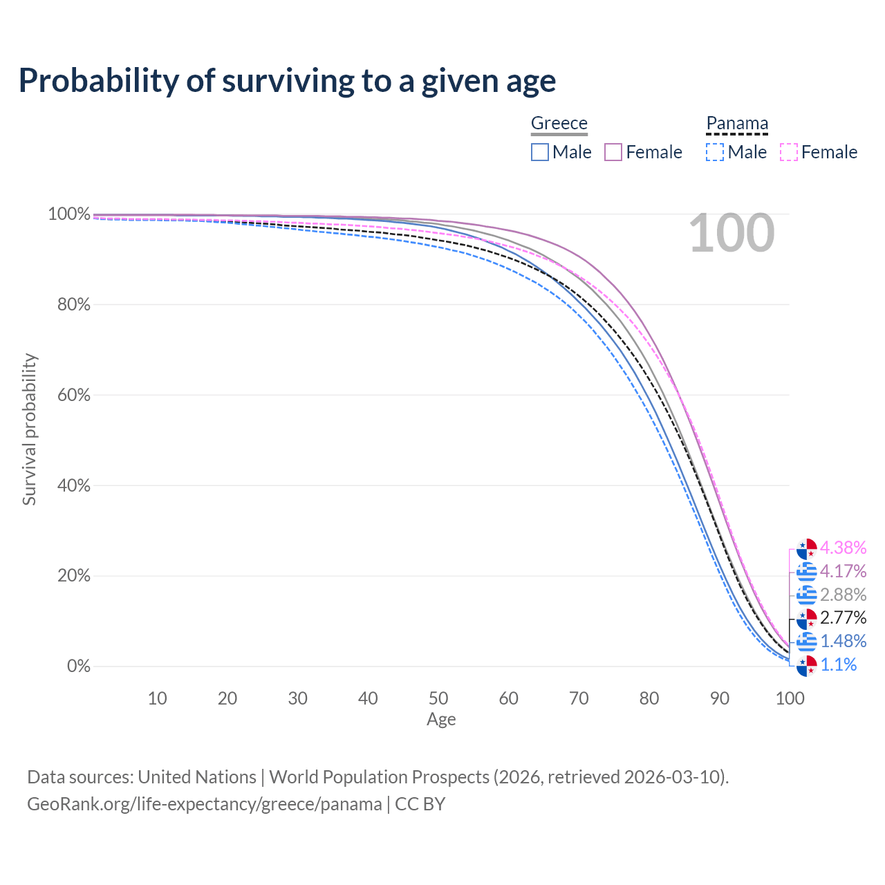 This life expectancy calculator shows the odds of living to 100, 95, 90, and below based on current age for both males and females in Greece and Panama, along with mean and median age of death. The calculations are based on the 2026 life tables (actuarial tables) from the UN World Population Prospects.
