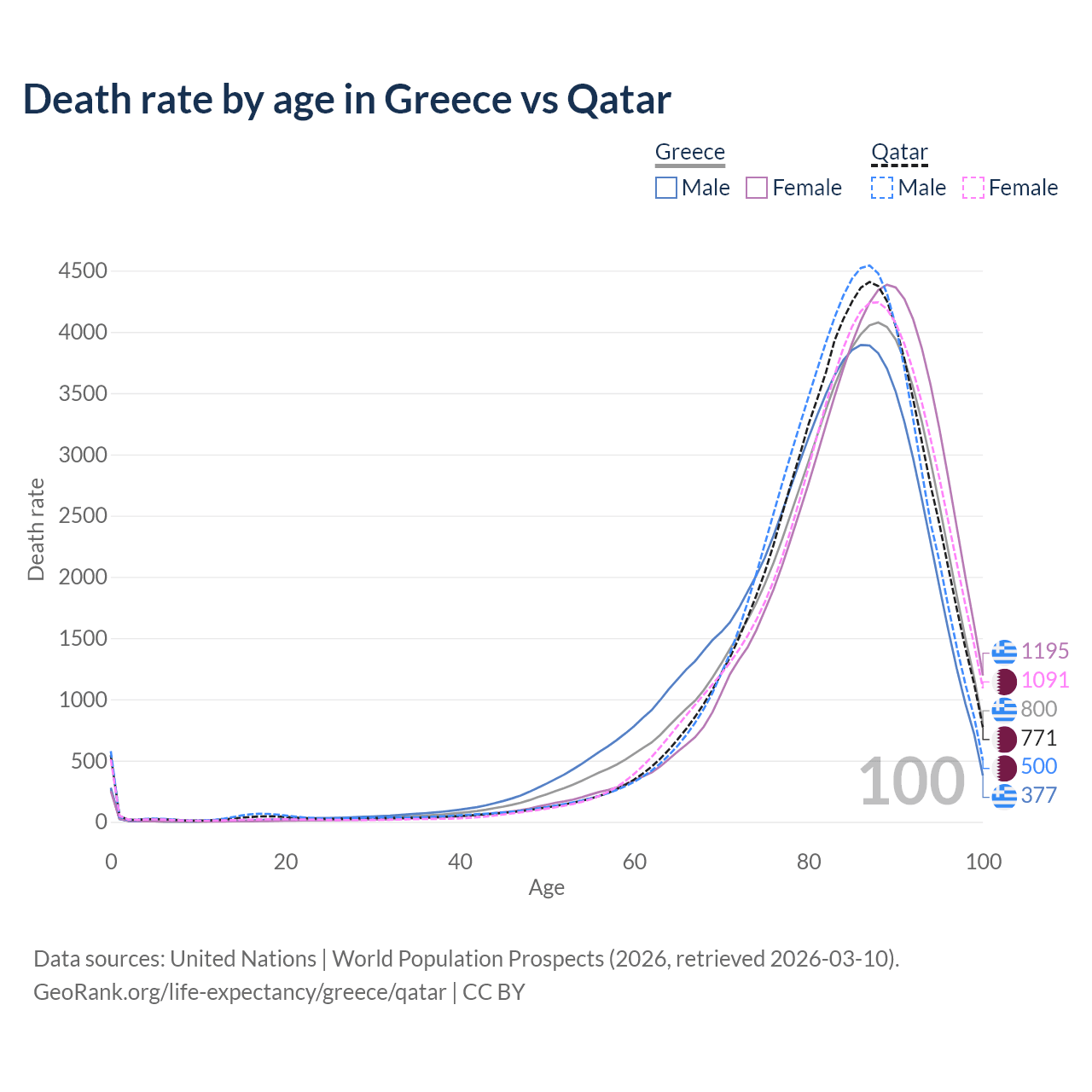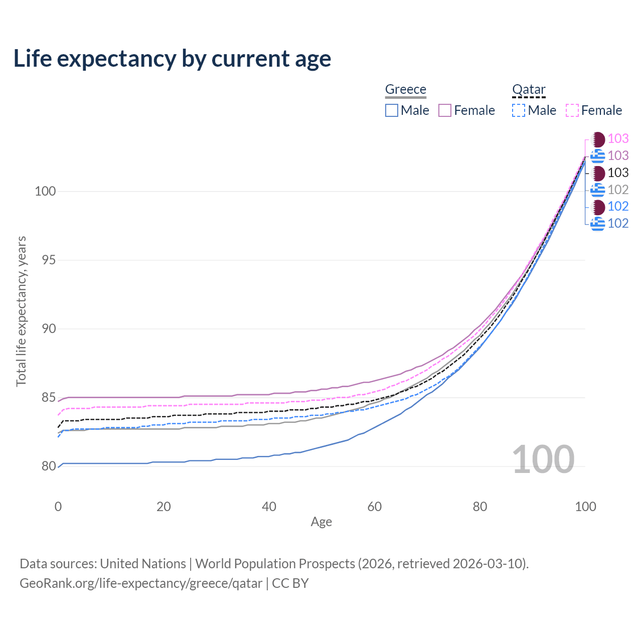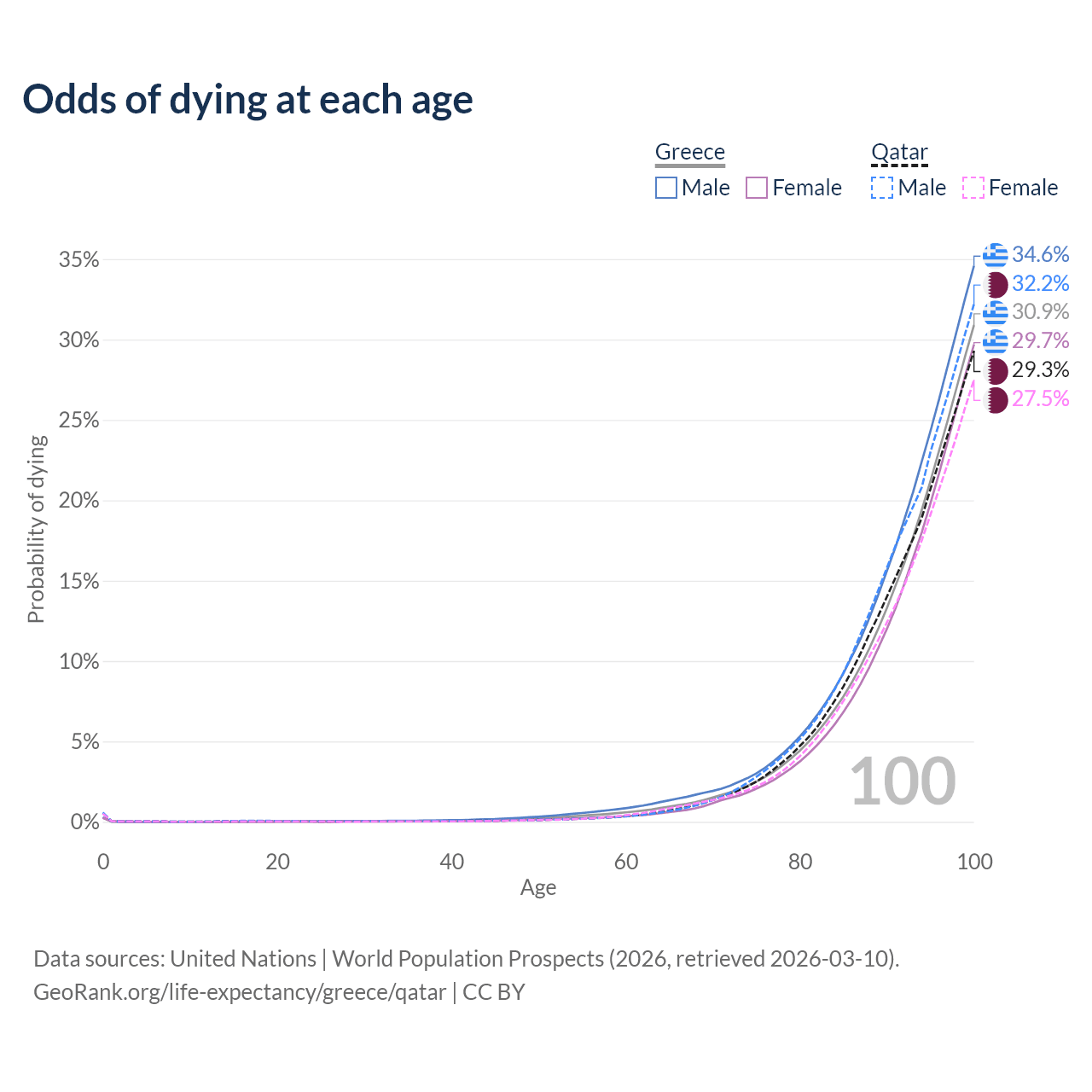 This life expectancy calculator shows the odds of living to 100, 95, 90, and below based on current age for both males and females in Greece and Qatar, along with mean and median age of death. The calculations are based on the 2026 life tables (actuarial tables) from the UN World Population Prospects.