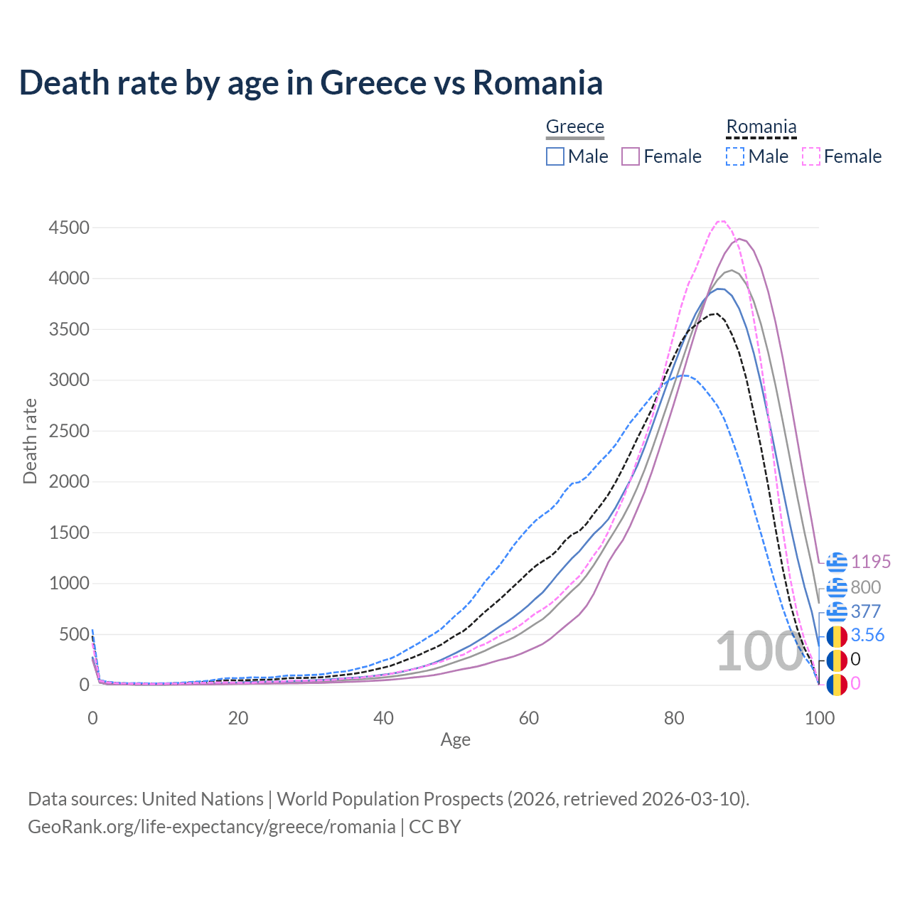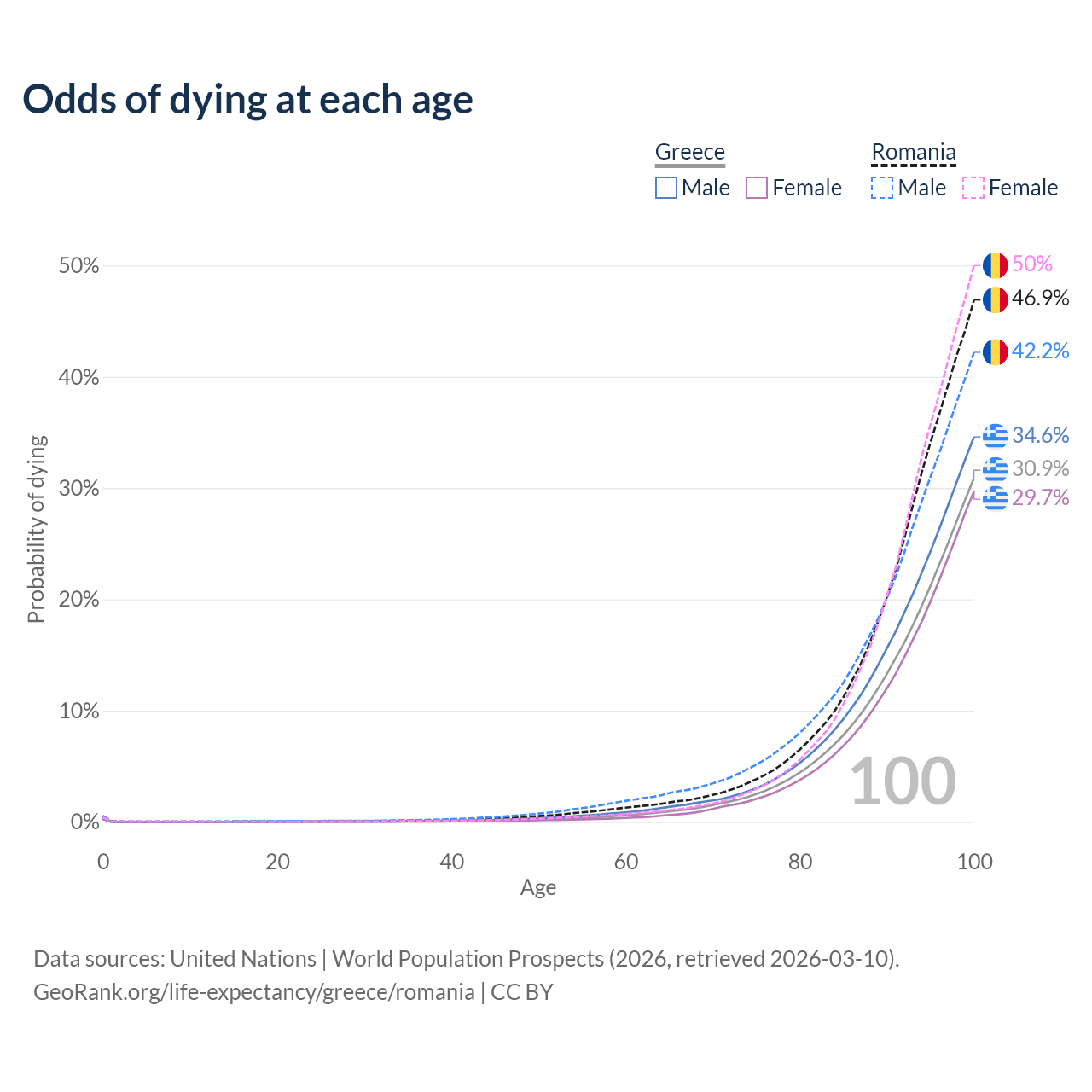 This life expectancy calculator shows the odds of living to 100, 95, 90, and below based on current age for both males and females in Greece and Romania, along with mean and median age of death. The calculations are based on the 2026 life tables (actuarial tables) from the UN World Population Prospects.