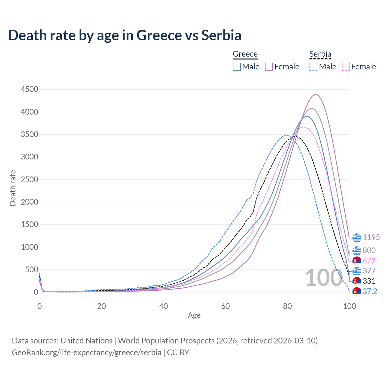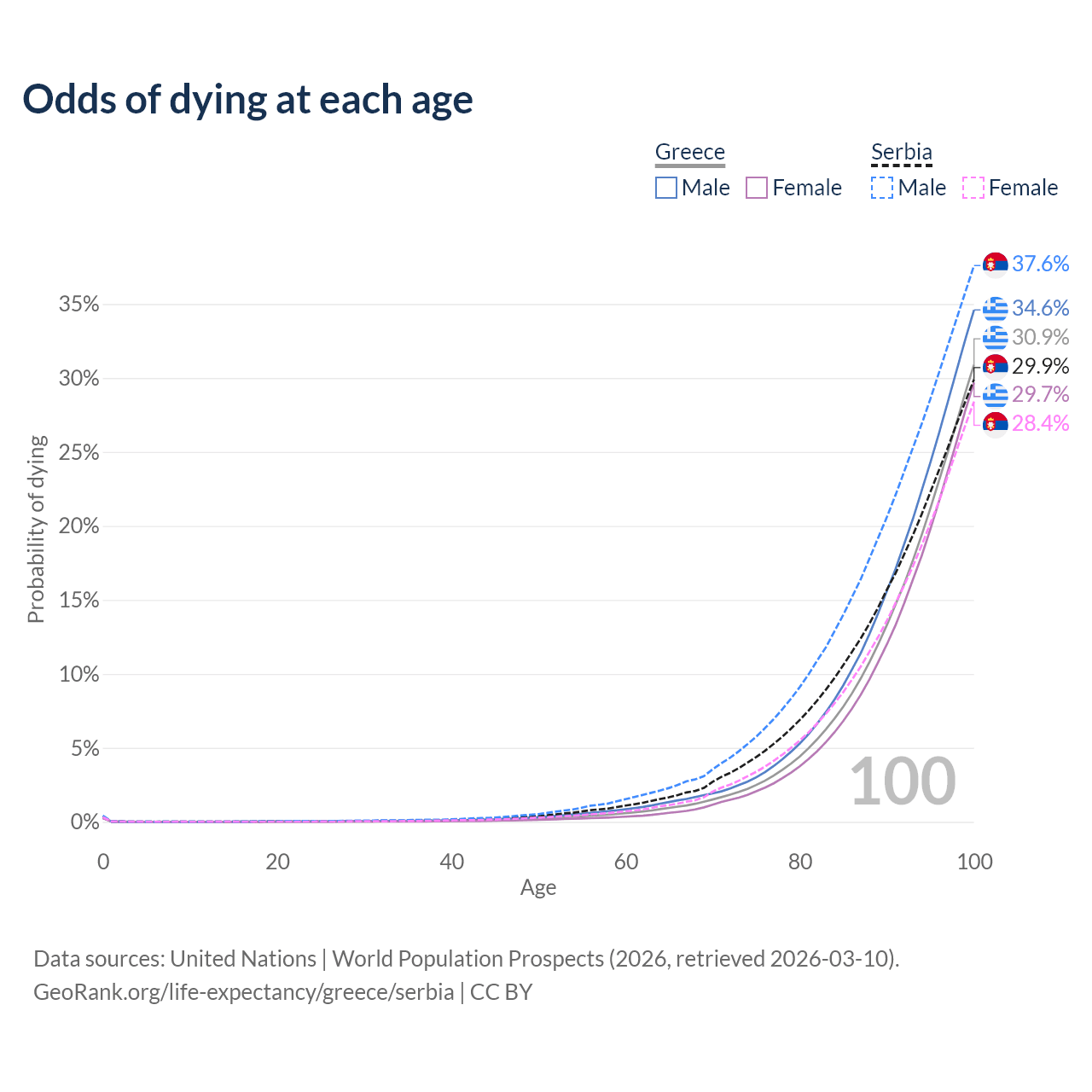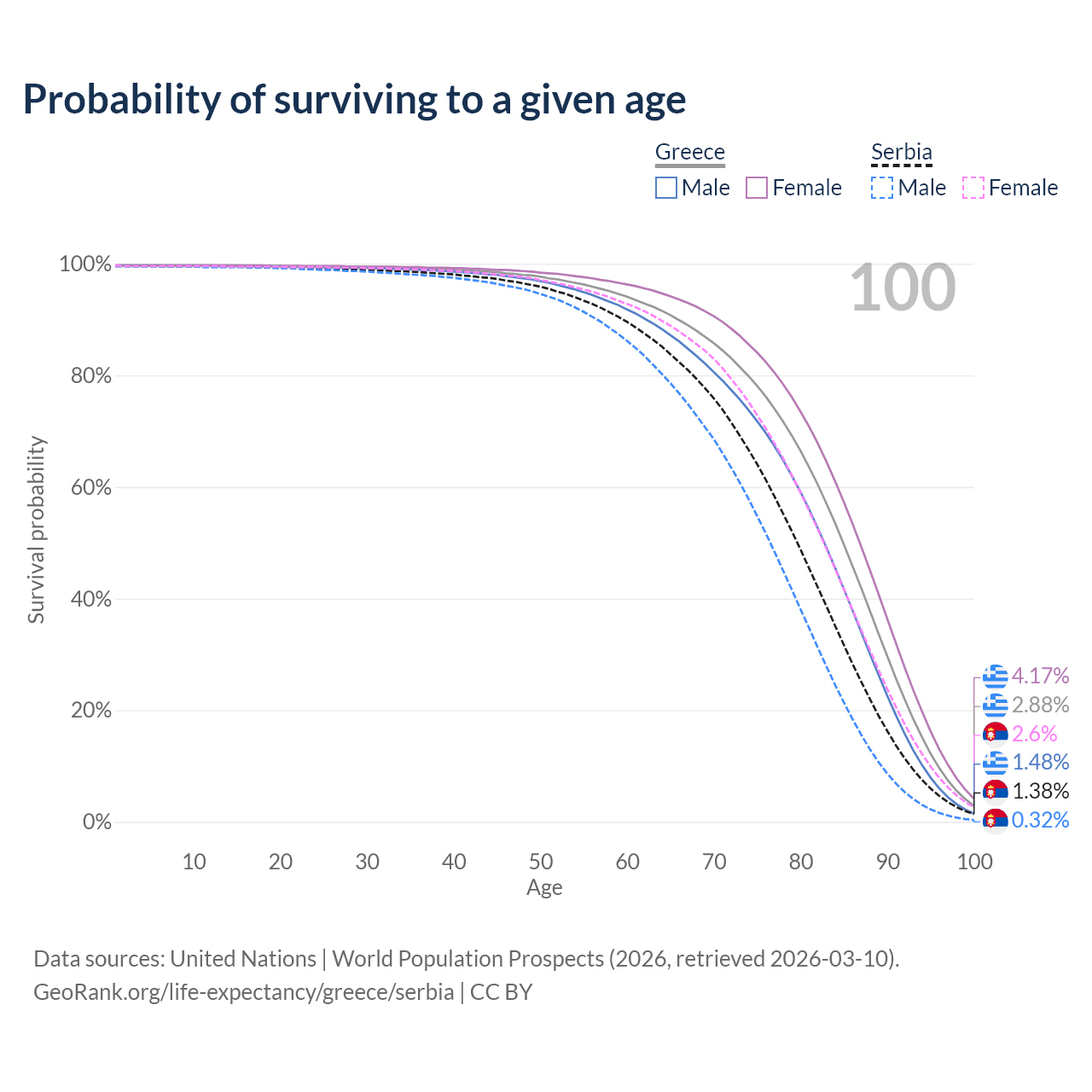 This life expectancy calculator shows the odds of living to 100, 95, 90, and below based on current age for both males and females in Greece and Serbia, along with mean and median age of death. The calculations are based on the 2026 life tables (actuarial tables) from the UN World Population Prospects.