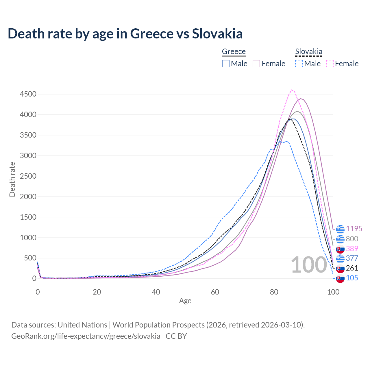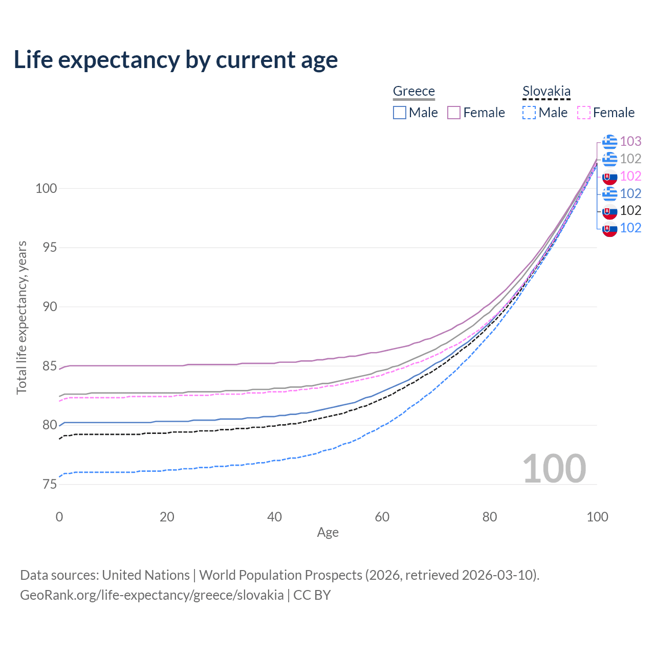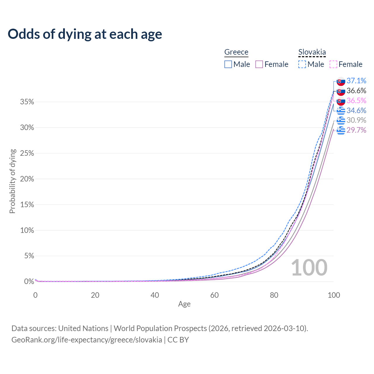 This life expectancy calculator shows the odds of living to 100, 95, 90, and below based on current age for both males and females in Greece and Slovakia, along with mean and median age of death. The calculations are based on the 2026 life tables (actuarial tables) from the UN World Population Prospects.
