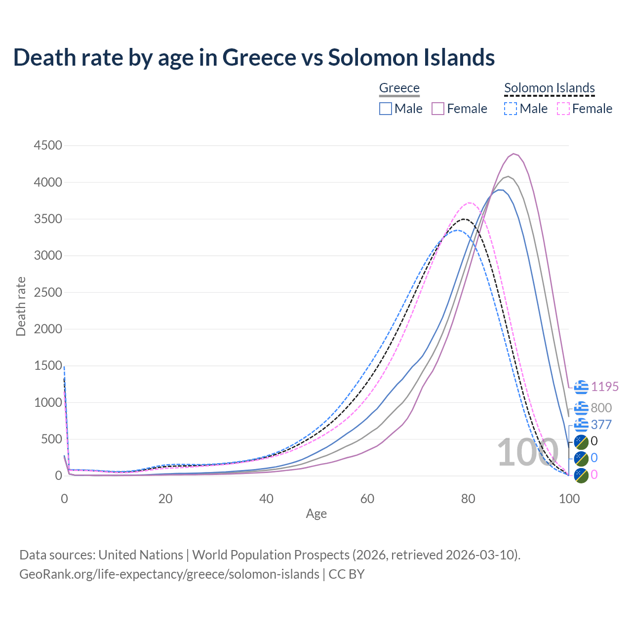 In Greece, the most common age of death is 88, compared to 79 in the Solomon Islands. The median age of death is 84.9 in Greece and 74.9 in the Solomon Islands, meaning only half of each cohort is expected to live past that age.