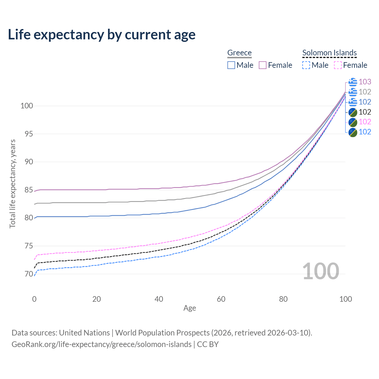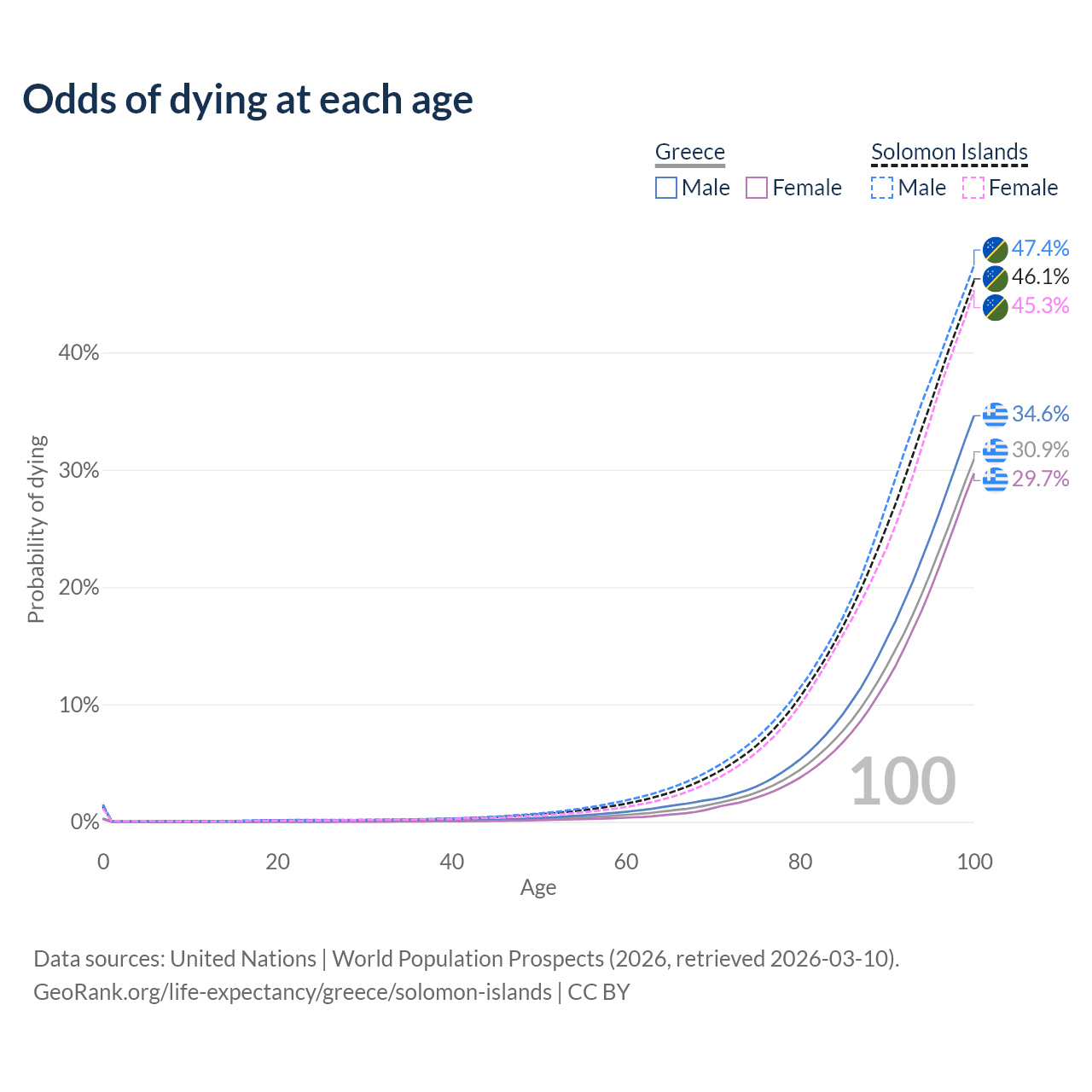 This life expectancy calculator shows the odds of living to 100, 95, 90, and below based on current age for both males and females in Greece and the Solomon Islands, along with mean and median age of death. The calculations are based on the 2026 life tables (actuarial tables) from the UN World Population Prospects.