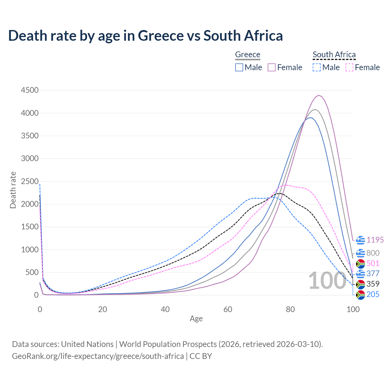 In Greece, the most common age of death is 88, compared to 77 in South Africa. The median age of death is 84.9 in Greece and 70.8 in South Africa, meaning only half of each cohort is expected to live past that age.