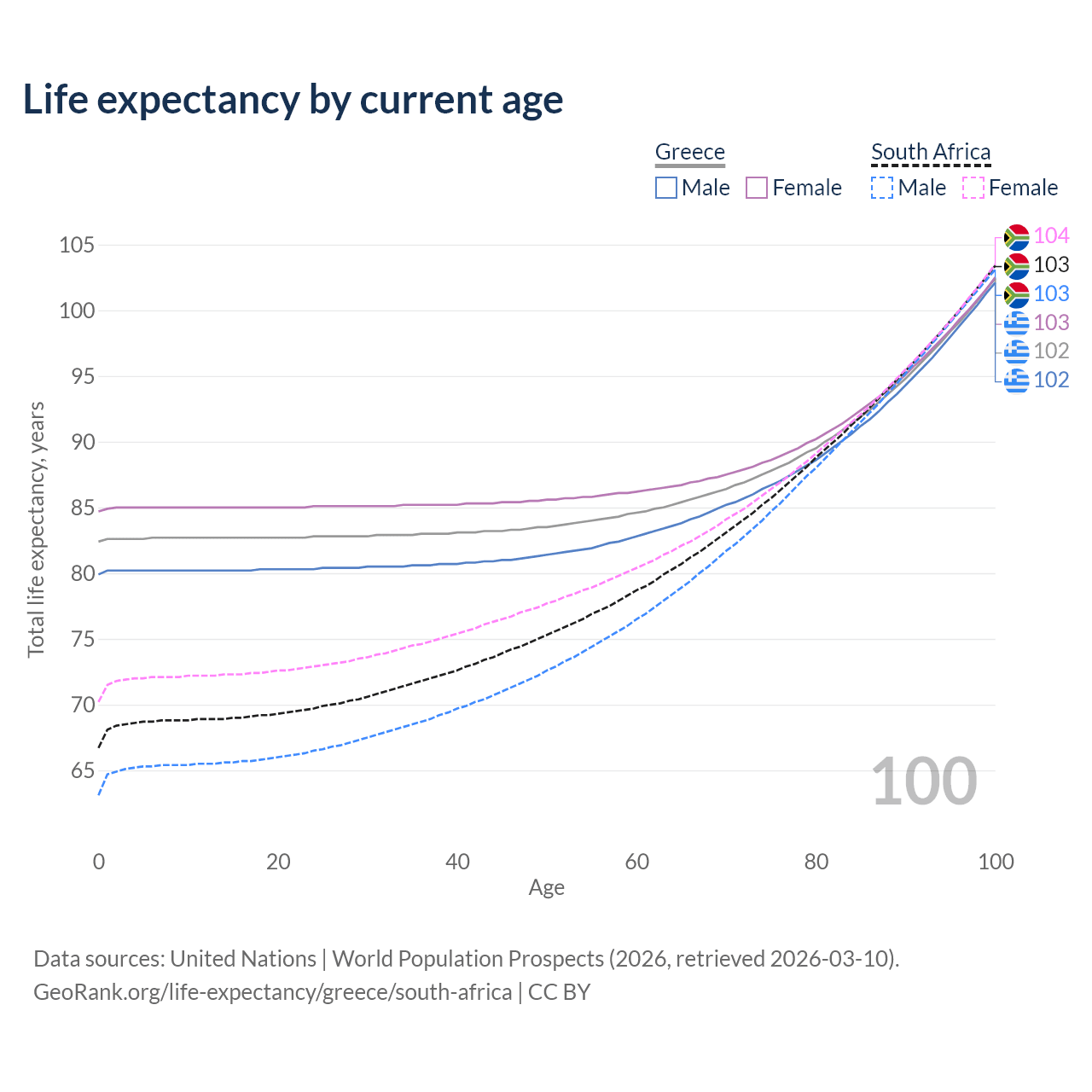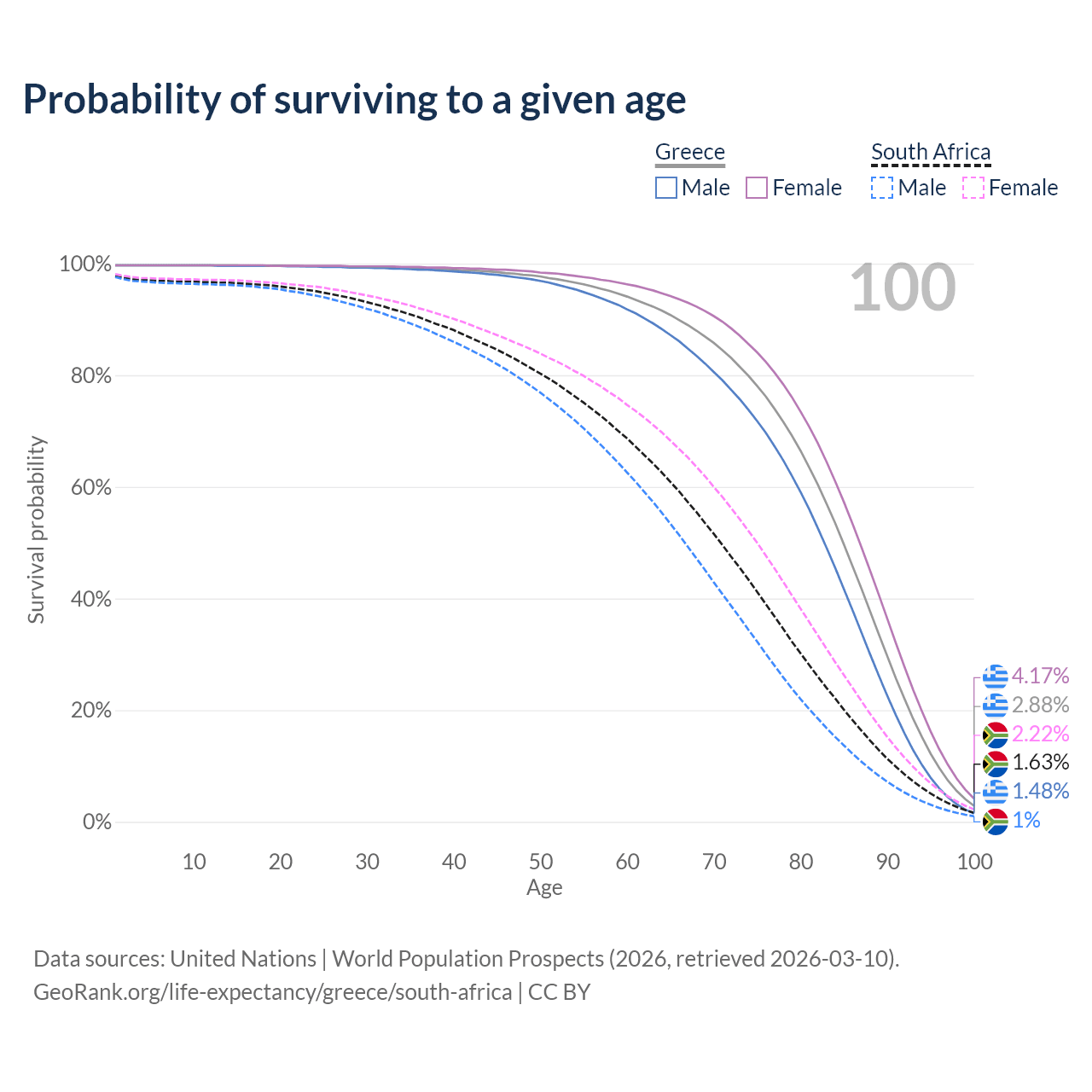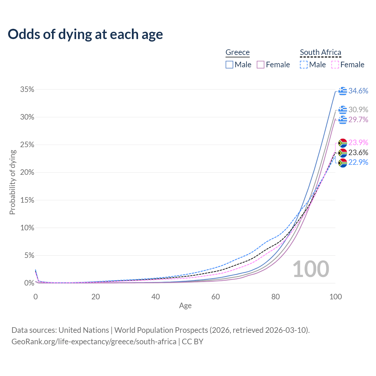 This life expectancy calculator shows the odds of living to 100, 95, 90, and below based on current age for both males and females in Greece and South Africa, along with mean and median age of death. The calculations are based on the 2026 life tables (actuarial tables) from the UN World Population Prospects.