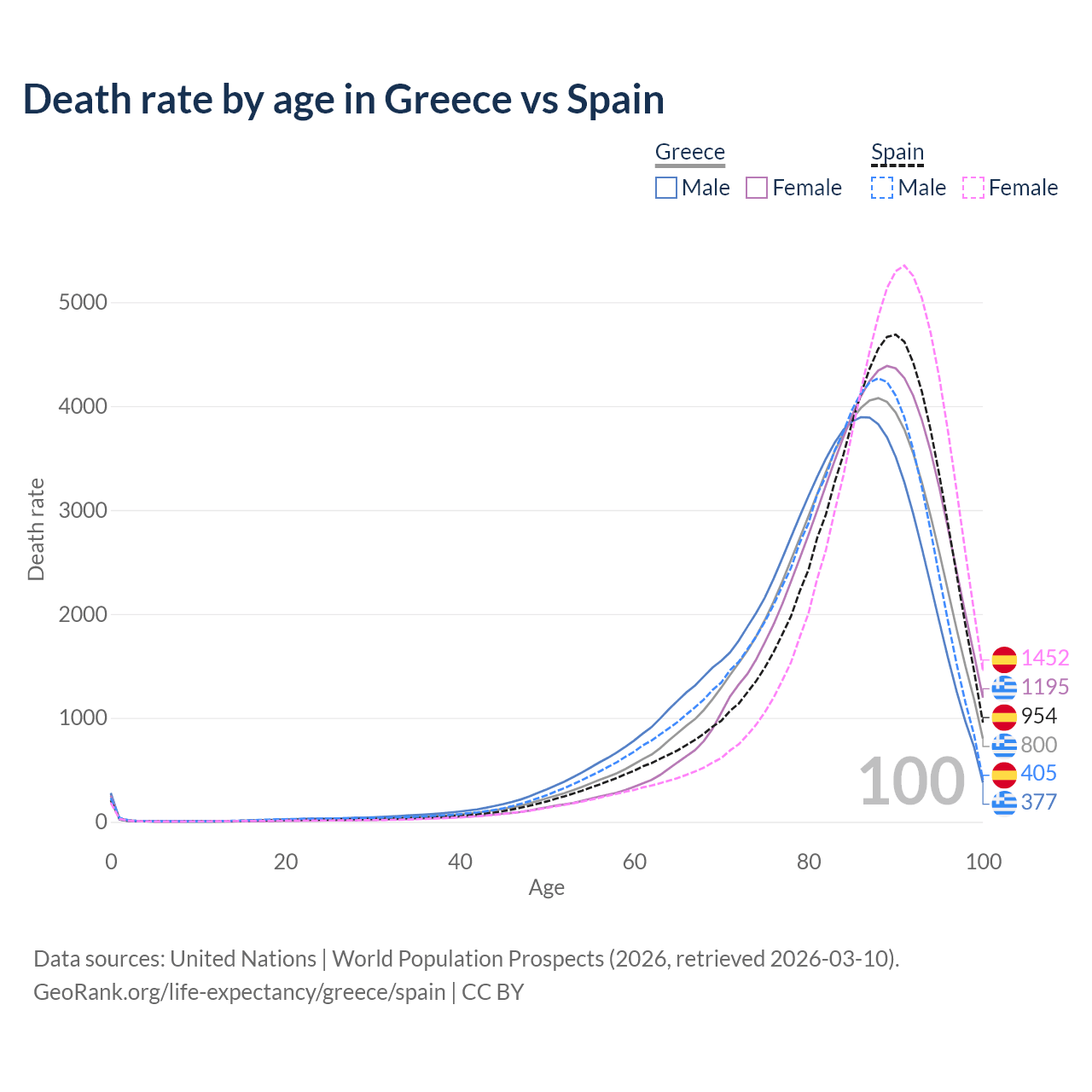 In Greece, the most common age of death is 88, compared to 90 in Spain. The median age of death is 84.9 in Greece and 87 in Spain, meaning only half of each cohort is expected to live past that age.