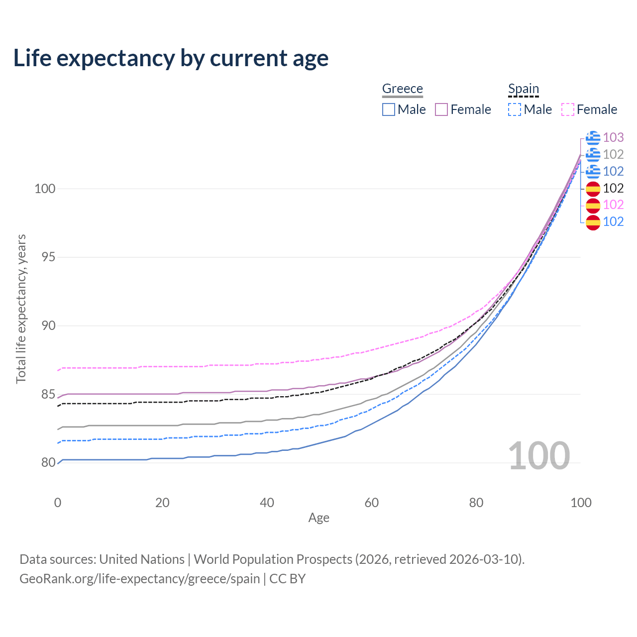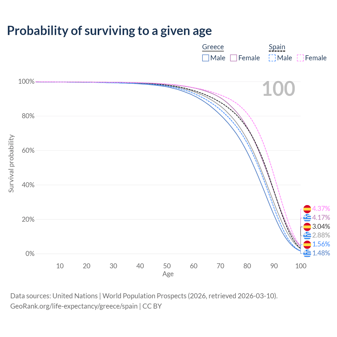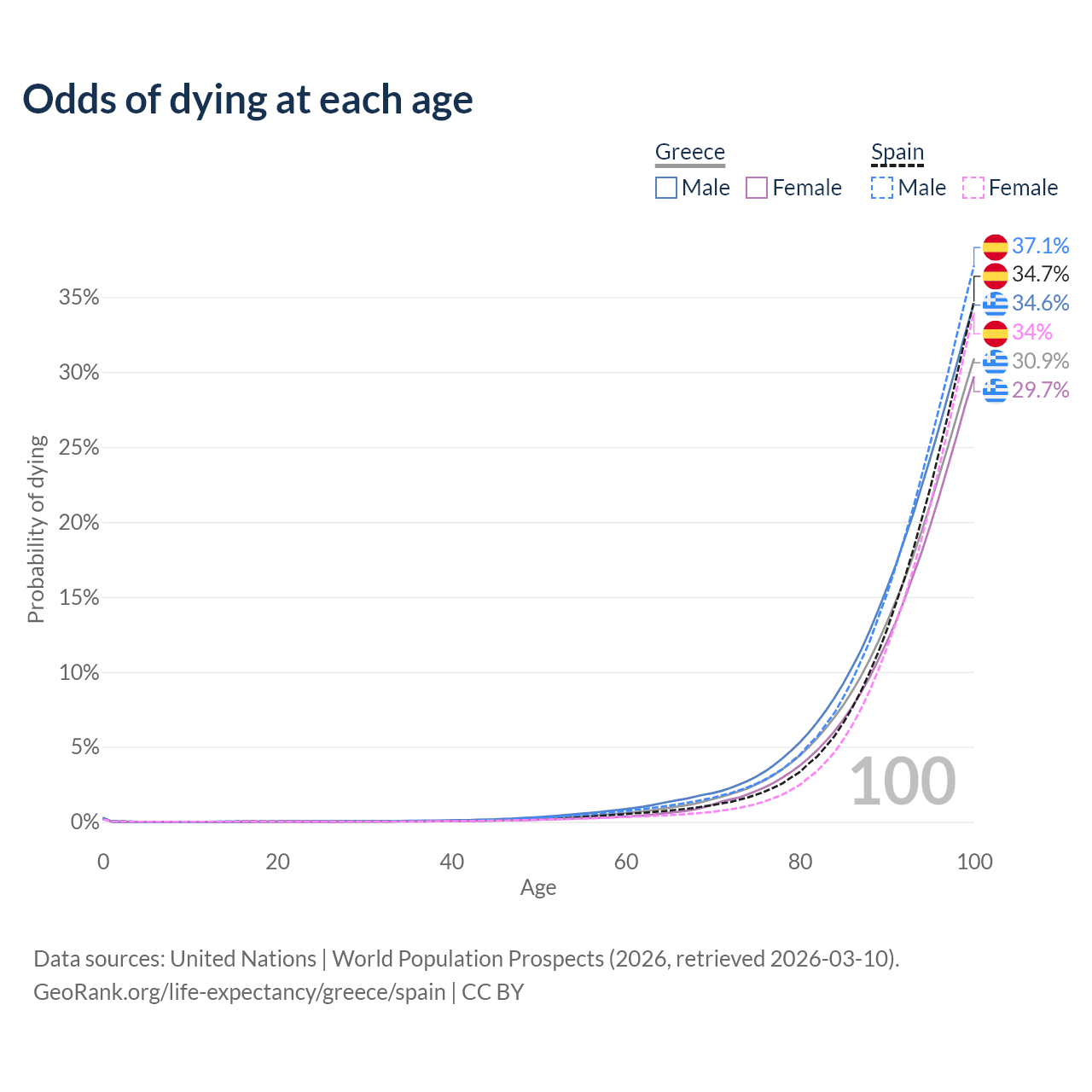 This life expectancy calculator shows the odds of living to 100, 95, 90, and below based on current age for both males and females in Greece and Spain, along with mean and median age of death. The calculations are based on the 2026 life tables (actuarial tables) from the UN World Population Prospects.