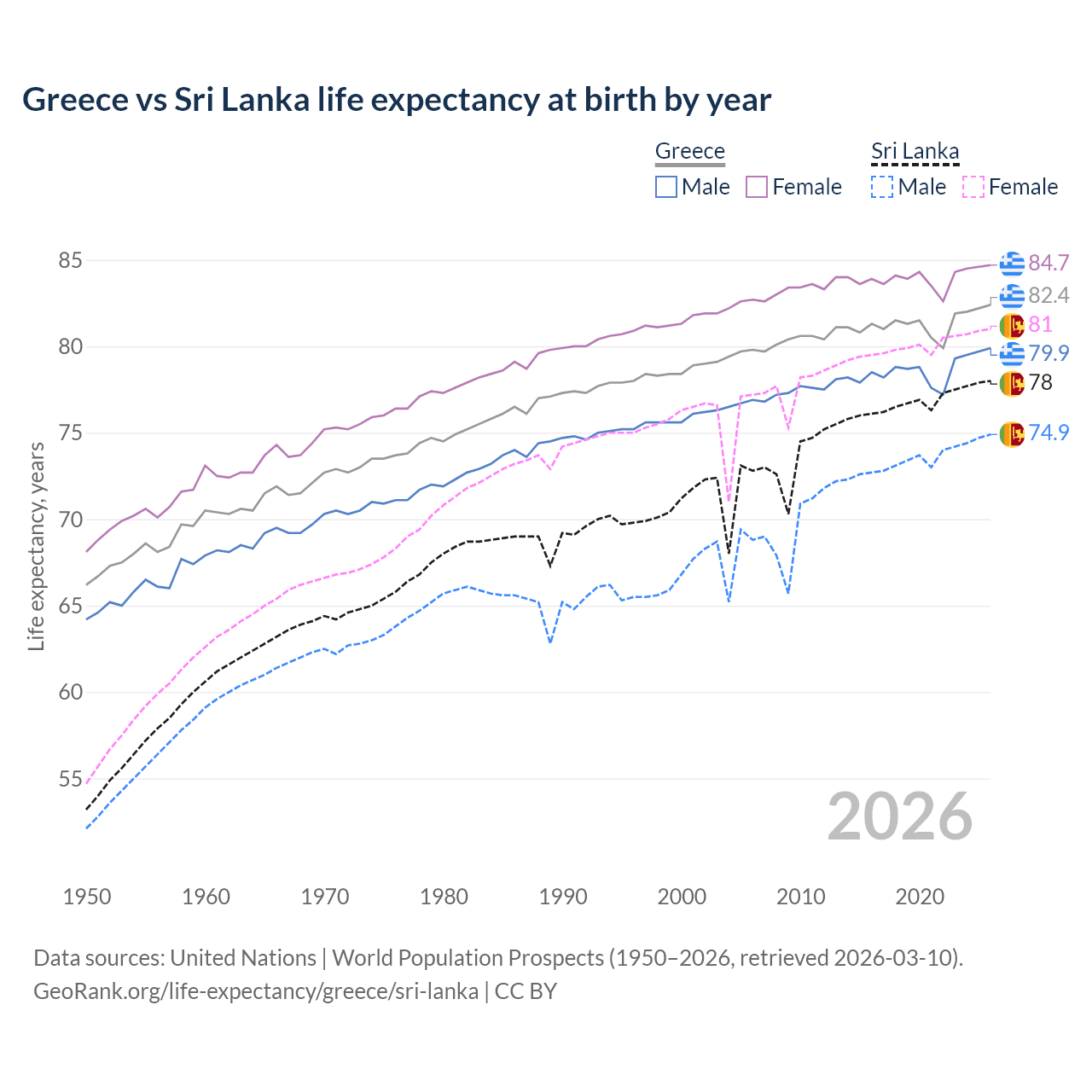 The average life expectancy at birth is 82.4 years in Greece vs 78 in Sri Lanka. Greece is ranked 30/197 by life expectancy, and Sri Lanka is 64/197. In Greece, the life expectancy is 79.9 years for males and 84.7 years for females. In Sri Lanka, it's 74.9 years for males and 81 years for females.