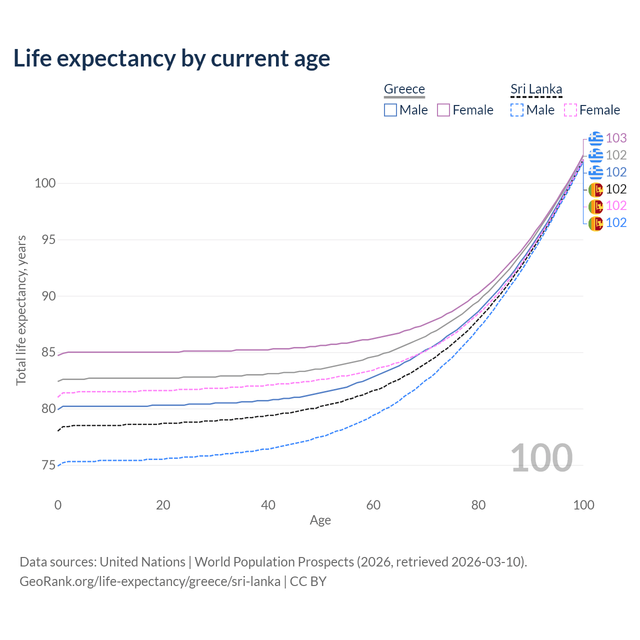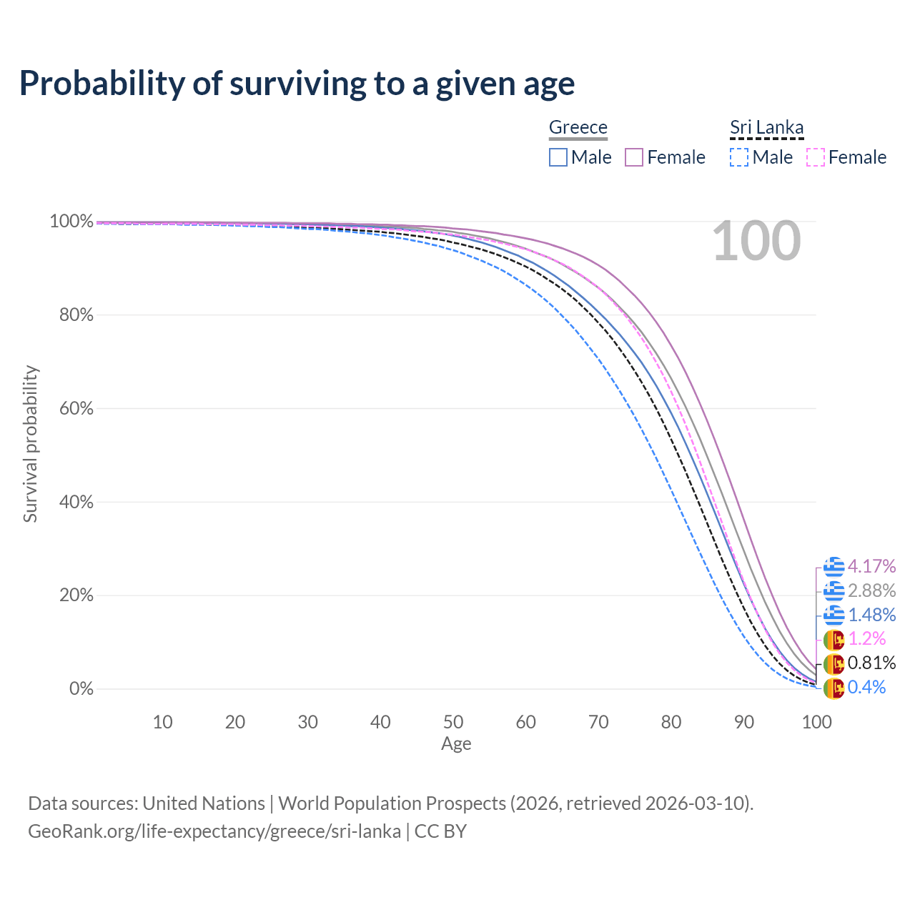 This life expectancy calculator shows the odds of living to 100, 95, 90, and below based on current age for both males and females in Greece and Sri Lanka, along with mean and median age of death. The calculations are based on the 2026 life tables (actuarial tables) from the UN World Population Prospects.