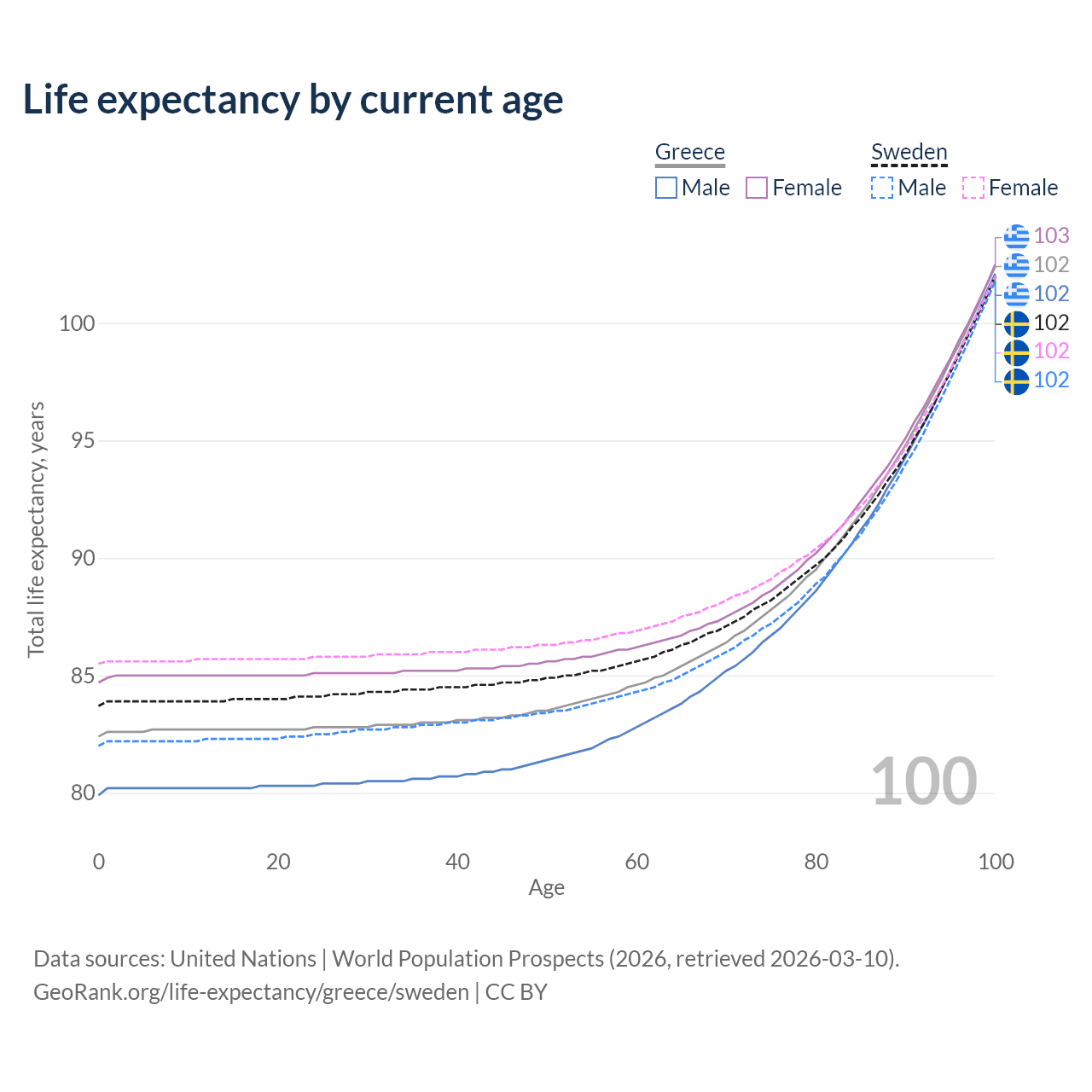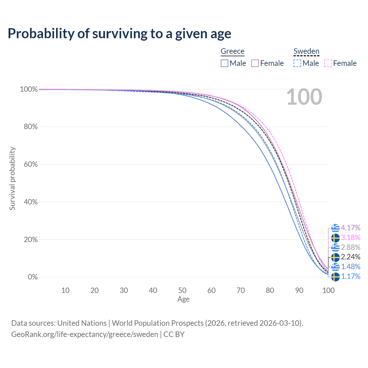 This life expectancy calculator shows the odds of living to 100, 95, 90, and below based on current age for both males and females in Greece and Sweden, along with mean and median age of death. The calculations are based on the 2026 life tables (actuarial tables) from the UN World Population Prospects.
