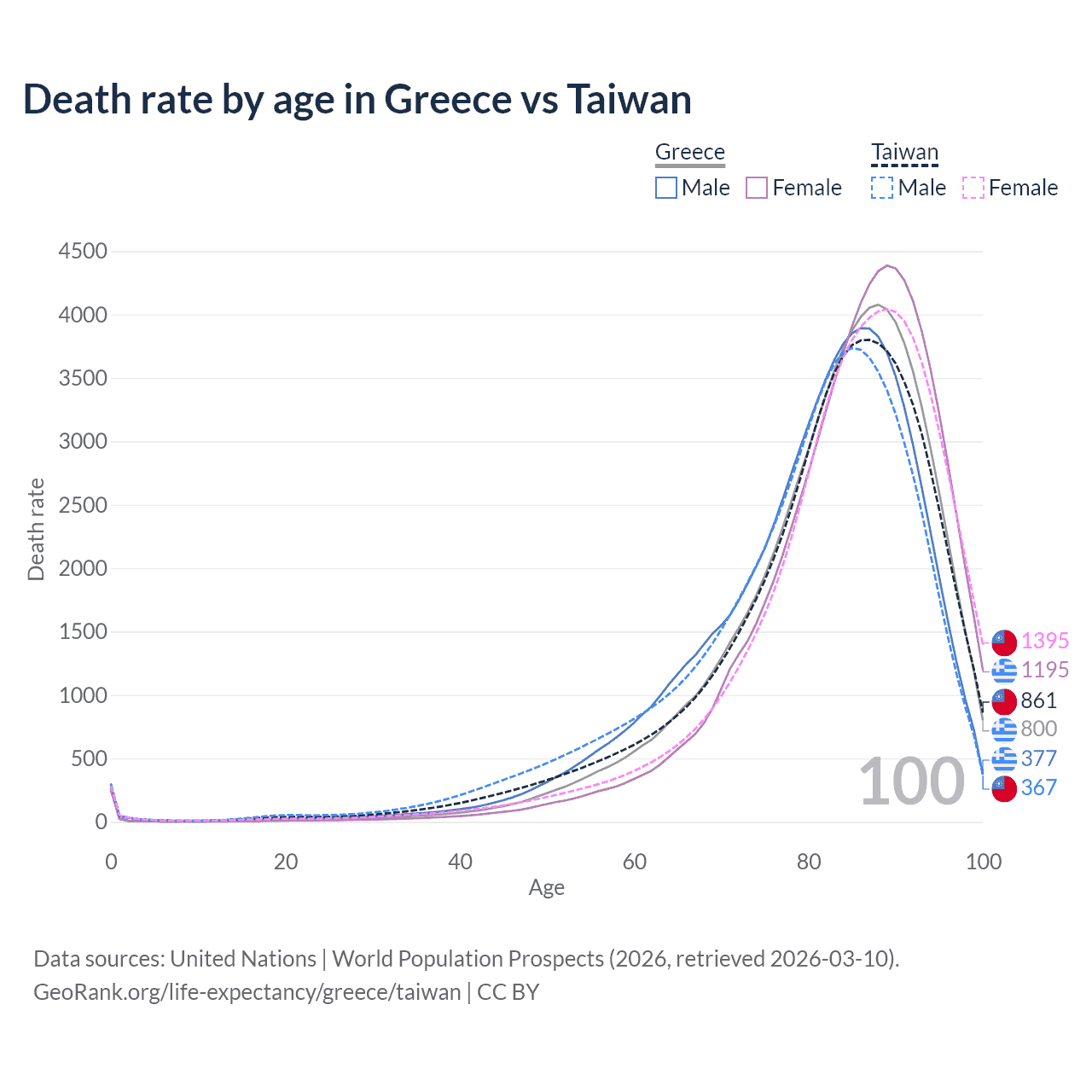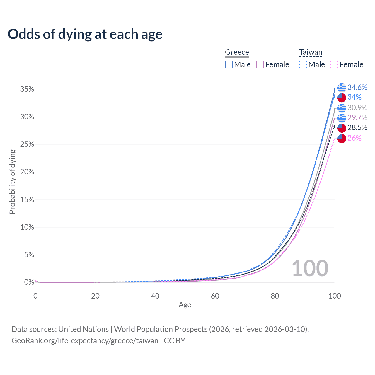 This life expectancy calculator shows the odds of living to 100, 95, 90, and below based on current age for both males and females in Greece and Taiwan, along with mean and median age of death. The calculations are based on the 2026 life tables (actuarial tables) from the UN World Population Prospects.