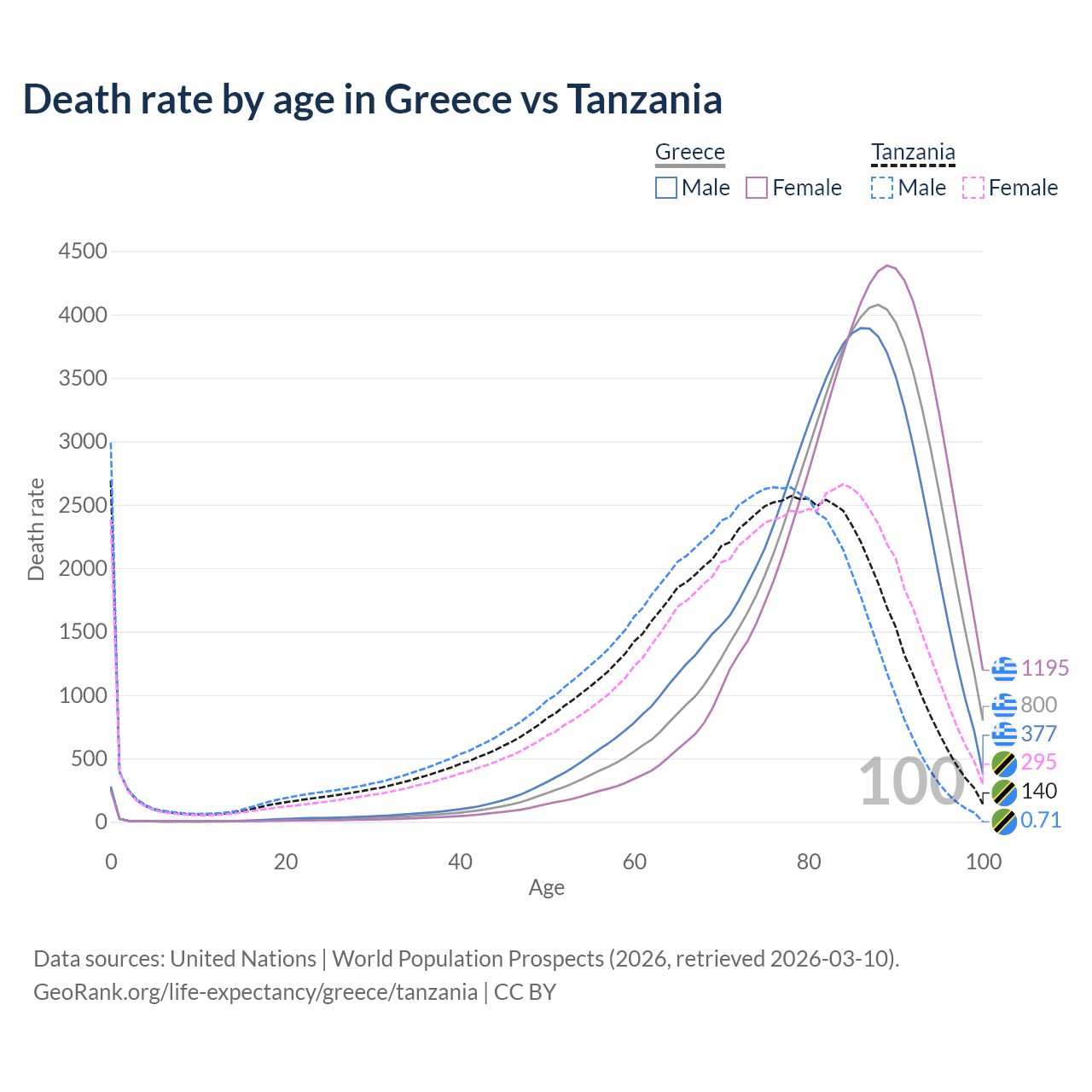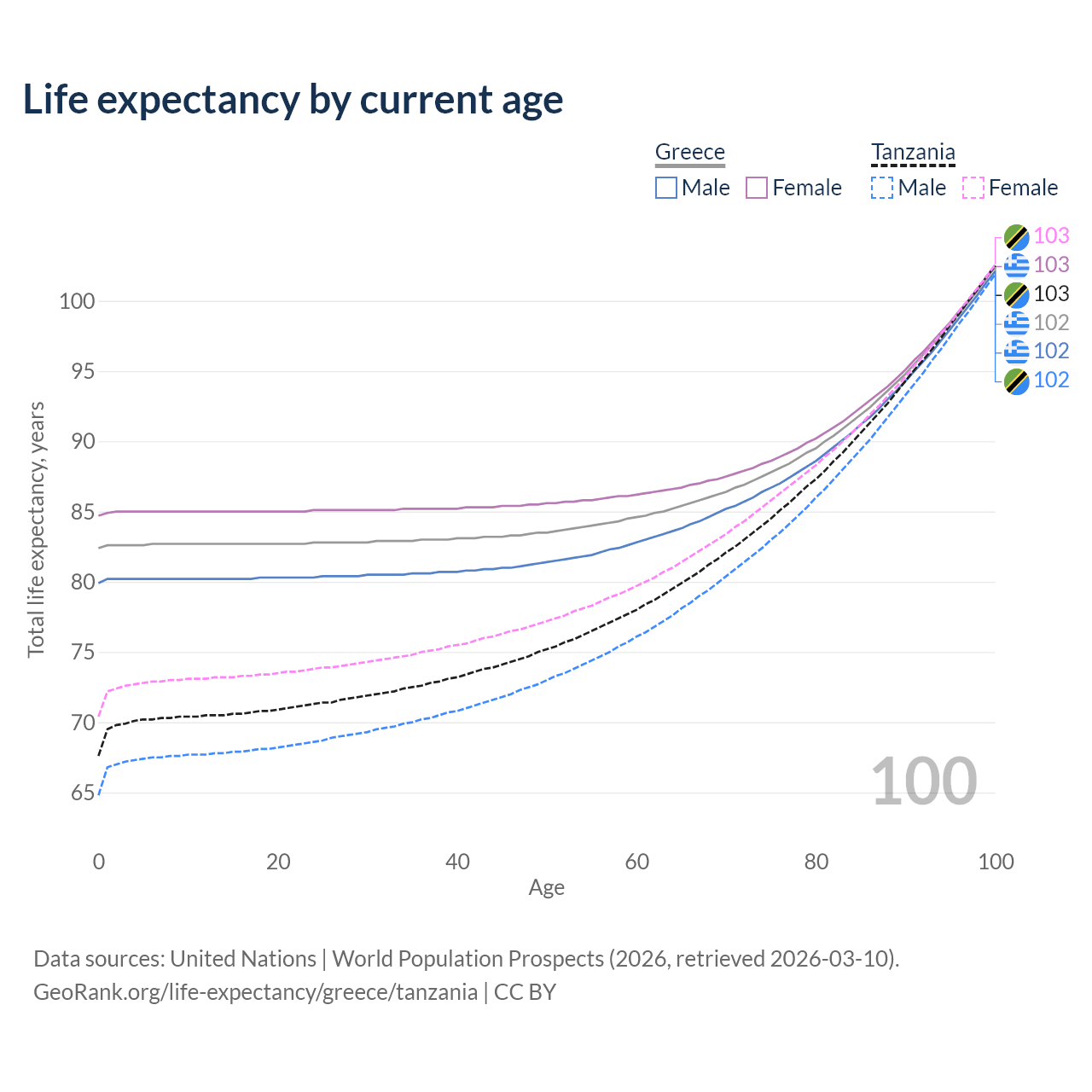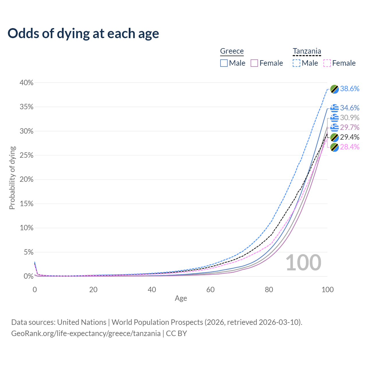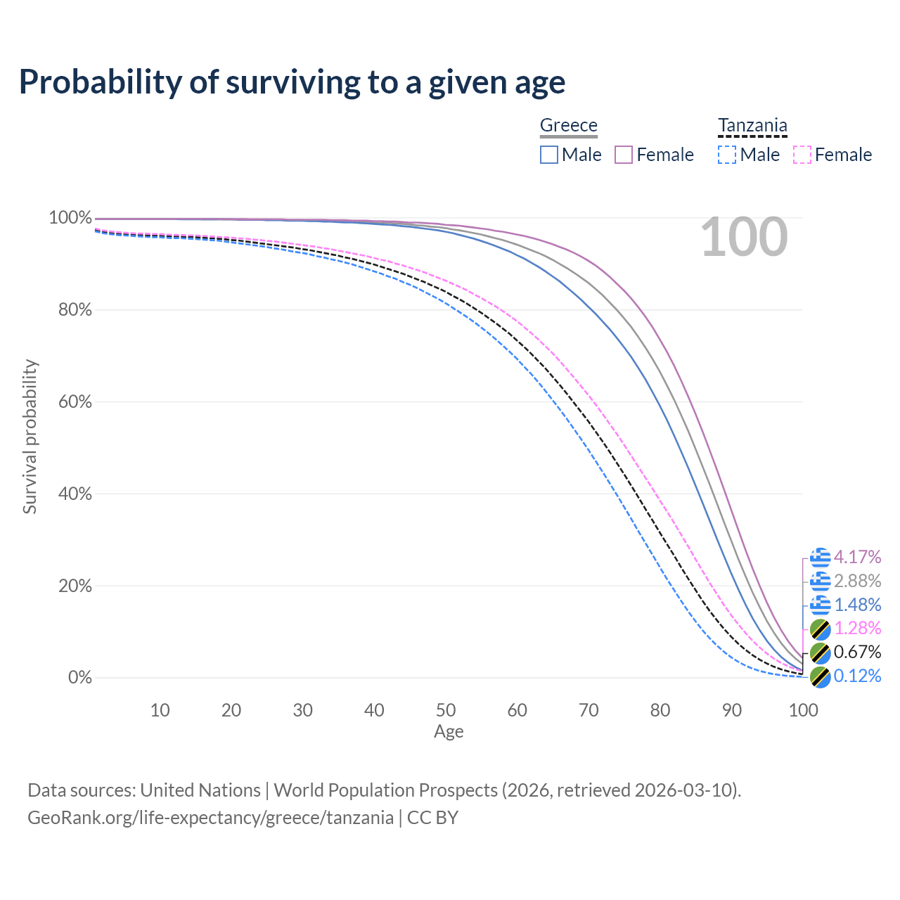 This life expectancy calculator shows the odds of living to 100, 95, 90, and below based on current age for both males and females in Greece and Tanzania, along with mean and median age of death. The calculations are based on the 2026 life tables (actuarial tables) from the UN World Population Prospects.