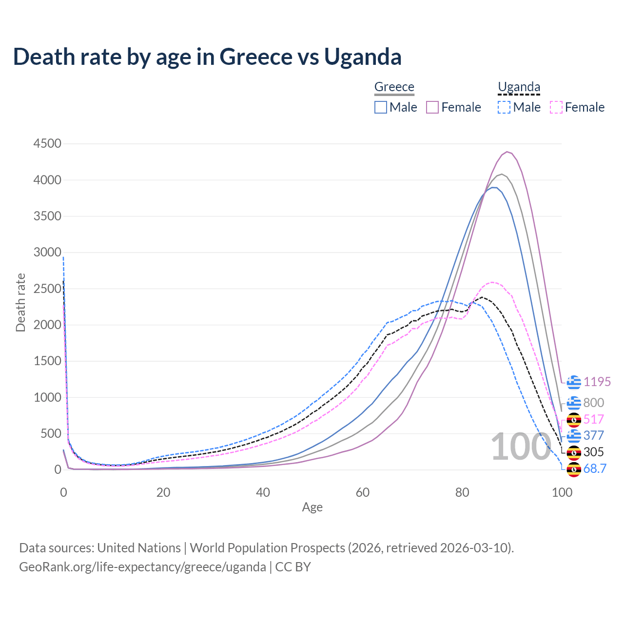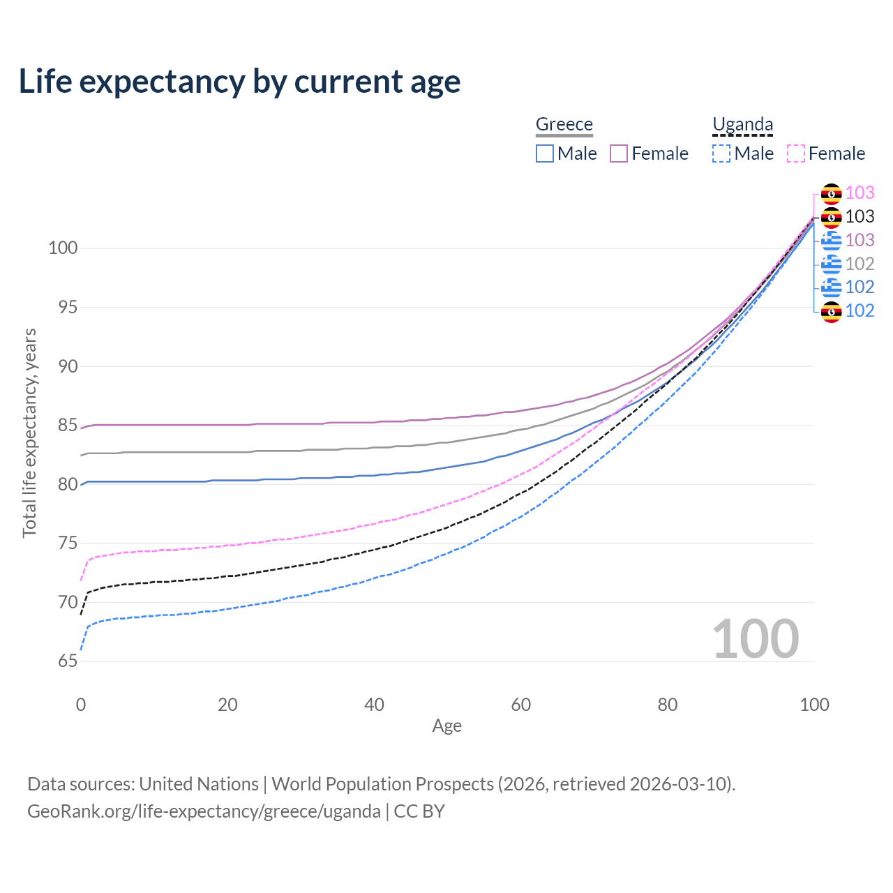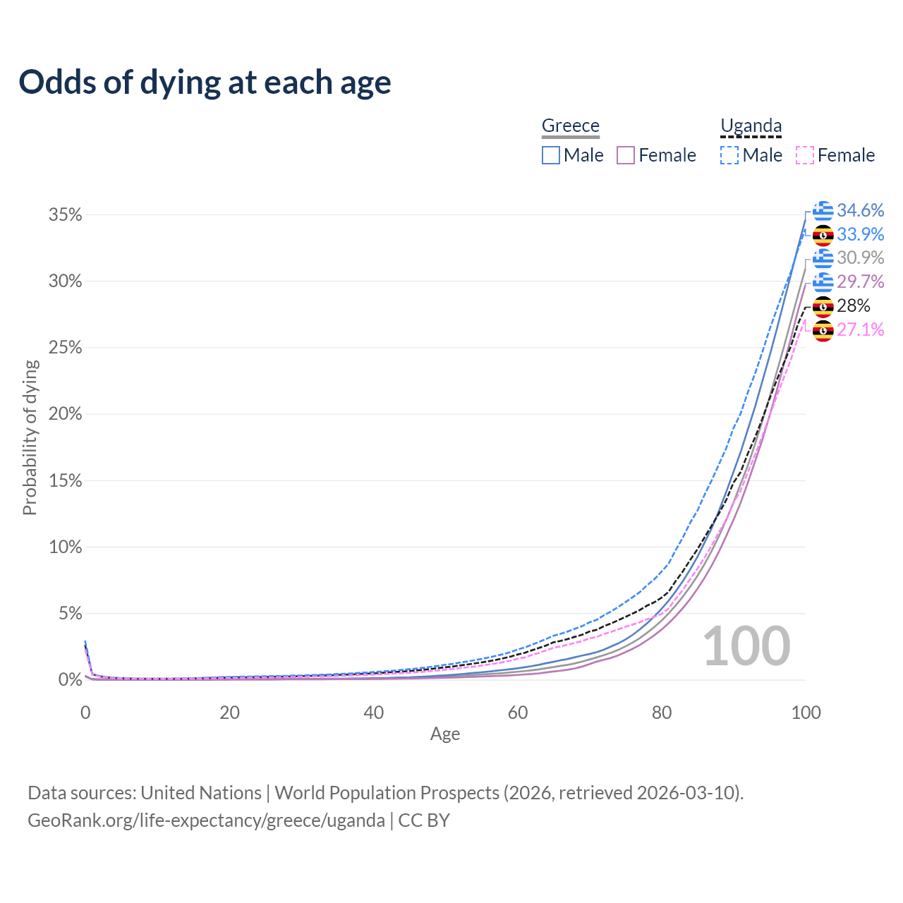 This life expectancy calculator shows the odds of living to 100, 95, 90, and below based on current age for both males and females in Greece and Uganda, along with mean and median age of death. The calculations are based on the 2026 life tables (actuarial tables) from the UN World Population Prospects.