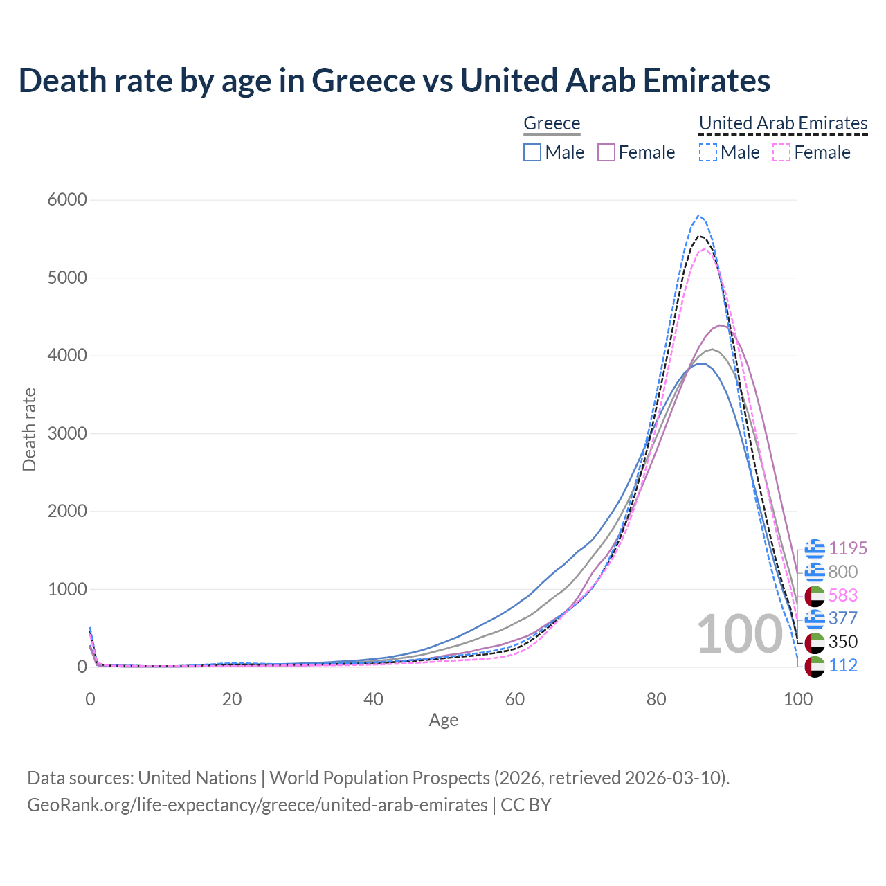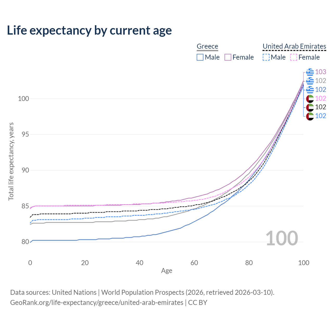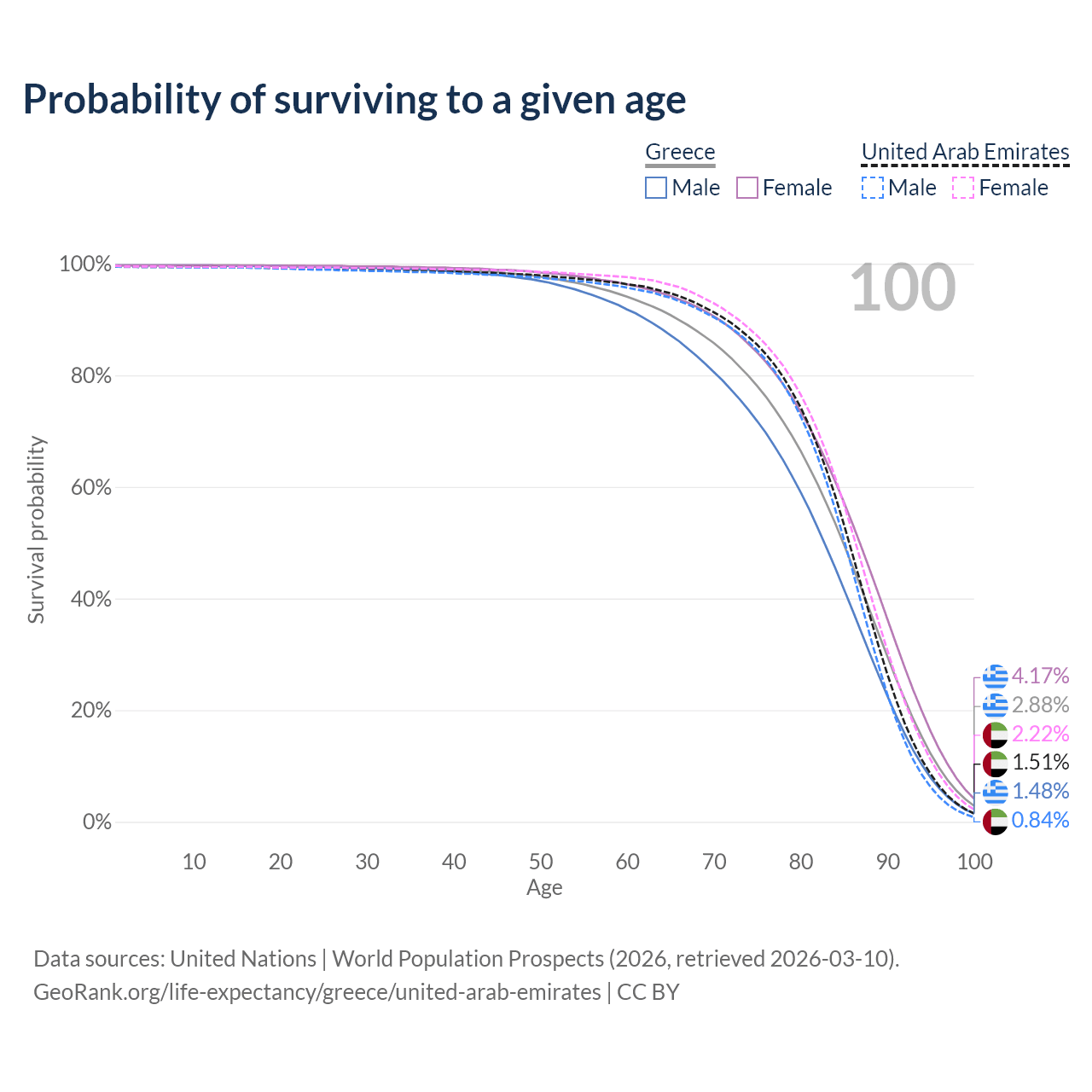 This life expectancy calculator shows the odds of living to 100, 95, 90, and below based on current age for both males and females in Greece and the United Arab Emirates, along with mean and median age of death. The calculations are based on the 2026 life tables (actuarial tables) from the UN World Population Prospects.