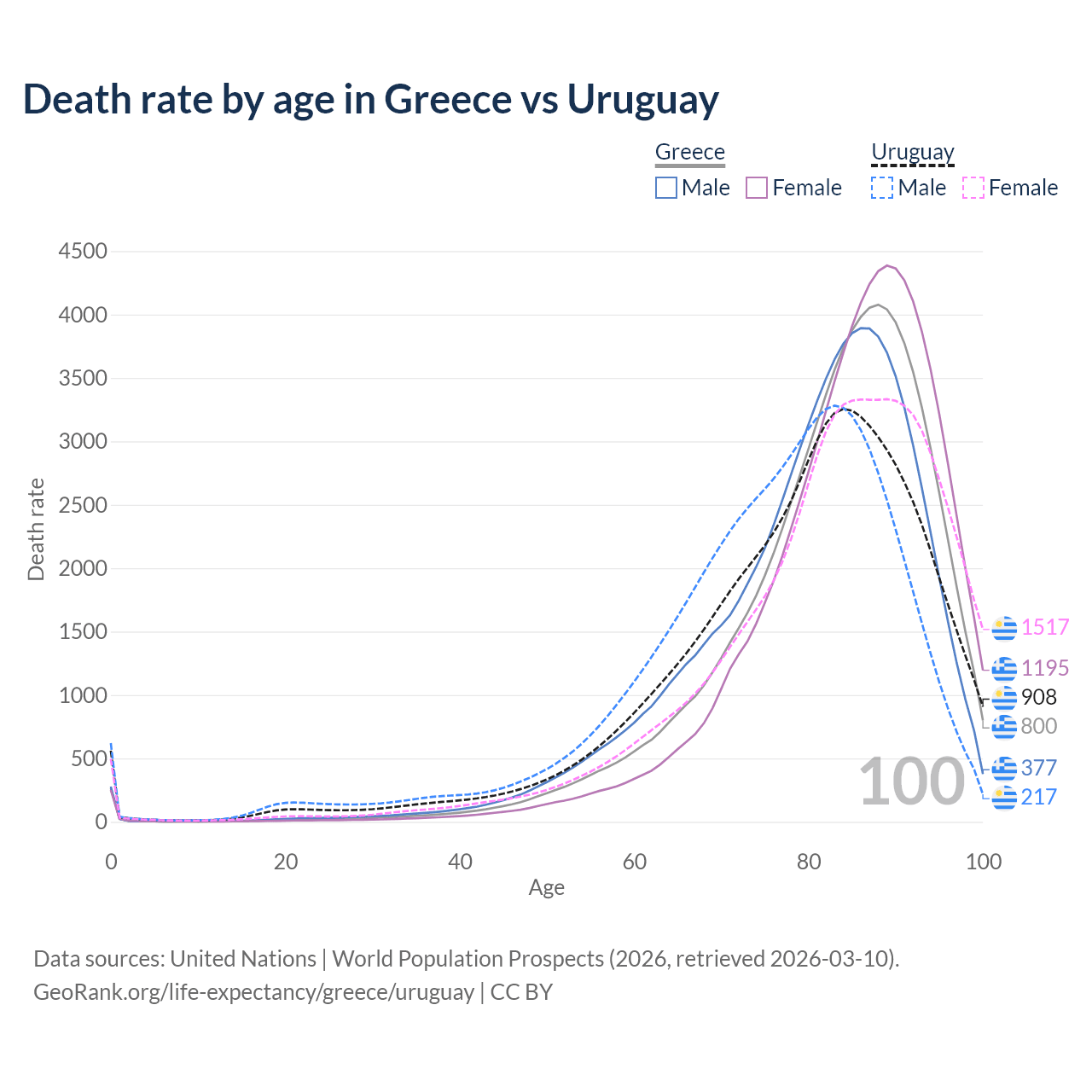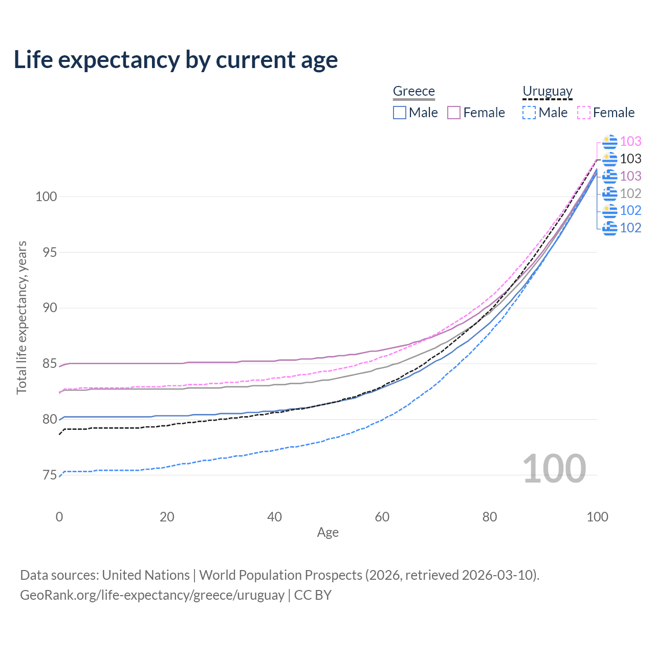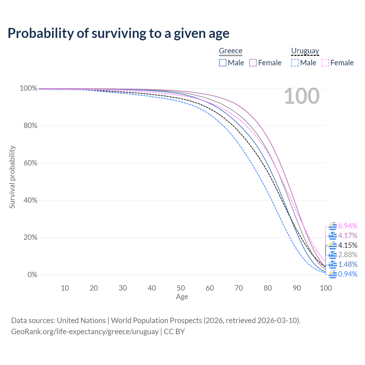 This life expectancy calculator shows the odds of living to 100, 95, 90, and below based on current age for both males and females in Greece and Uruguay, along with mean and median age of death. The calculations are based on the 2026 life tables (actuarial tables) from the UN World Population Prospects.