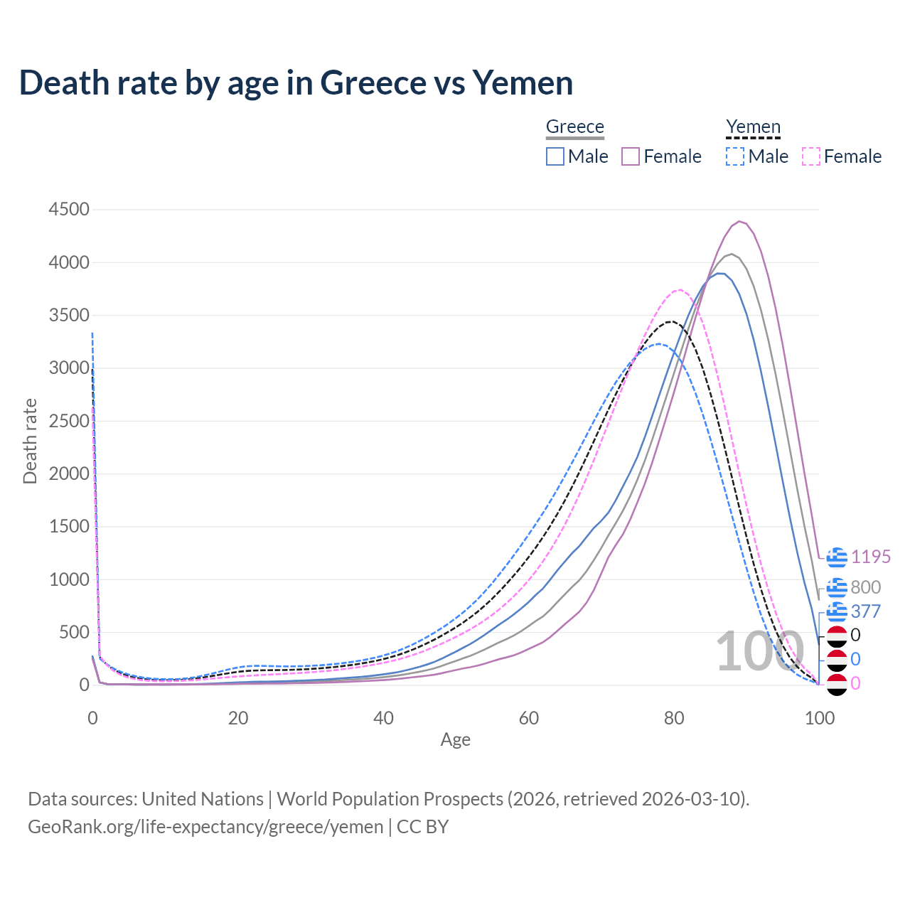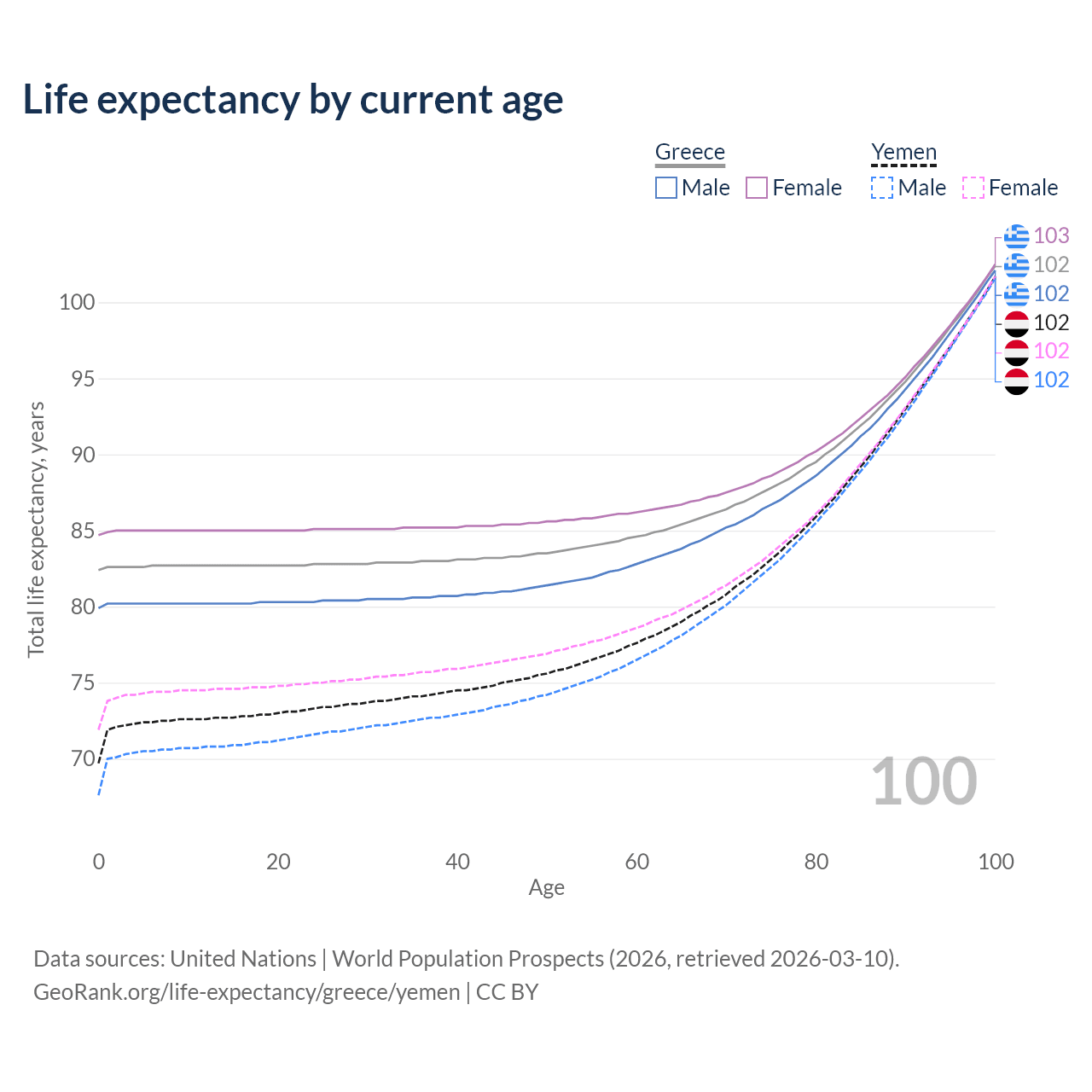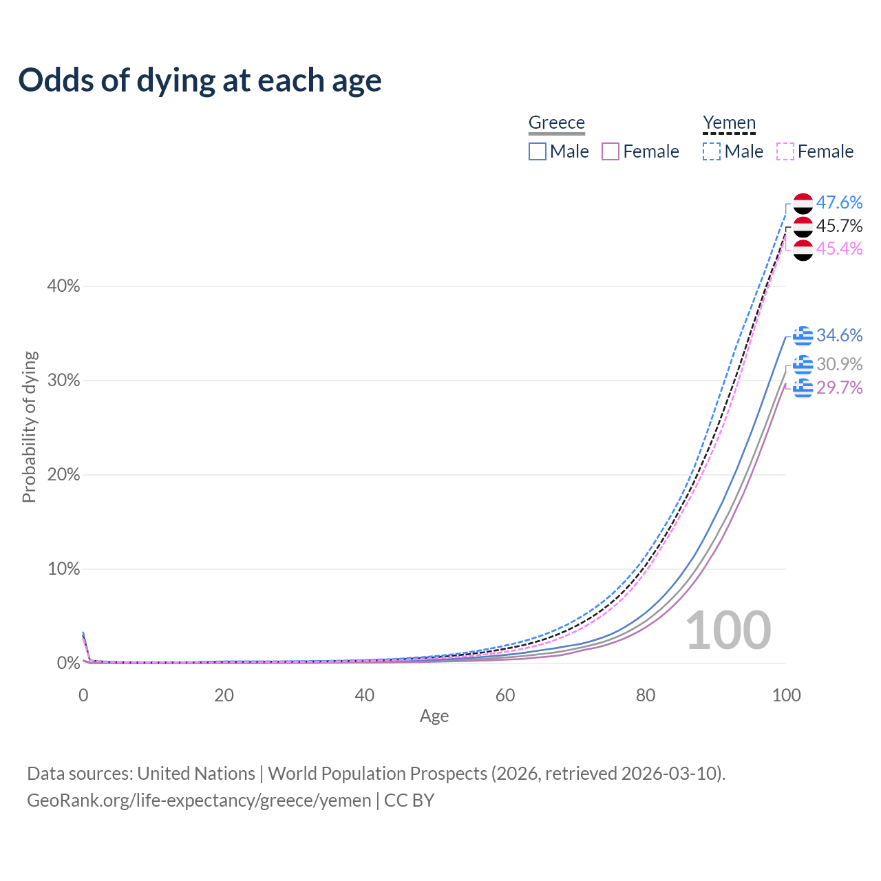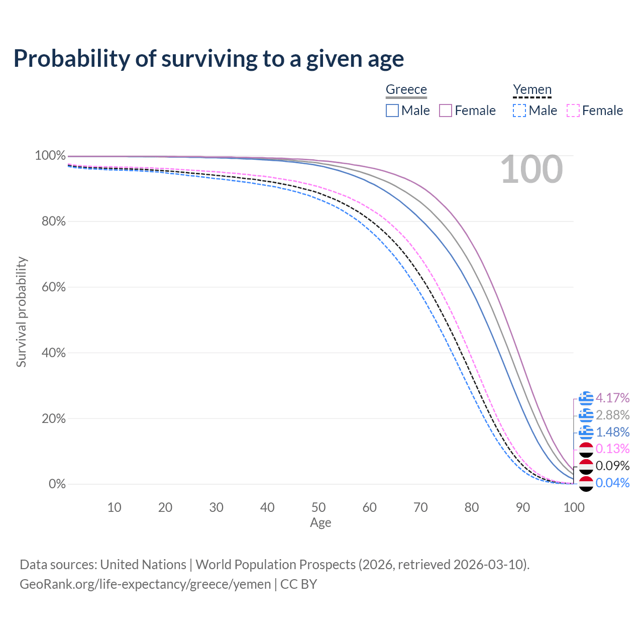 This life expectancy calculator shows the odds of living to 100, 95, 90, and below based on current age for both males and females in Greece and Yemen, along with mean and median age of death. The calculations are based on the 2026 life tables (actuarial tables) from the UN World Population Prospects.