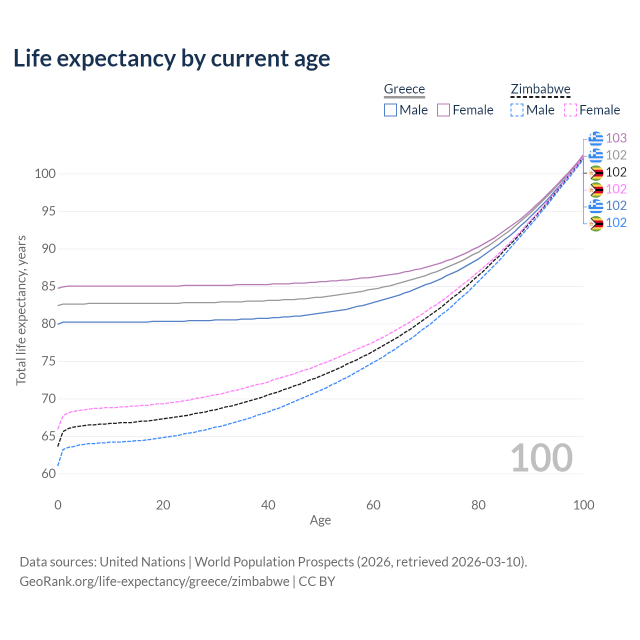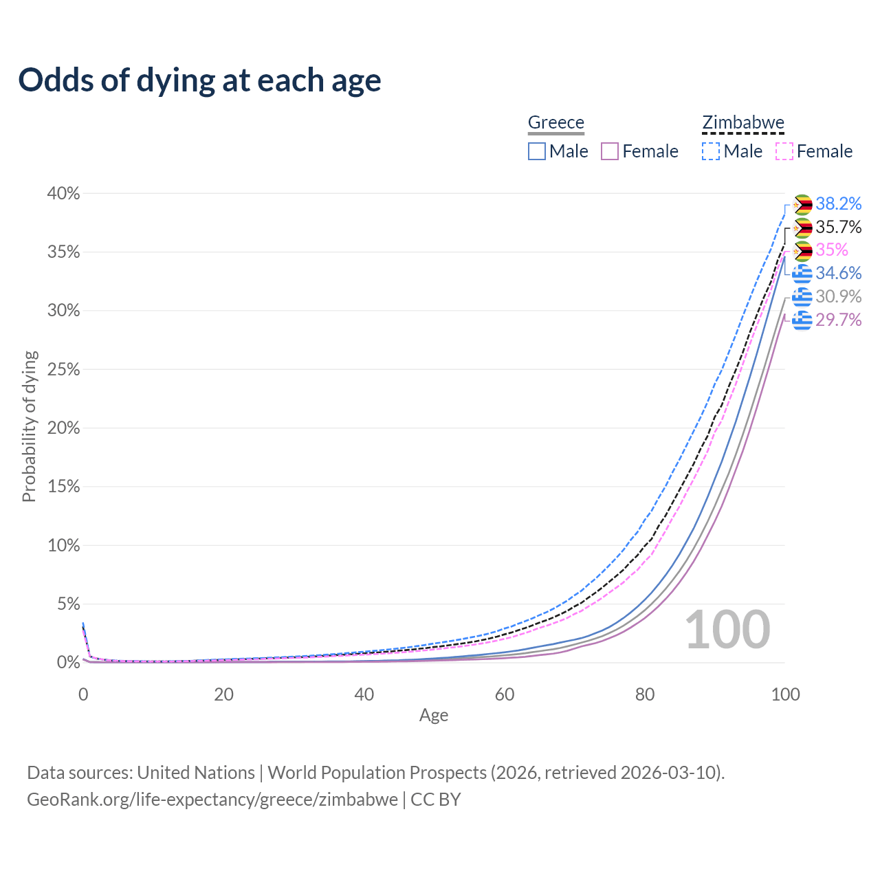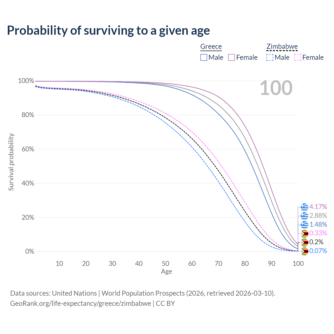 This life expectancy calculator shows the odds of living to 100, 95, 90, and below based on current age for both males and females in Greece and Zimbabwe, along with mean and median age of death. The calculations are based on the 2026 life tables (actuarial tables) from the UN World Population Prospects.
