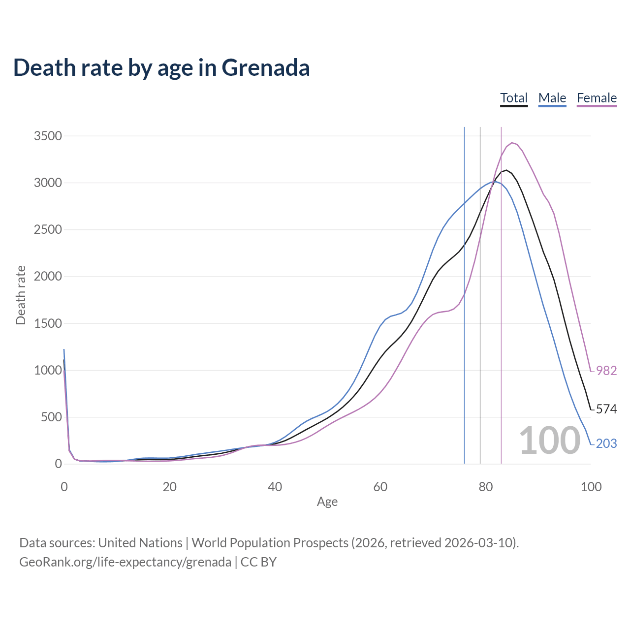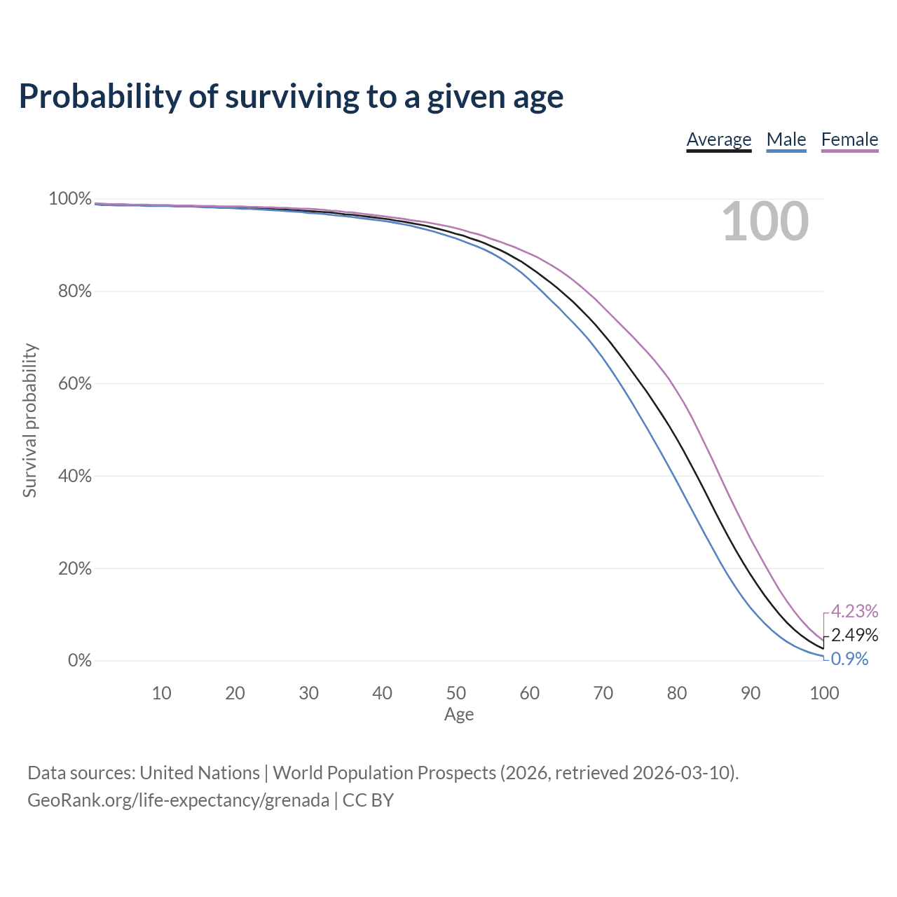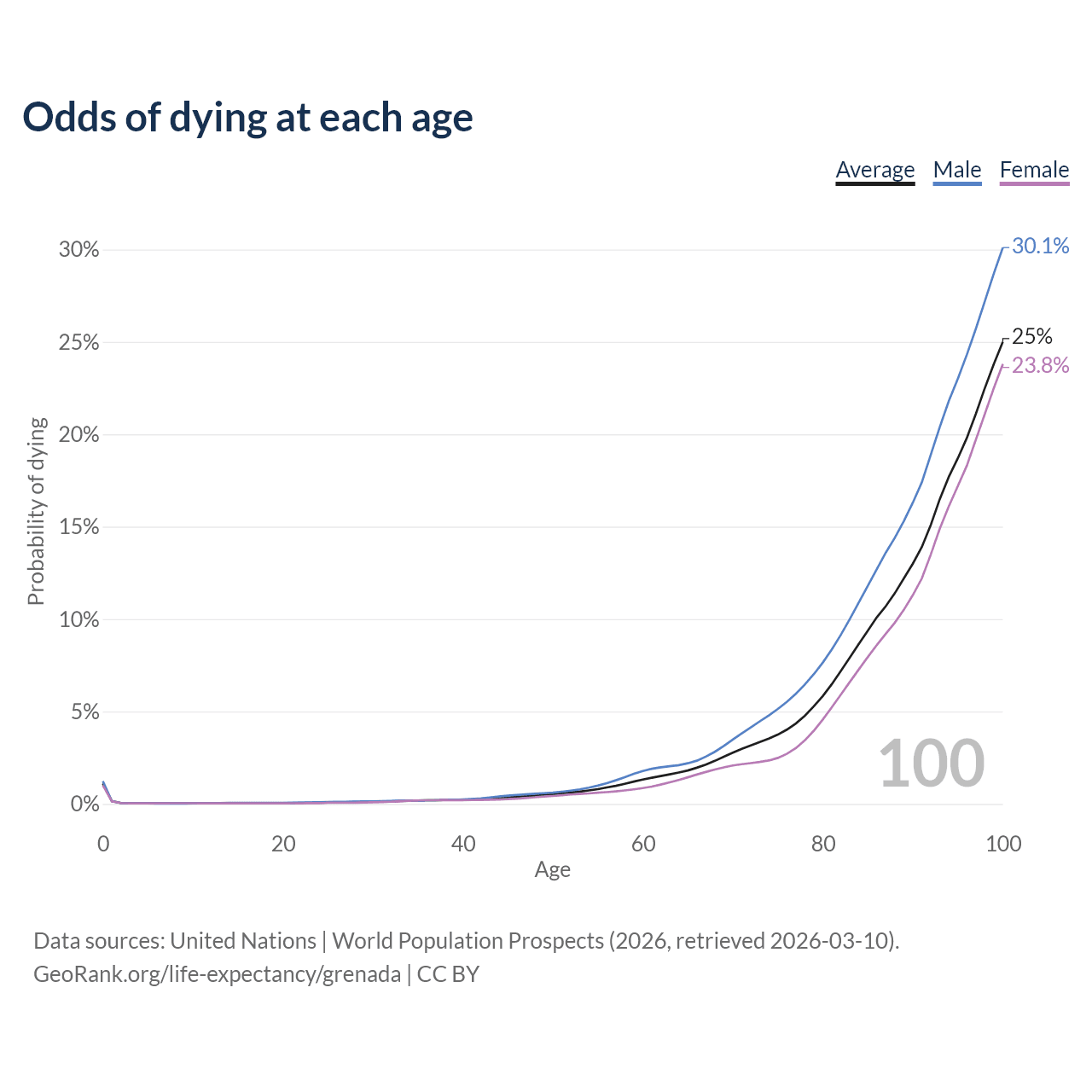 This life expectancy calculator shows the odds of living to 100, 95, 90, and below based on current age for both males and females in Grenada, along with mean and median age of death. The calculations are based on the 2026 life tables (actuarial tables) from the UN World Population Prospects.