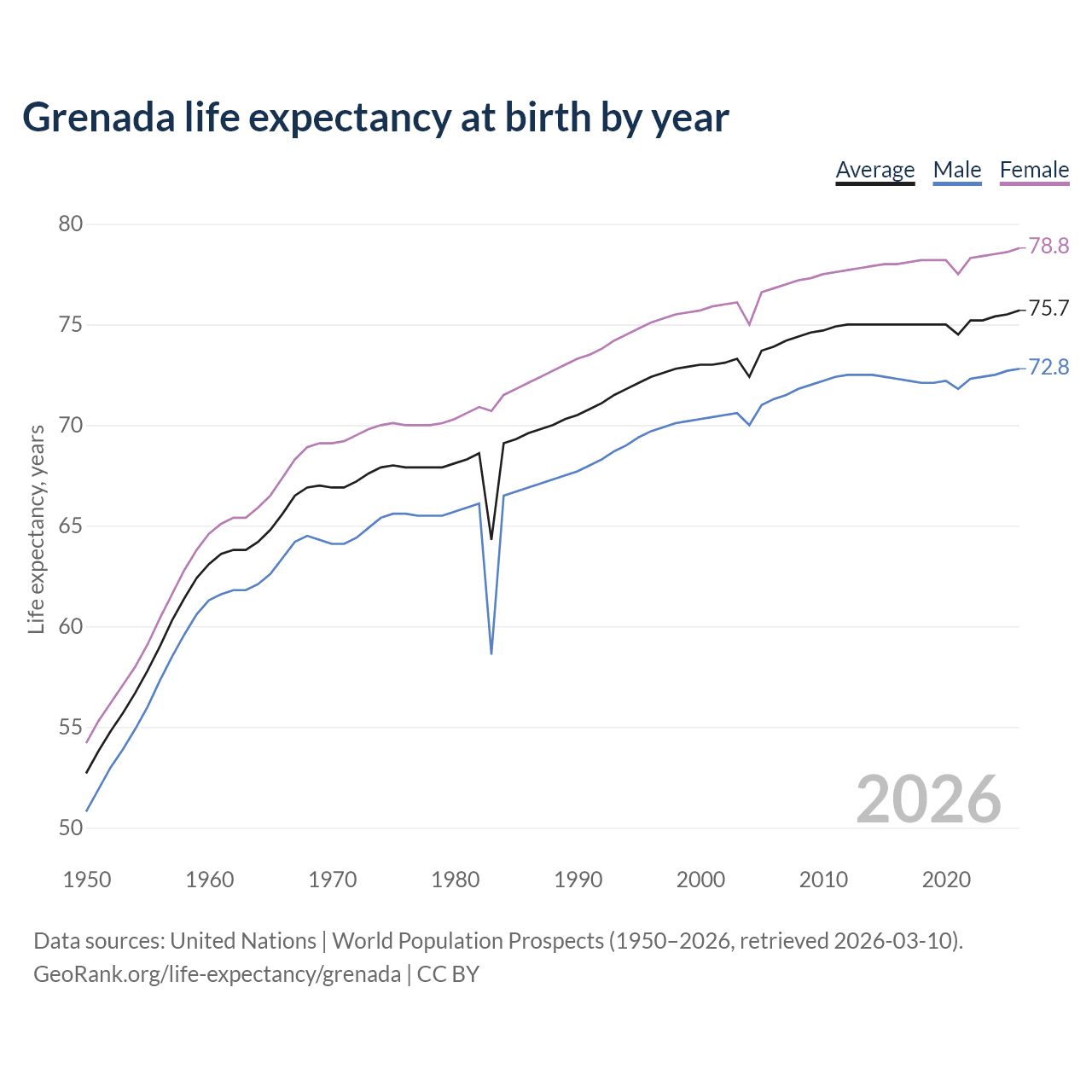 Grenada ranks 87/197 for average life expectancy at birth, with 72.8 years for males, 78.8 years for females, and 75.7 years for both sexes combined.