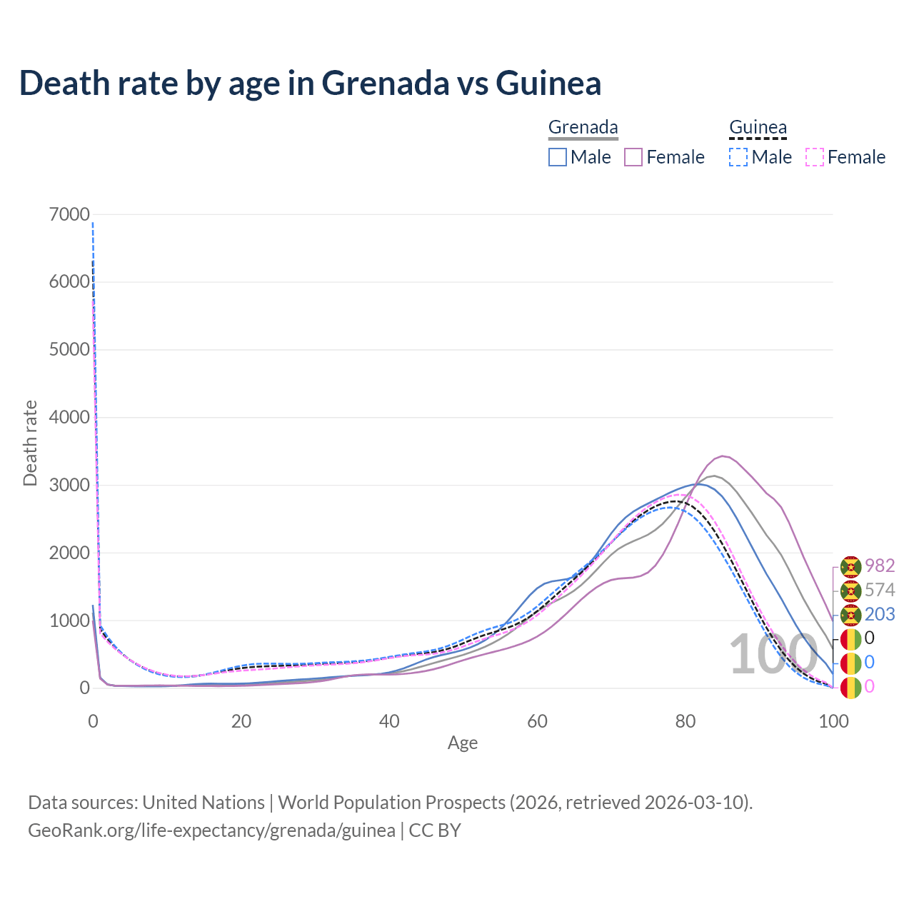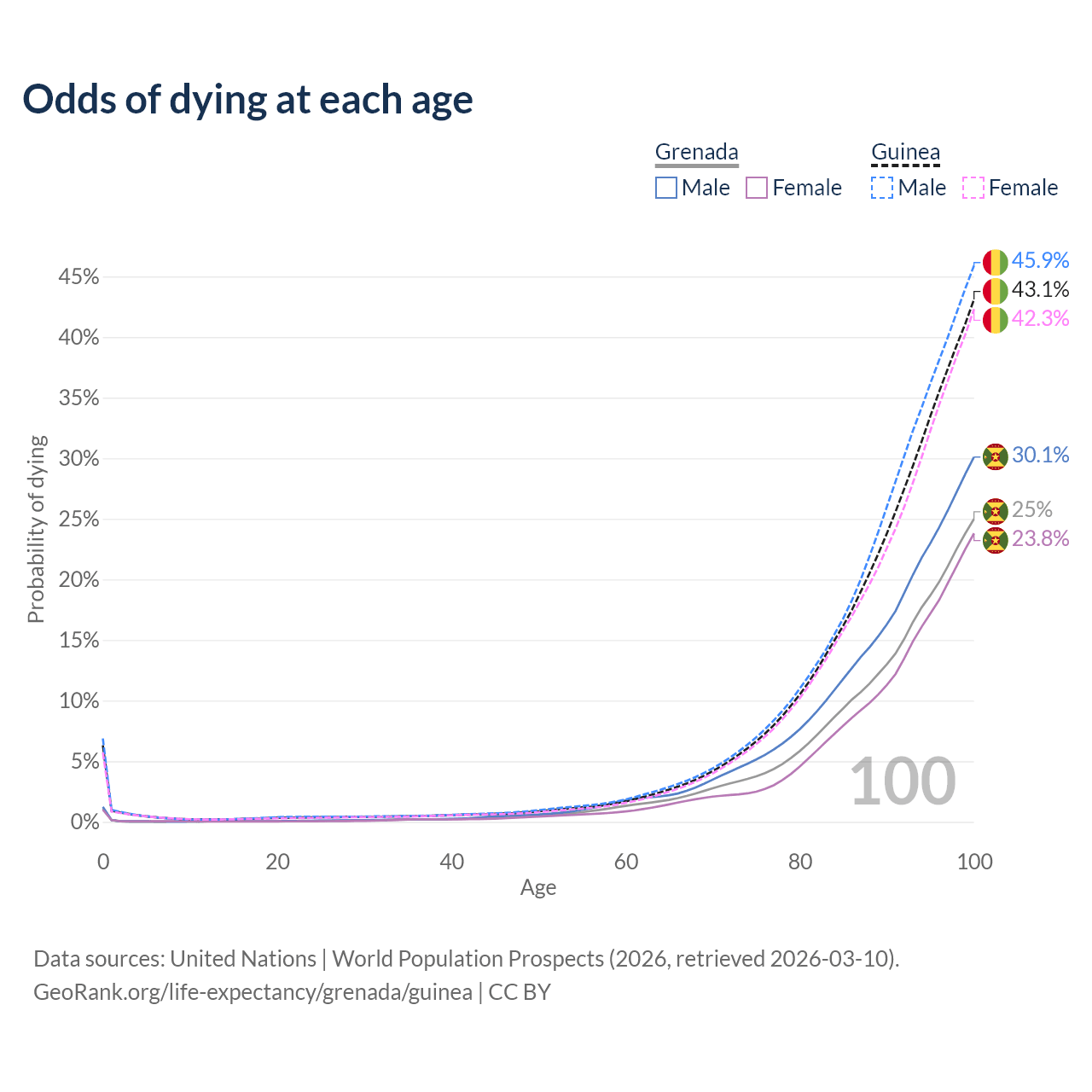 This life expectancy calculator shows the odds of living to 100, 95, 90, and below based on current age for both males and females in Grenada and Guinea, along with mean and median age of death. The calculations are based on the 2026 life tables (actuarial tables) from the UN World Population Prospects.