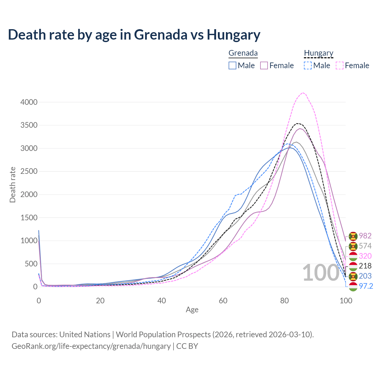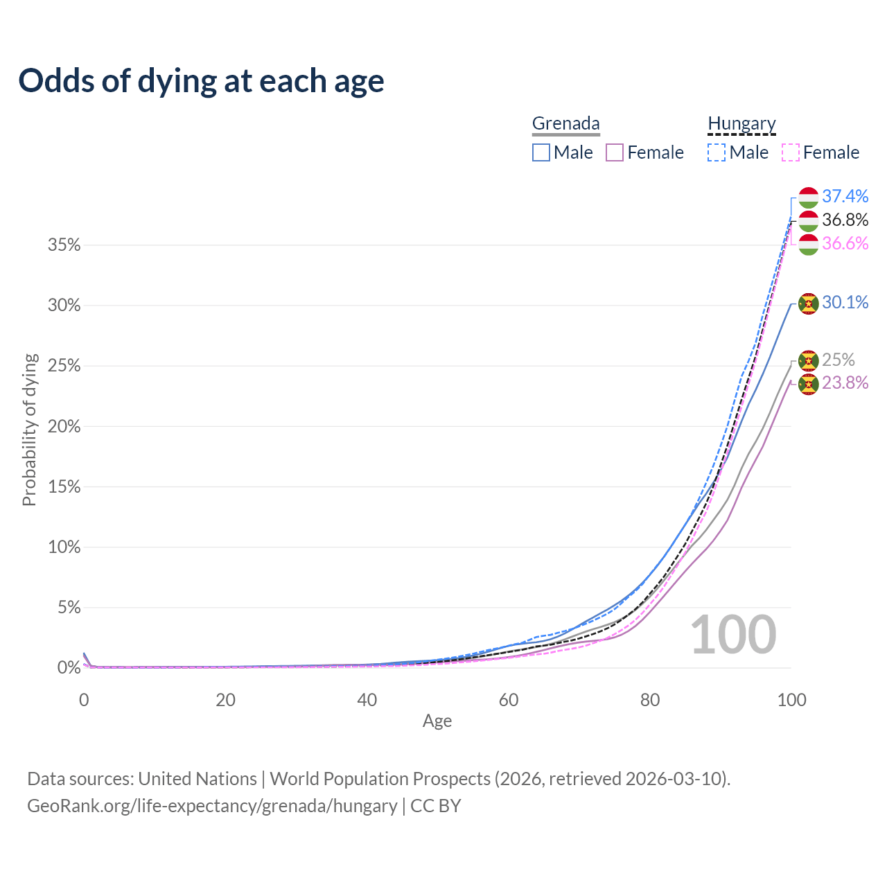 This life expectancy calculator shows the odds of living to 100, 95, 90, and below based on current age for both males and females in Grenada and Hungary, along with mean and median age of death. The calculations are based on the 2026 life tables (actuarial tables) from the UN World Population Prospects.
