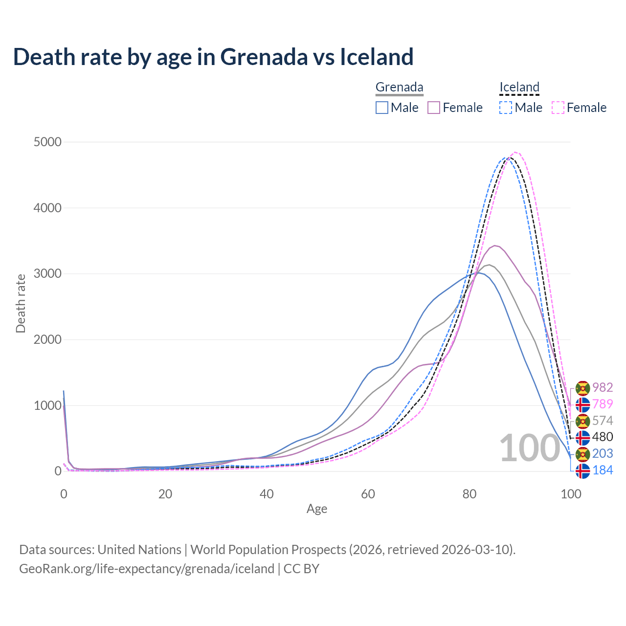This life expectancy calculator shows the odds of living to 100, 95, 90, and below based on current age for both males and females in Grenada and Iceland, along with mean and median age of death. The calculations are based on the 2026 life tables (actuarial tables) from the UN World Population Prospects.