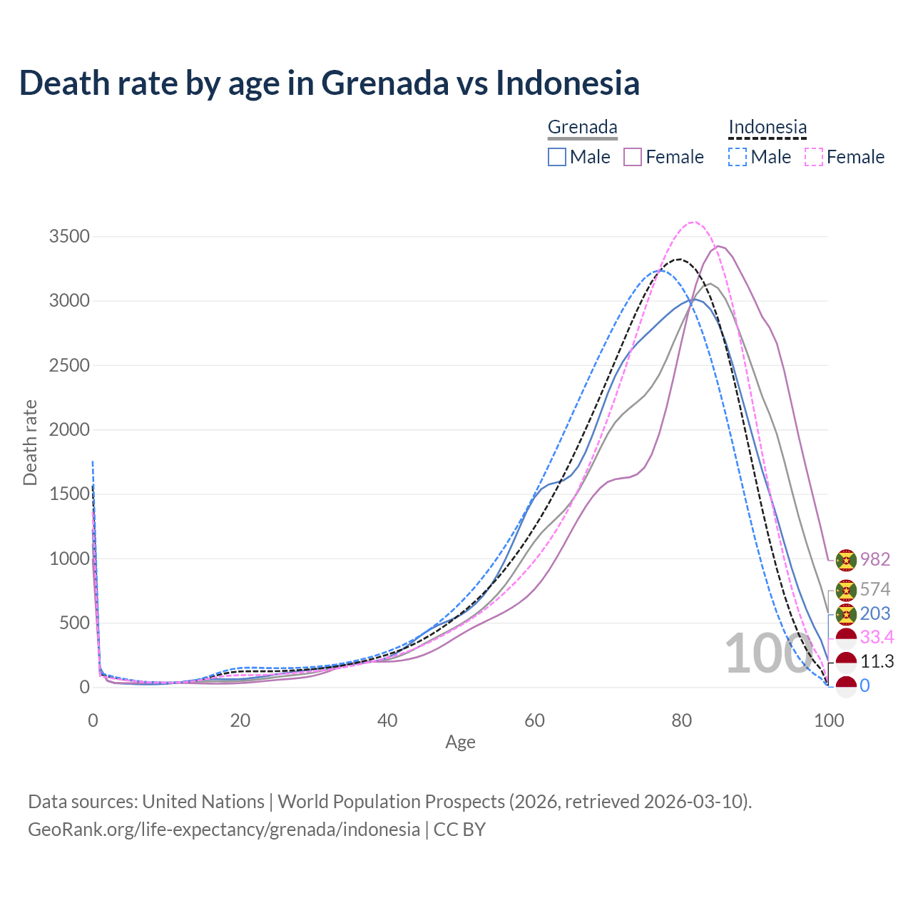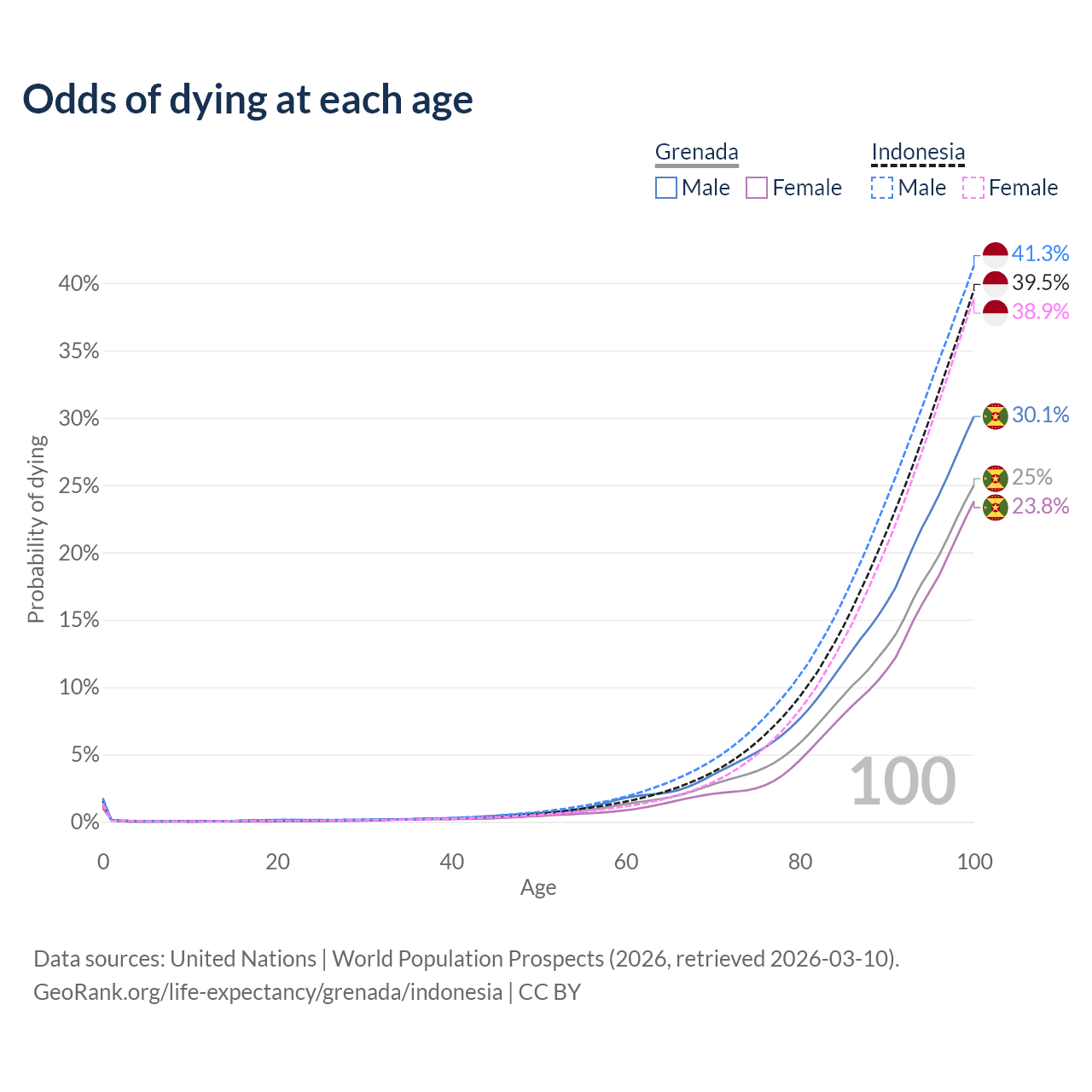 This life expectancy calculator shows the odds of living to 100, 95, 90, and below based on current age for both males and females in Grenada and Indonesia, along with mean and median age of death. The calculations are based on the 2026 life tables (actuarial tables) from the UN World Population Prospects.