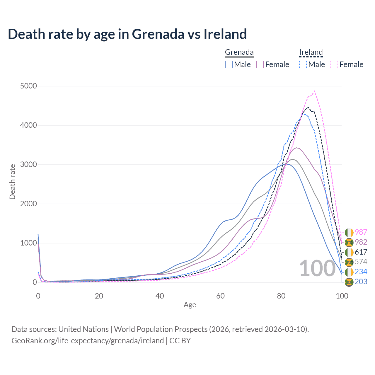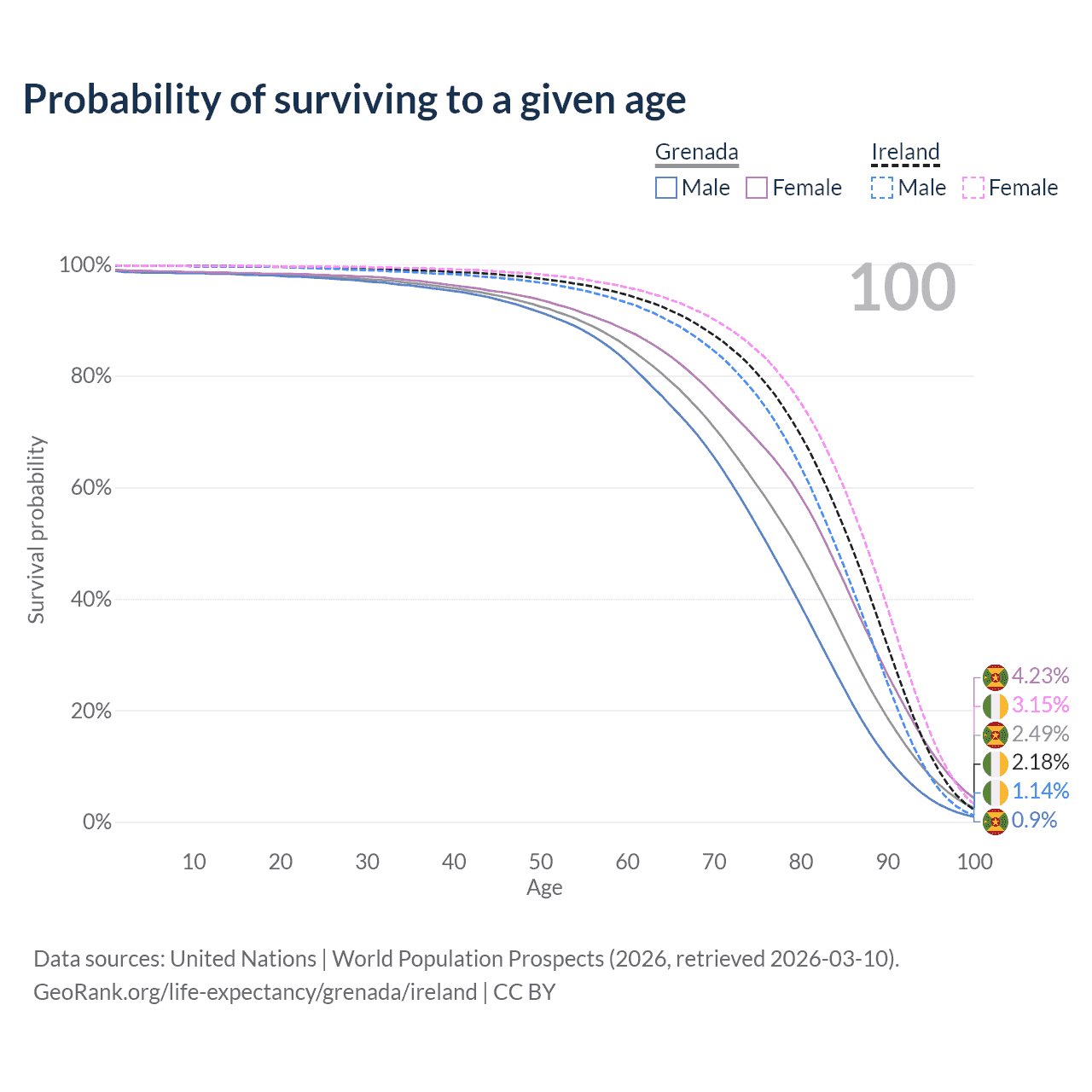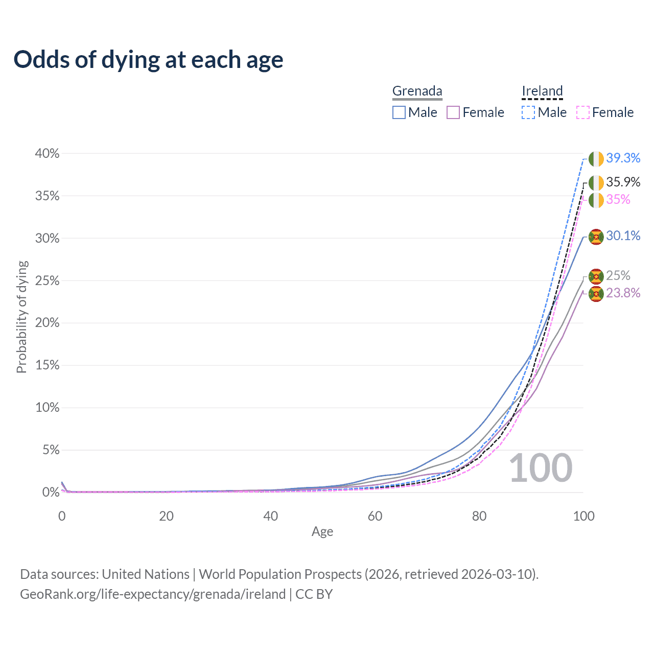 This life expectancy calculator shows the odds of living to 100, 95, 90, and below based on current age for both males and females in Grenada and Ireland, along with mean and median age of death. The calculations are based on the 2026 life tables (actuarial tables) from the UN World Population Prospects.