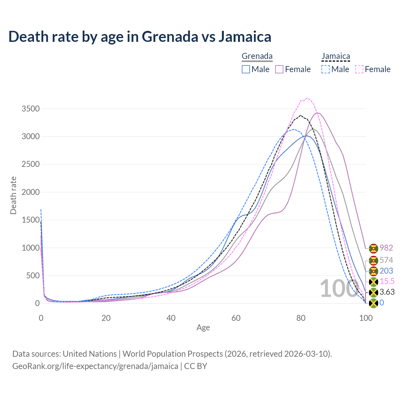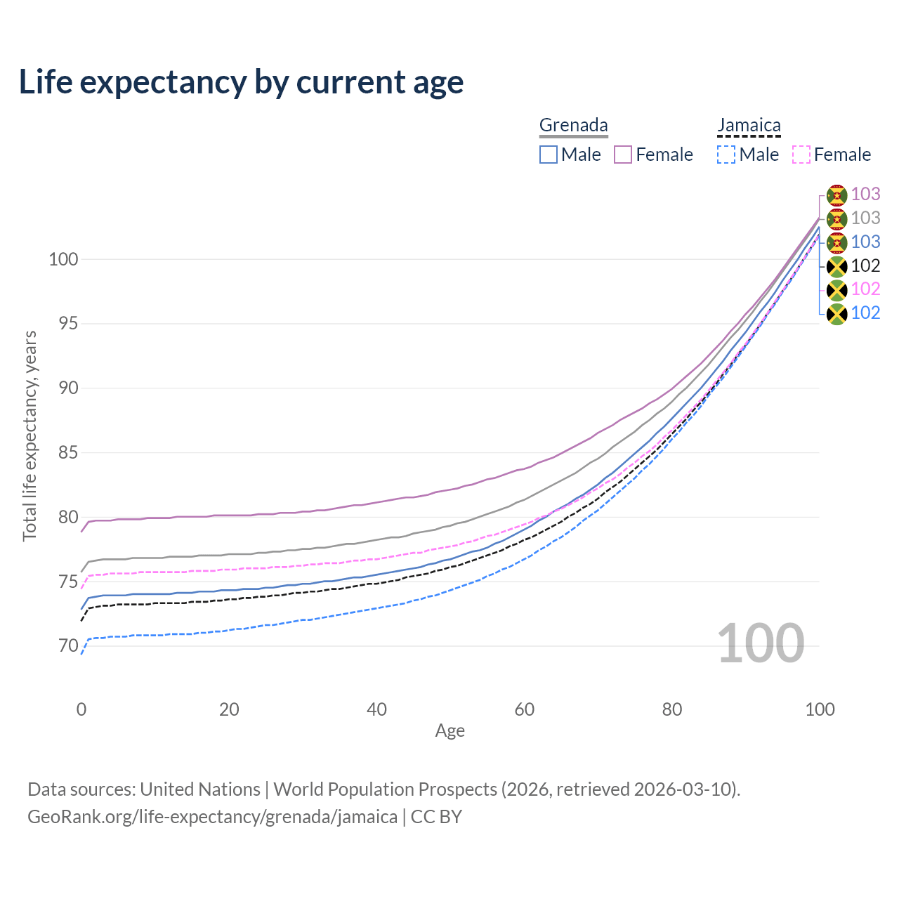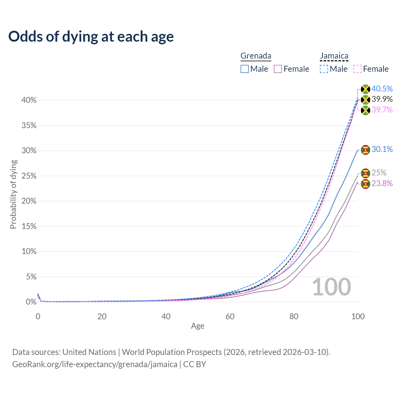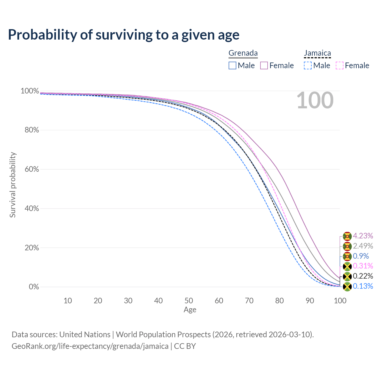 This life expectancy calculator shows the odds of living to 100, 95, 90, and below based on current age for both males and females in Grenada and Jamaica, along with mean and median age of death. The calculations are based on the 2026 life tables (actuarial tables) from the UN World Population Prospects.