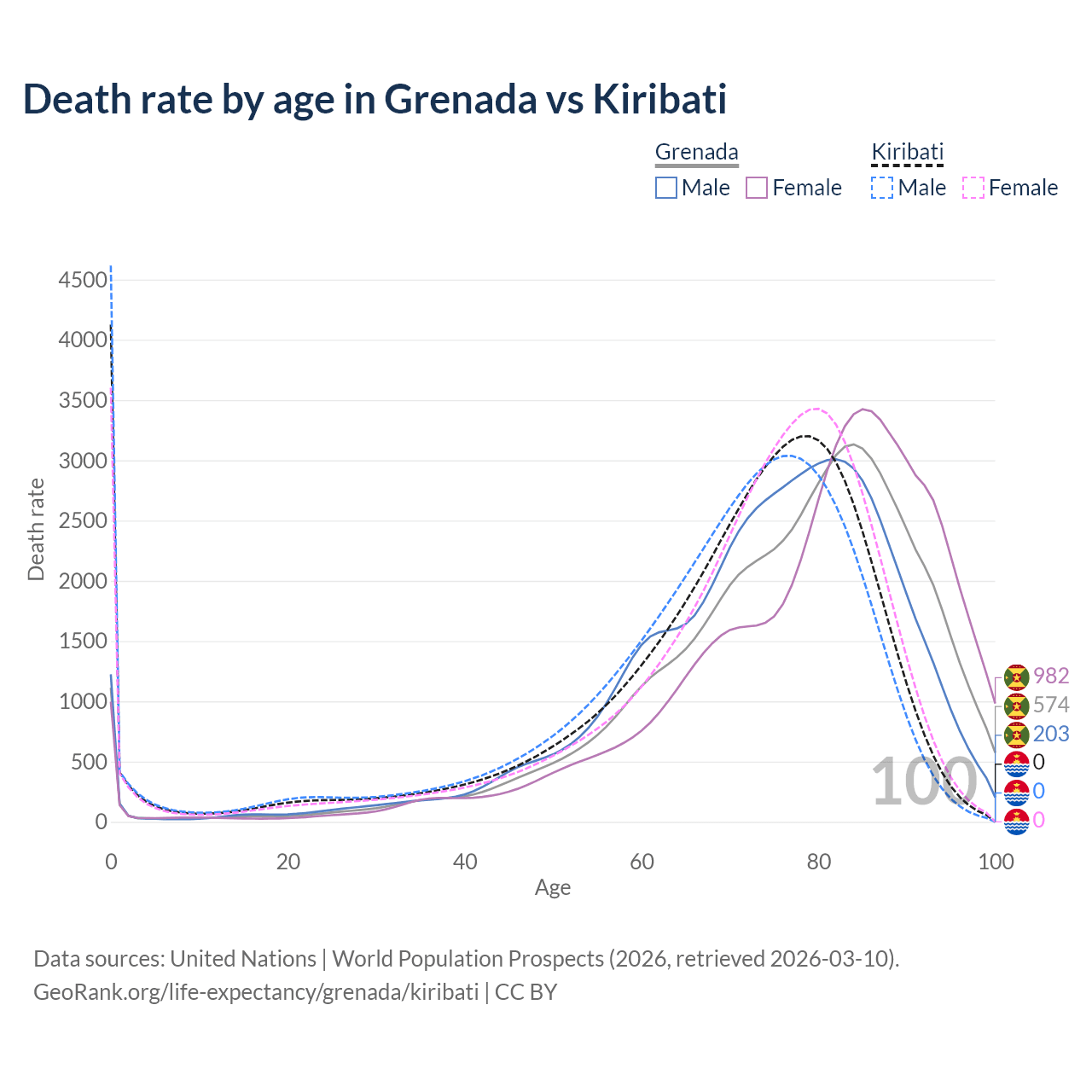 In Grenada, the most common age of death is 84, compared to 0 in Kiribati. The median age of death is 79.3 in Grenada and 73.1 in Kiribati, meaning only half of each cohort is expected to live past that age.