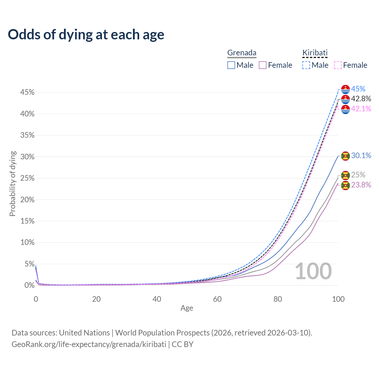 This life expectancy calculator shows the odds of living to 100, 95, 90, and below based on current age for both males and females in Grenada and Kiribati, along with mean and median age of death. The calculations are based on the 2026 life tables (actuarial tables) from the UN World Population Prospects.
