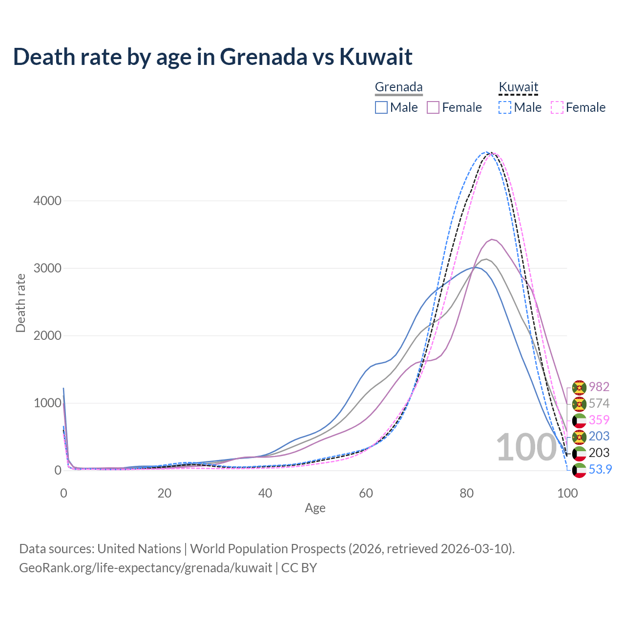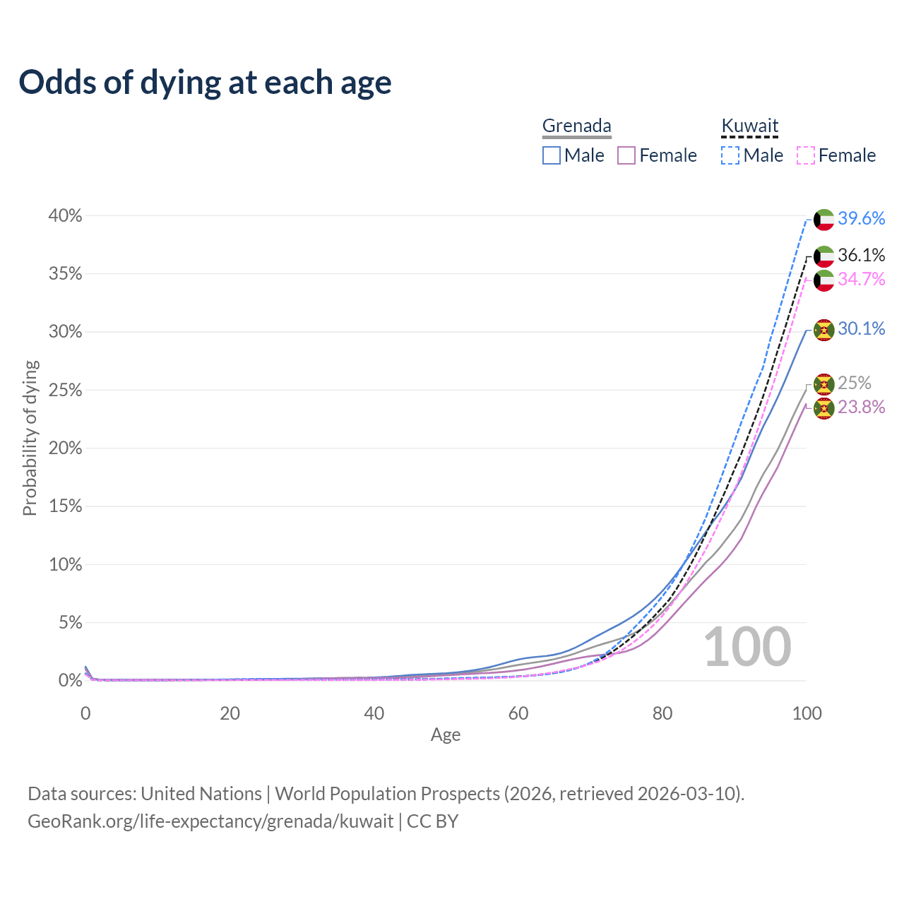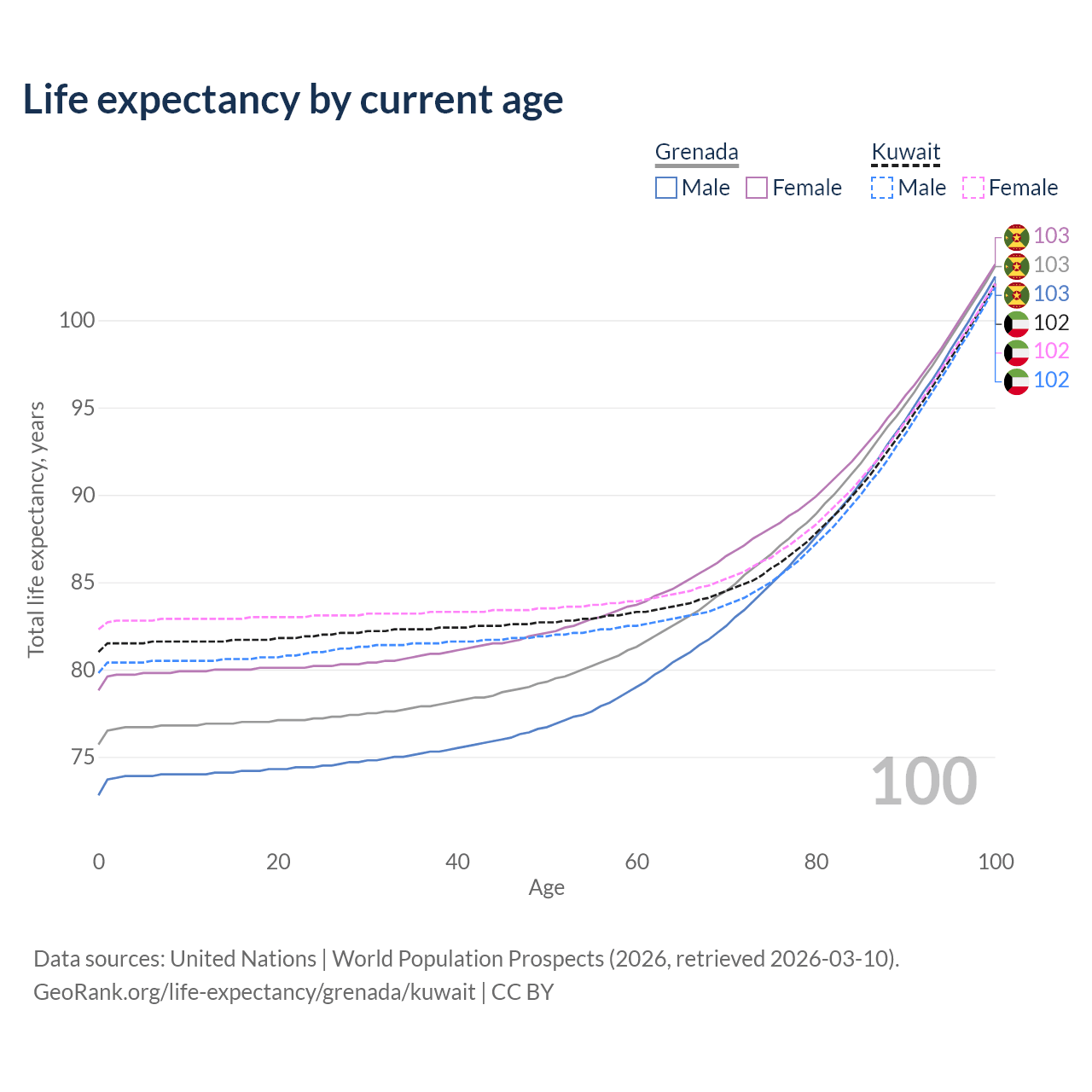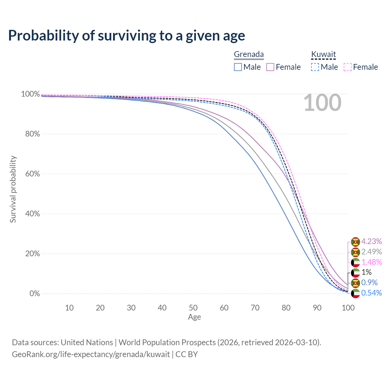 This life expectancy calculator shows the odds of living to 100, 95, 90, and below based on current age for both males and females in Grenada and Kuwait, along with mean and median age of death. The calculations are based on the 2026 life tables (actuarial tables) from the UN World Population Prospects.