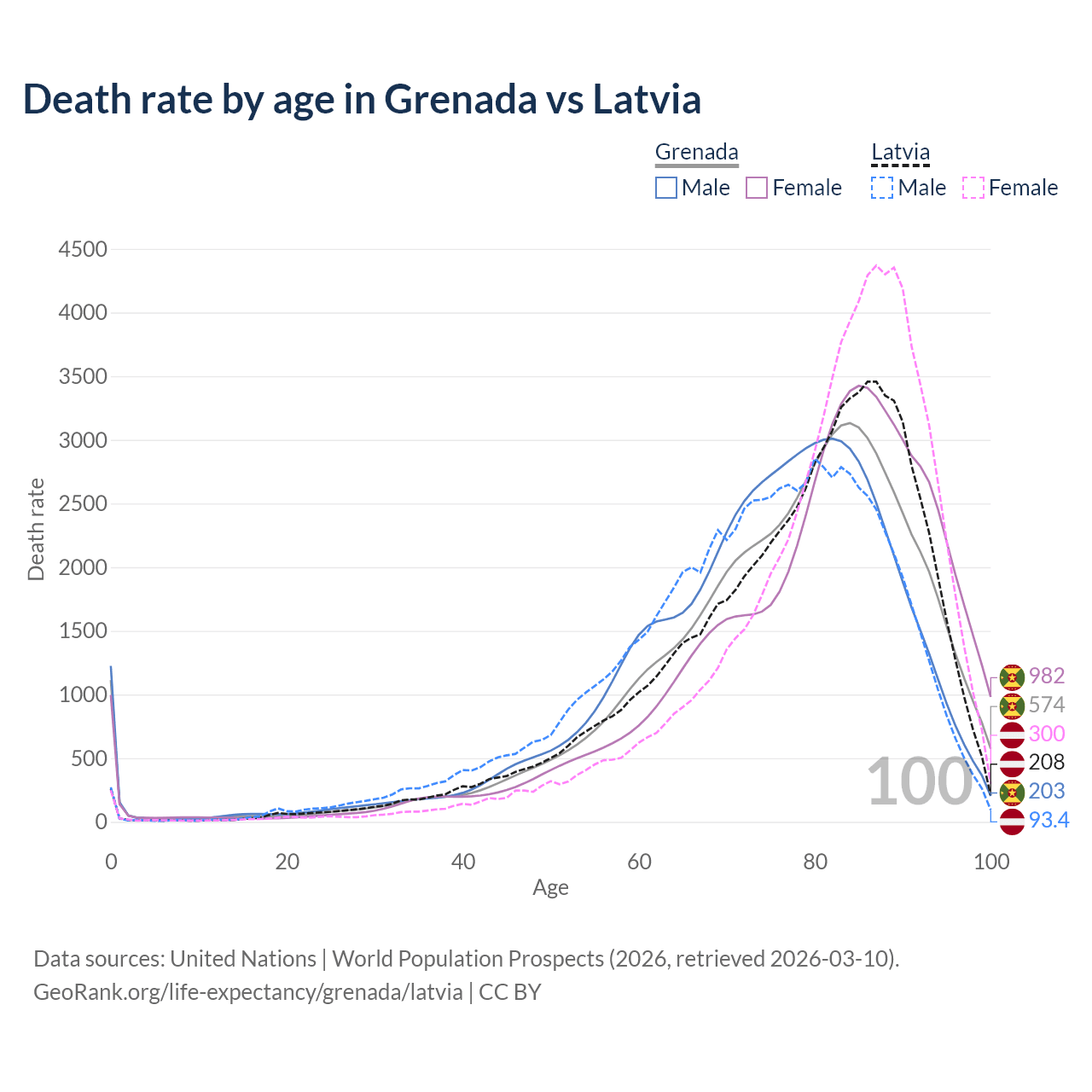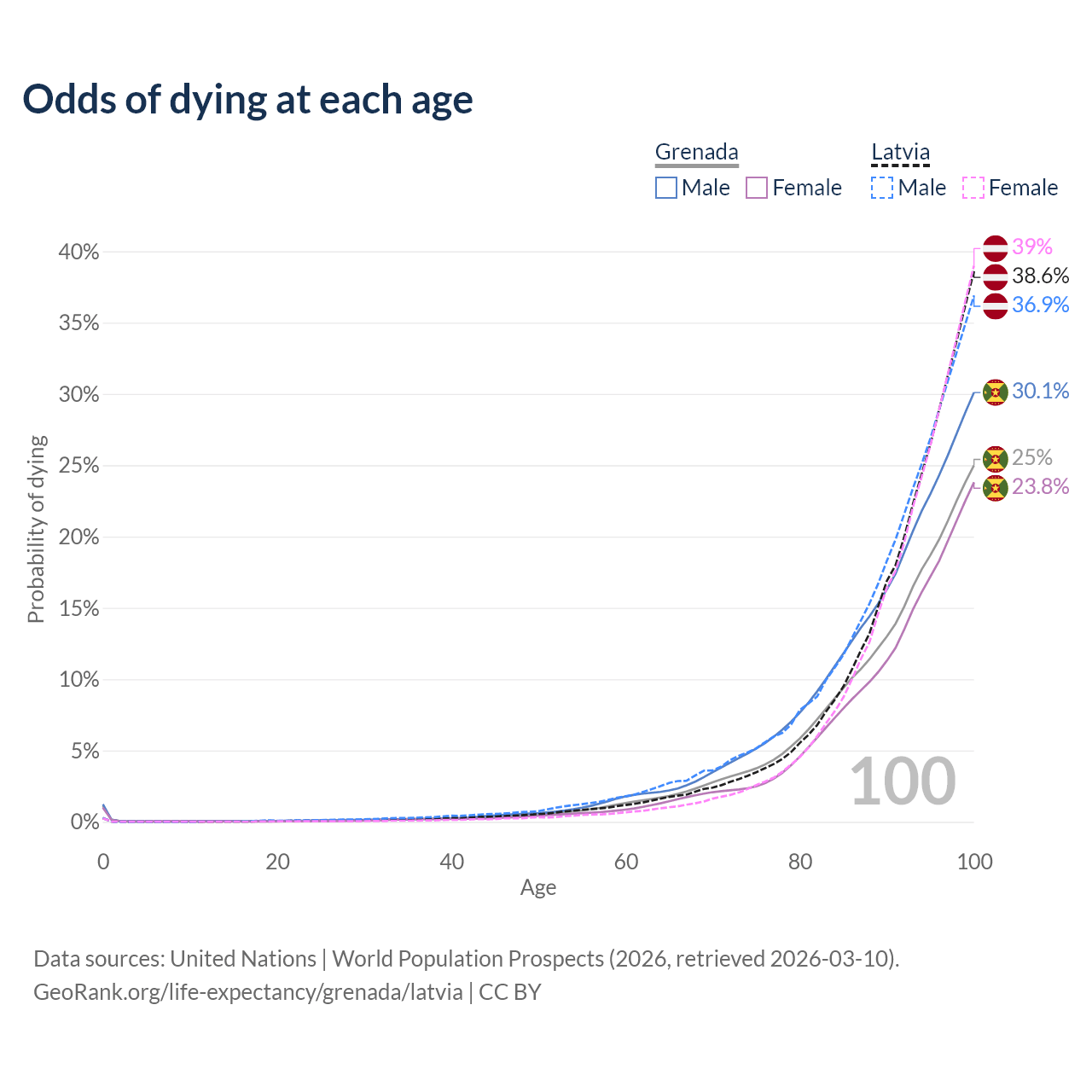 This life expectancy calculator shows the odds of living to 100, 95, 90, and below based on current age for both males and females in Grenada and Latvia, along with mean and median age of death. The calculations are based on the 2026 life tables (actuarial tables) from the UN World Population Prospects.