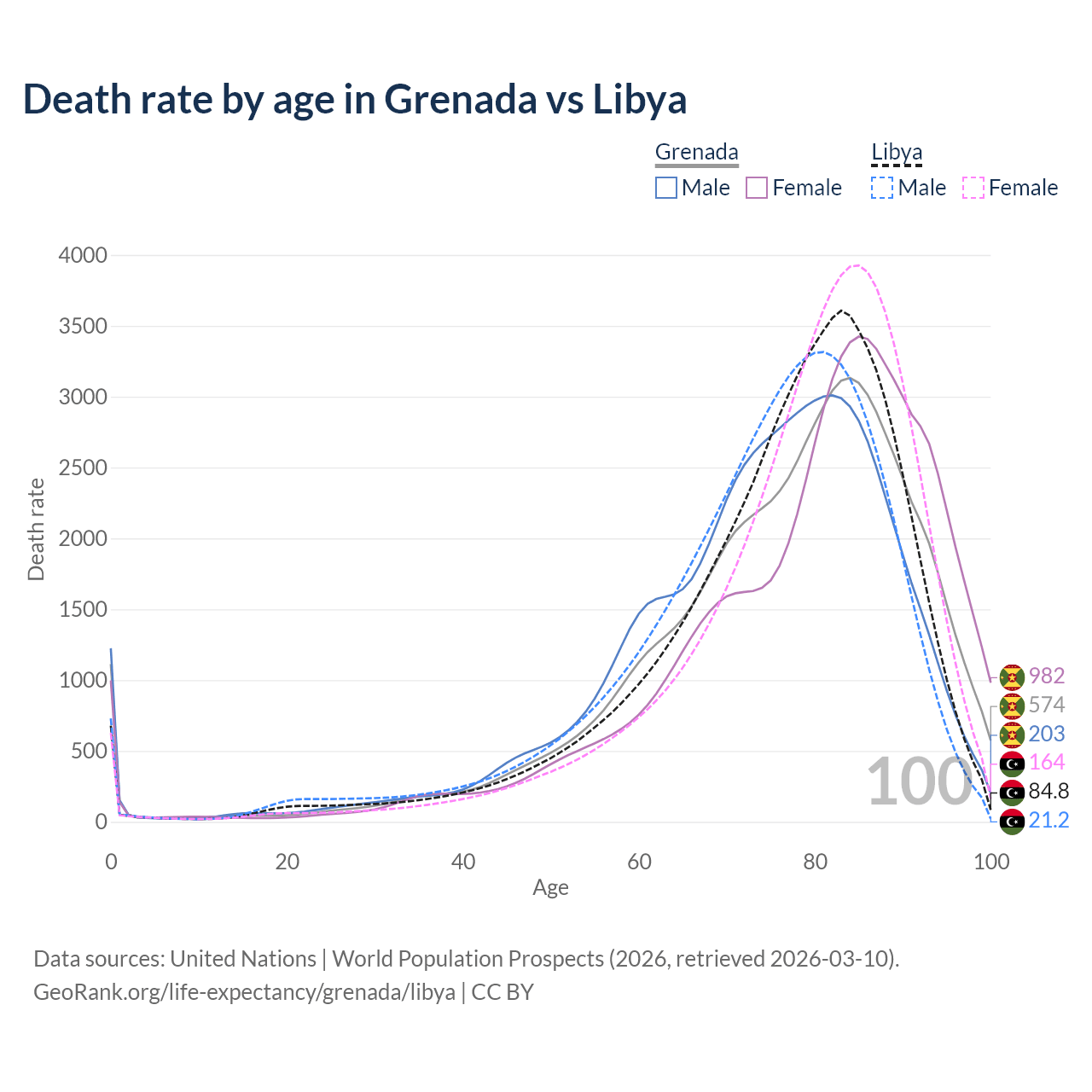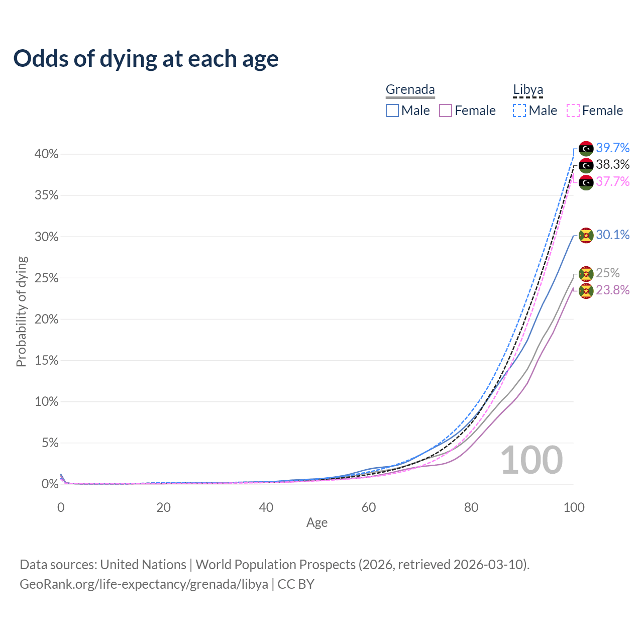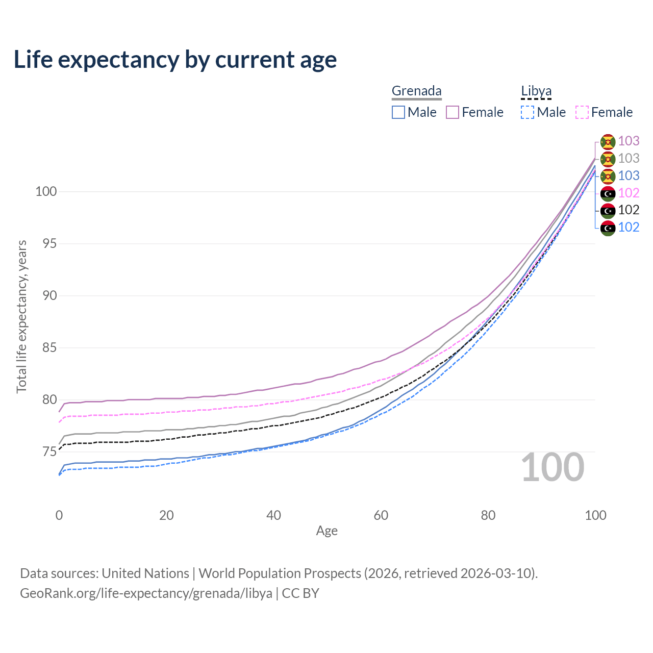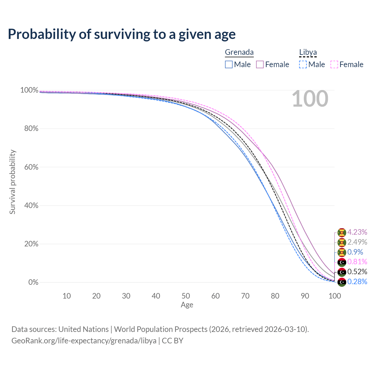 This life expectancy calculator shows the odds of living to 100, 95, 90, and below based on current age for both males and females in Grenada and Libya, along with mean and median age of death. The calculations are based on the 2026 life tables (actuarial tables) from the UN World Population Prospects.