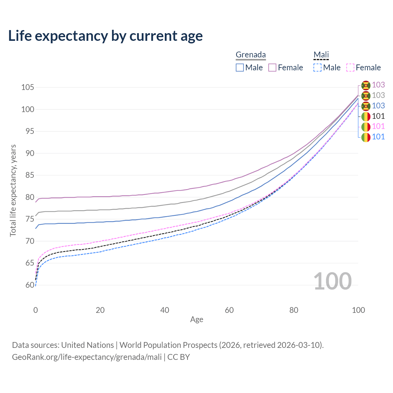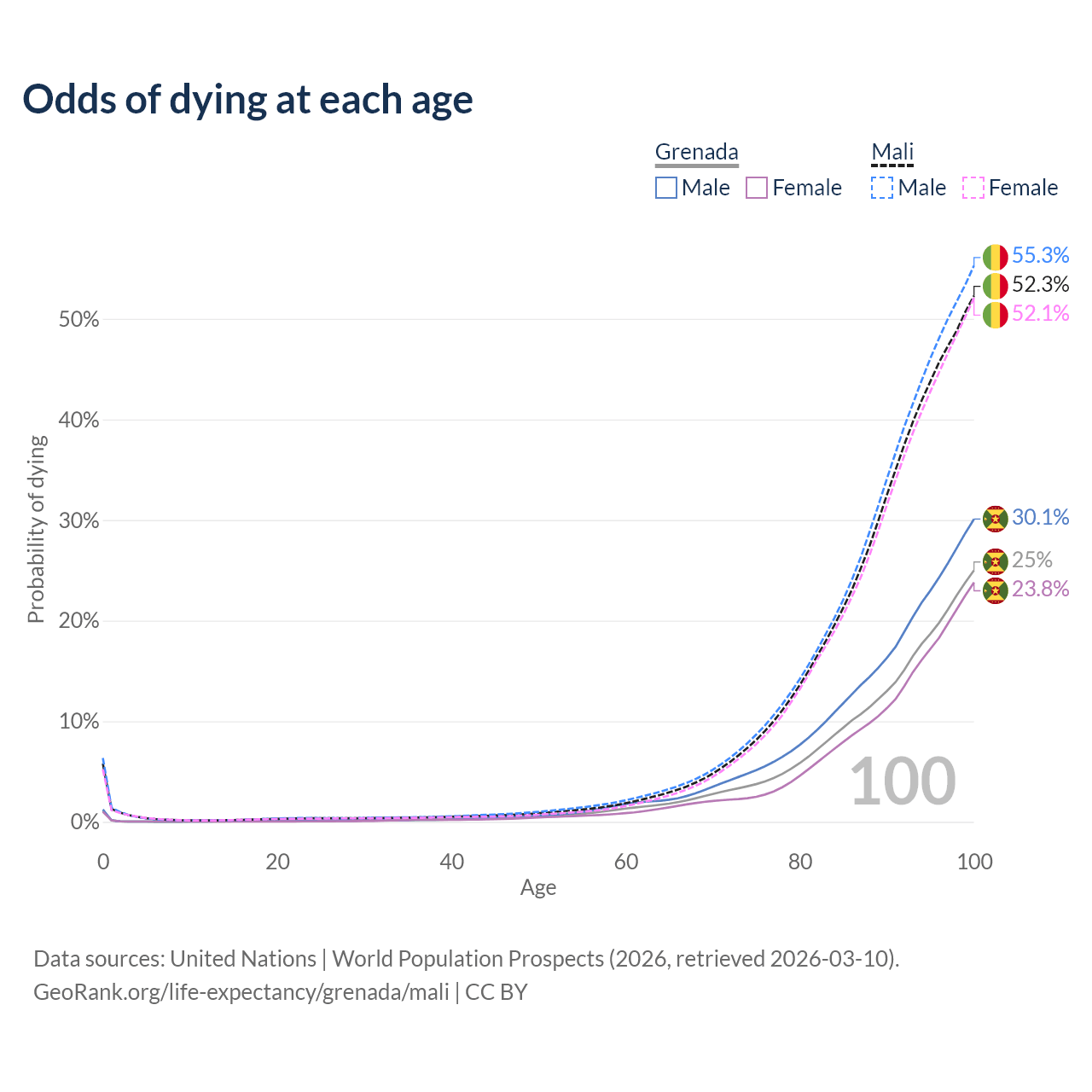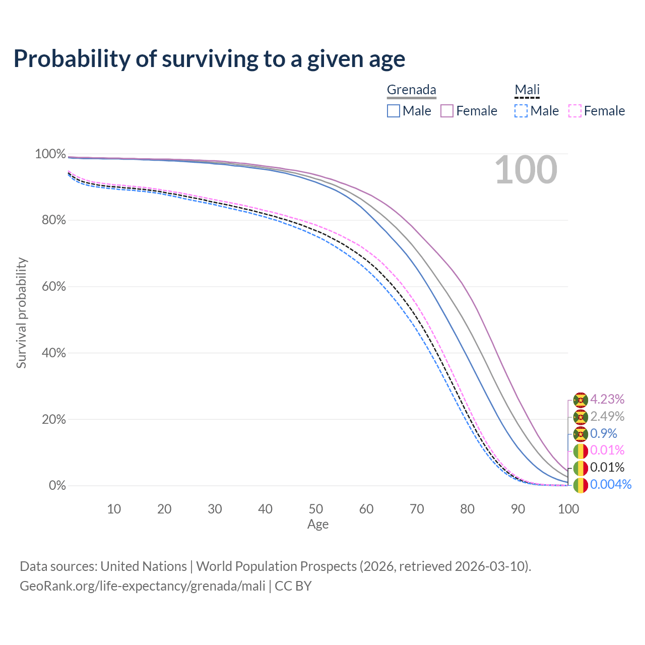 This life expectancy calculator shows the odds of living to 100, 95, 90, and below based on current age for both males and females in Grenada and Mali, along with mean and median age of death. The calculations are based on the 2026 life tables (actuarial tables) from the UN World Population Prospects.