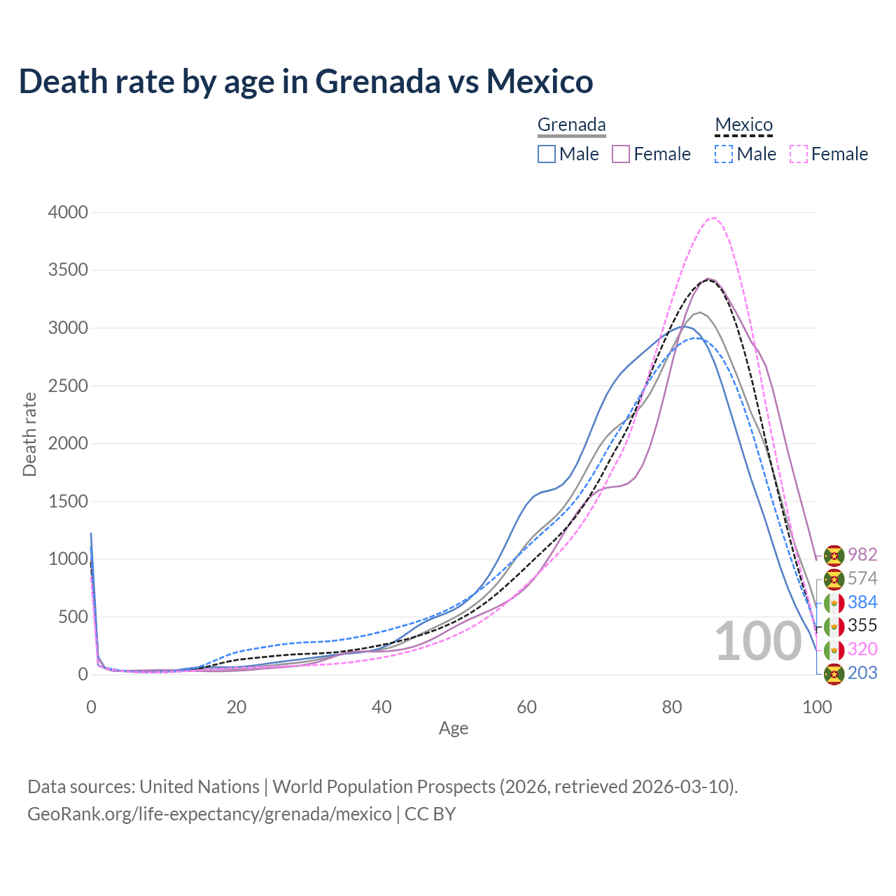 In Grenada, the most common age of death is 84, compared to 85 in Mexico. The median age of death is 79.3 in Grenada and 80.1 in Mexico, meaning only half of each cohort is expected to live past that age.