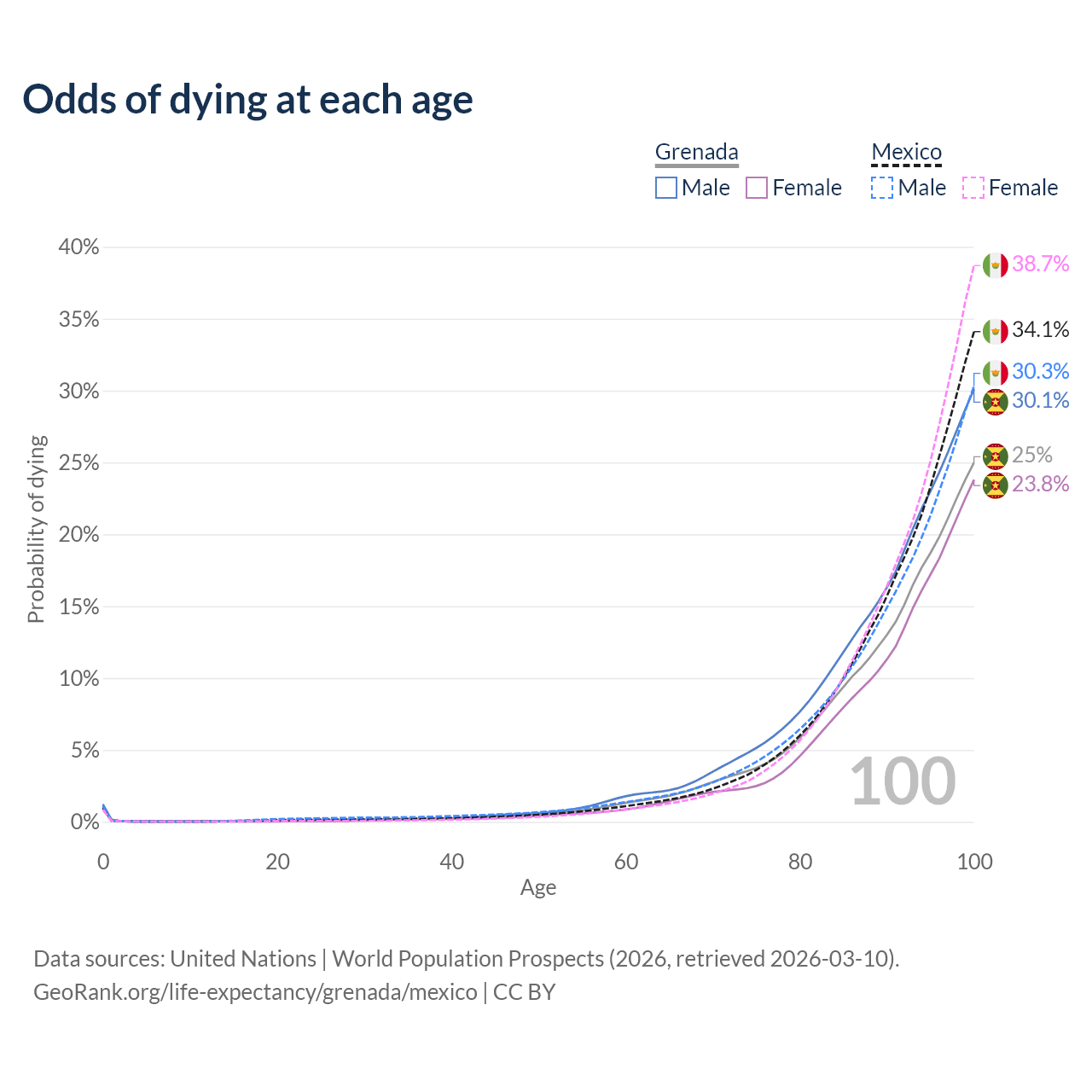 This life expectancy calculator shows the odds of living to 100, 95, 90, and below based on current age for both males and females in Grenada and Mexico, along with mean and median age of death. The calculations are based on the 2026 life tables (actuarial tables) from the UN World Population Prospects.