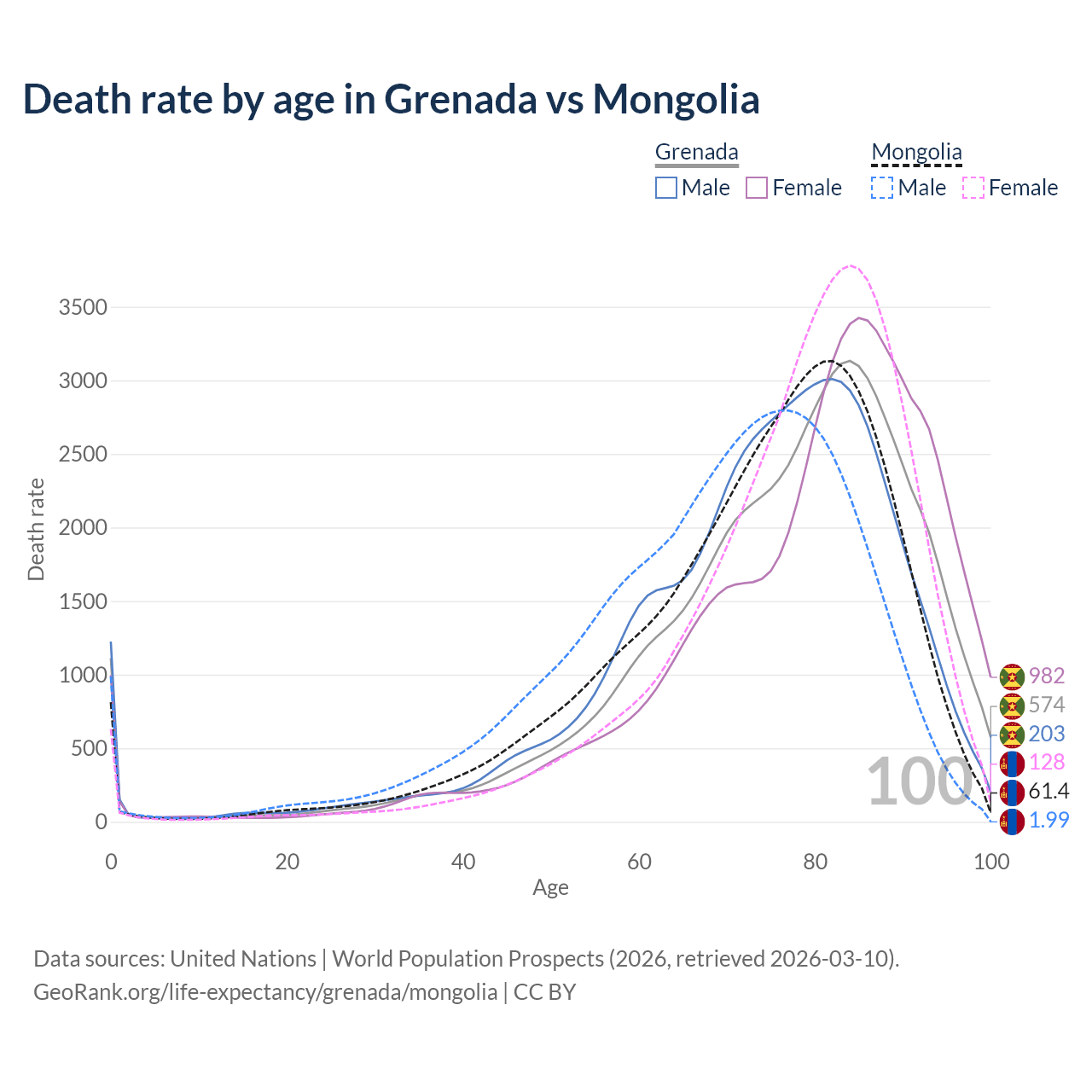 In Grenada, the most common age of death is 84, compared to 82 in Mongolia. The median age of death is 79.3 in Grenada and 76 in Mongolia, meaning only half of each cohort is expected to live past that age.
