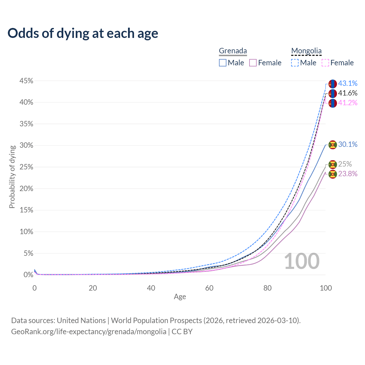 This life expectancy calculator shows the odds of living to 100, 95, 90, and below based on current age for both males and females in Grenada and Mongolia, along with mean and median age of death. The calculations are based on the 2026 life tables (actuarial tables) from the UN World Population Prospects.