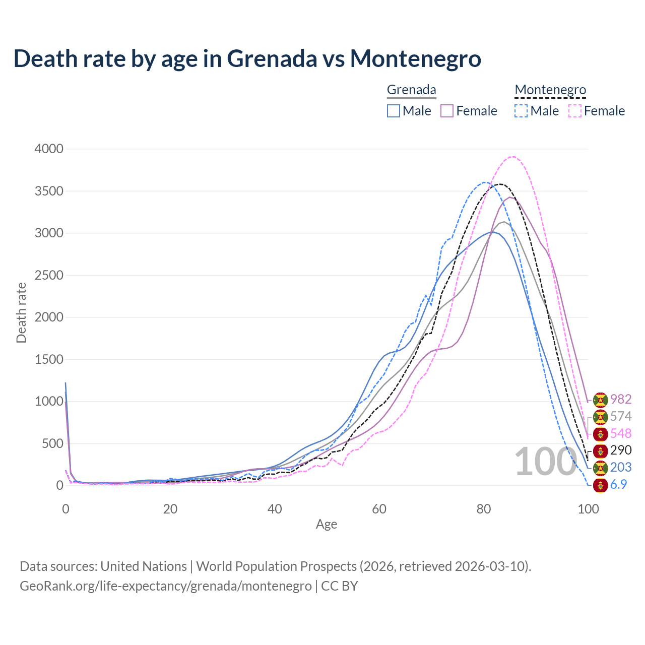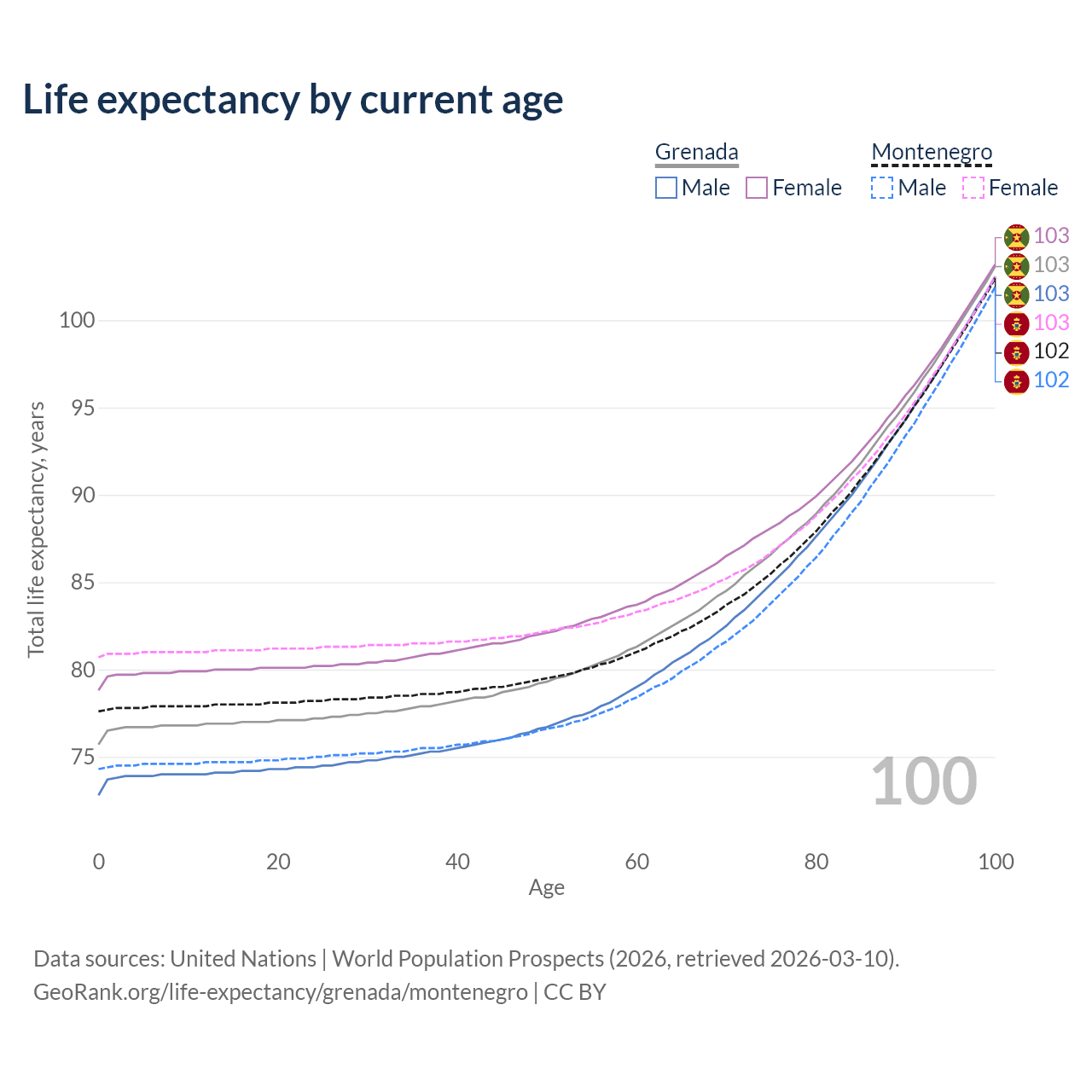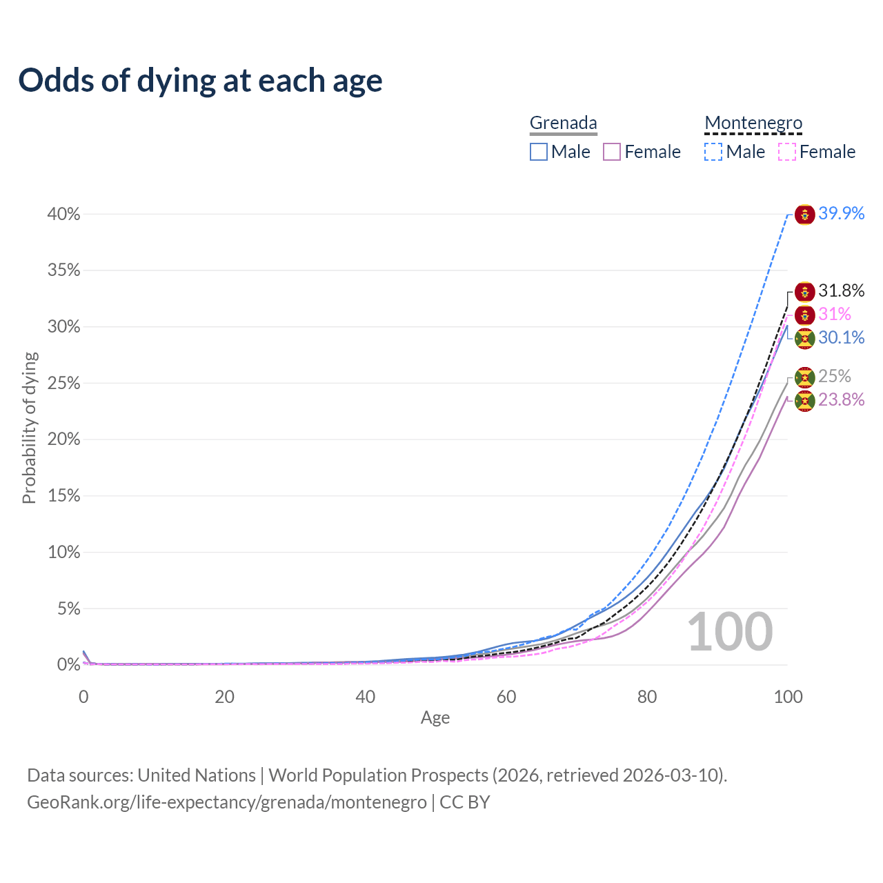 This life expectancy calculator shows the odds of living to 100, 95, 90, and below based on current age for both males and females in Grenada and Montenegro, along with mean and median age of death. The calculations are based on the 2026 life tables (actuarial tables) from the UN World Population Prospects.