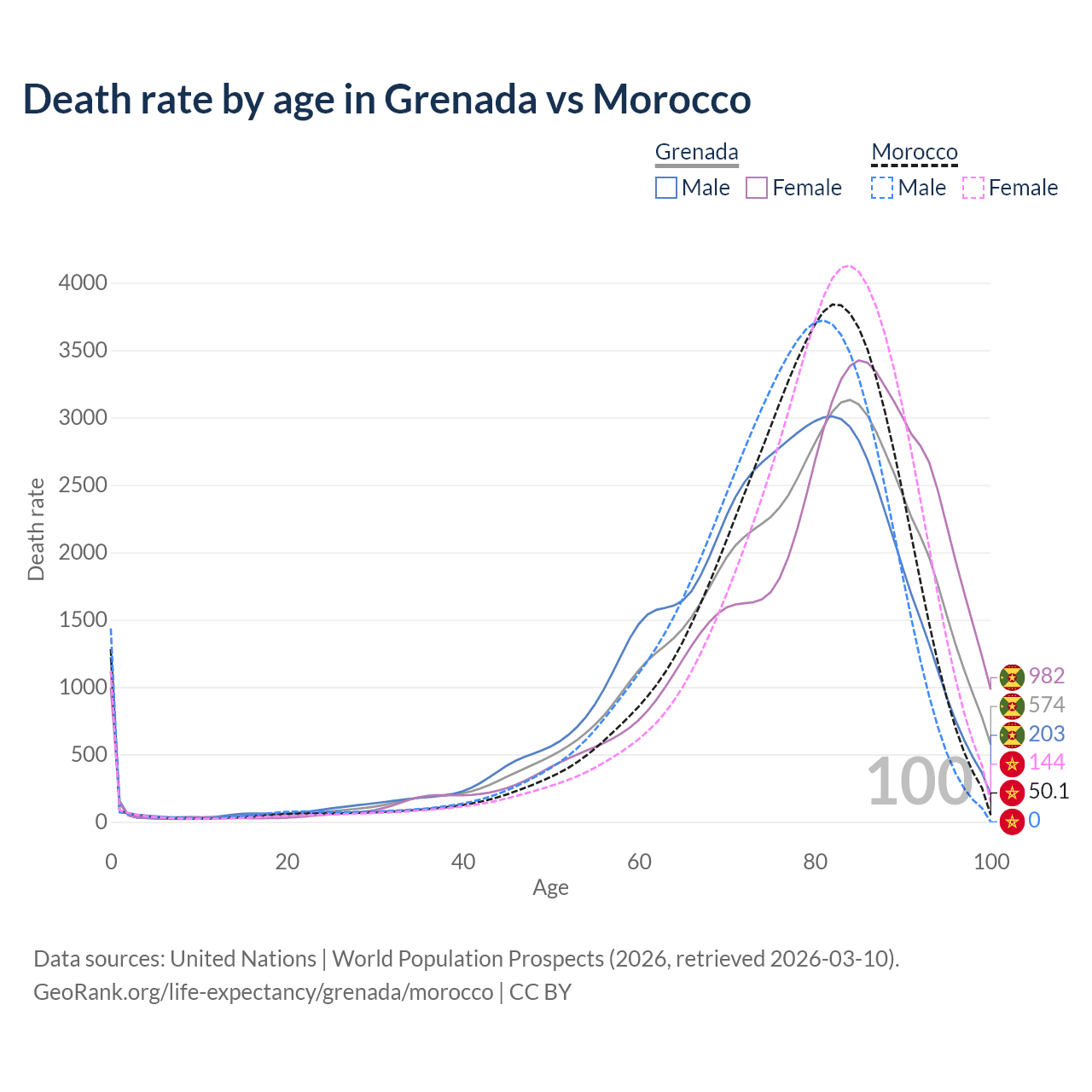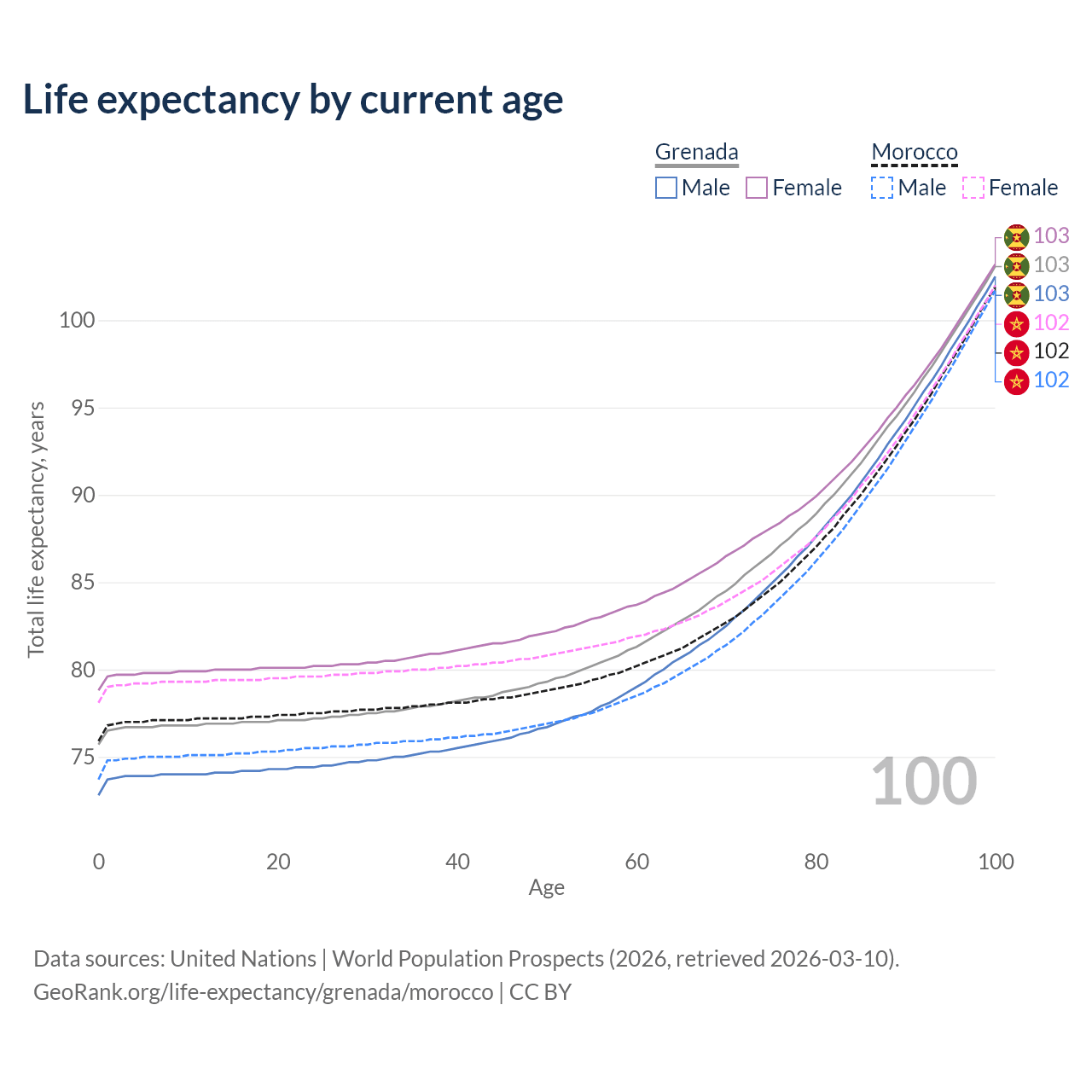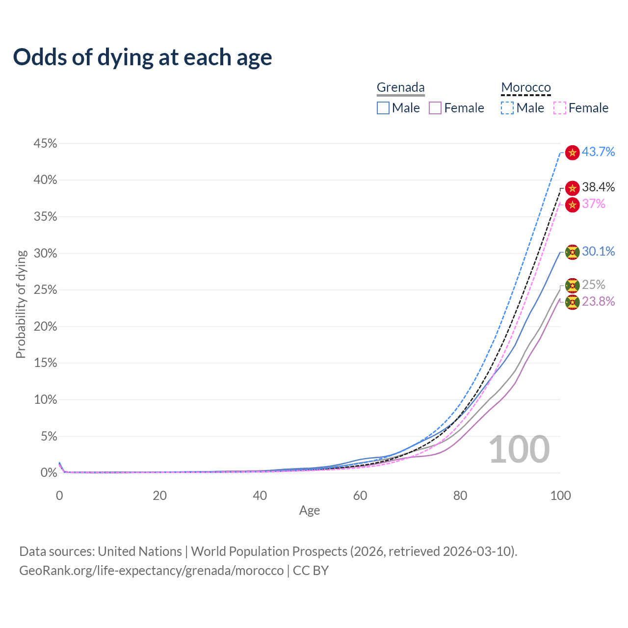 This life expectancy calculator shows the odds of living to 100, 95, 90, and below based on current age for both males and females in Grenada and Morocco, along with mean and median age of death. The calculations are based on the 2026 life tables (actuarial tables) from the UN World Population Prospects.