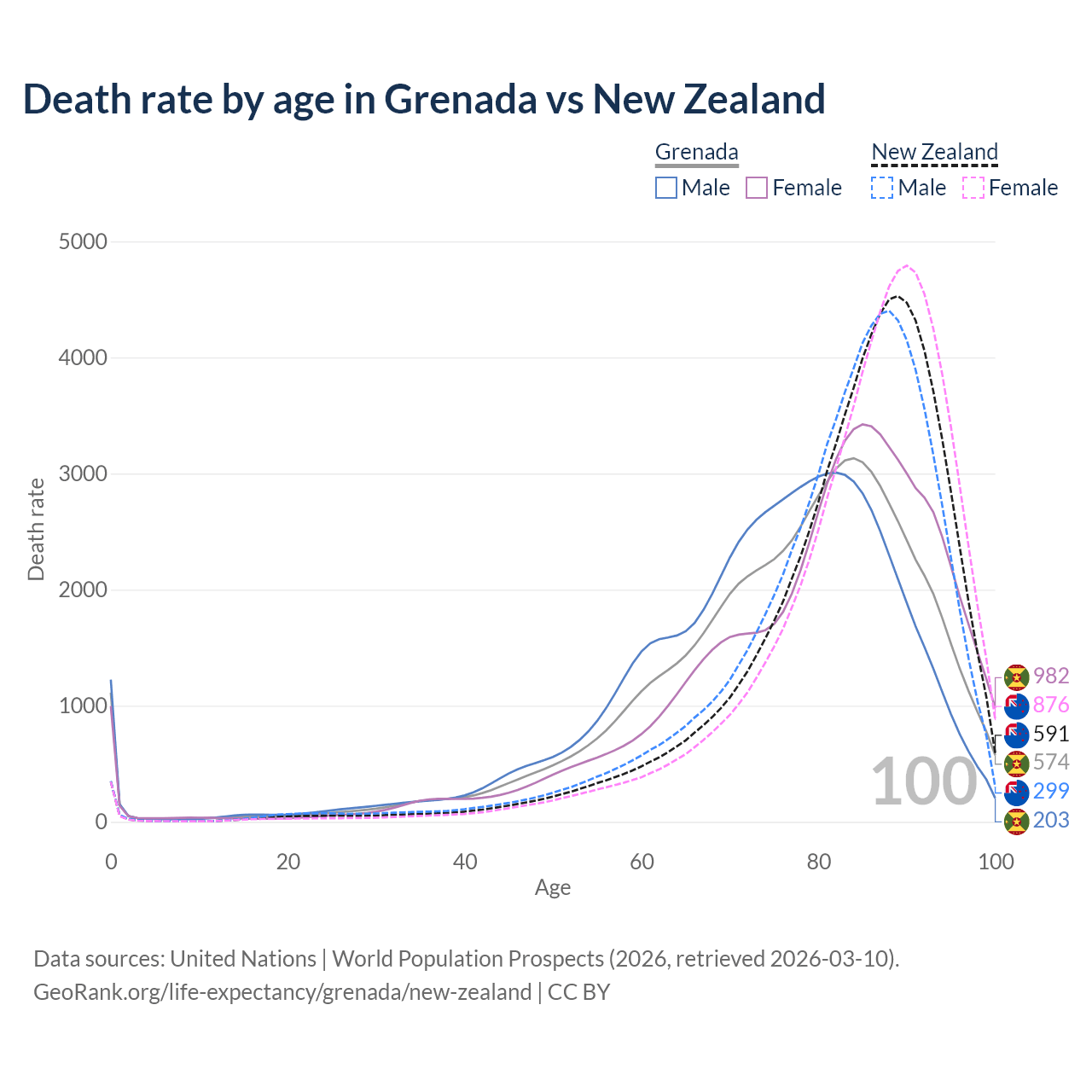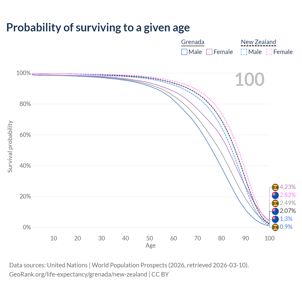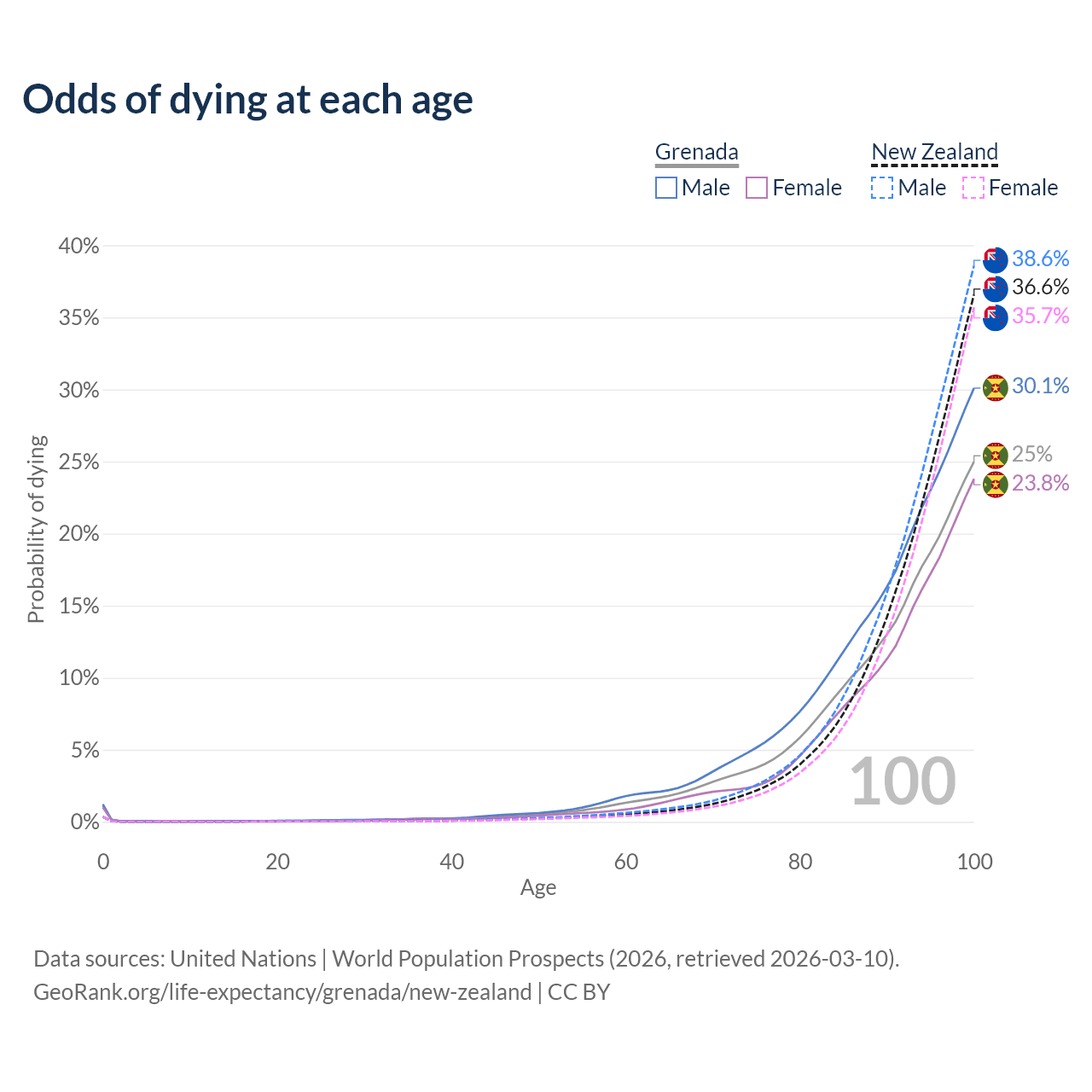 This life expectancy calculator shows the odds of living to 100, 95, 90, and below based on current age for both males and females in Grenada and New Zealand, along with mean and median age of death. The calculations are based on the 2026 life tables (actuarial tables) from the UN World Population Prospects.