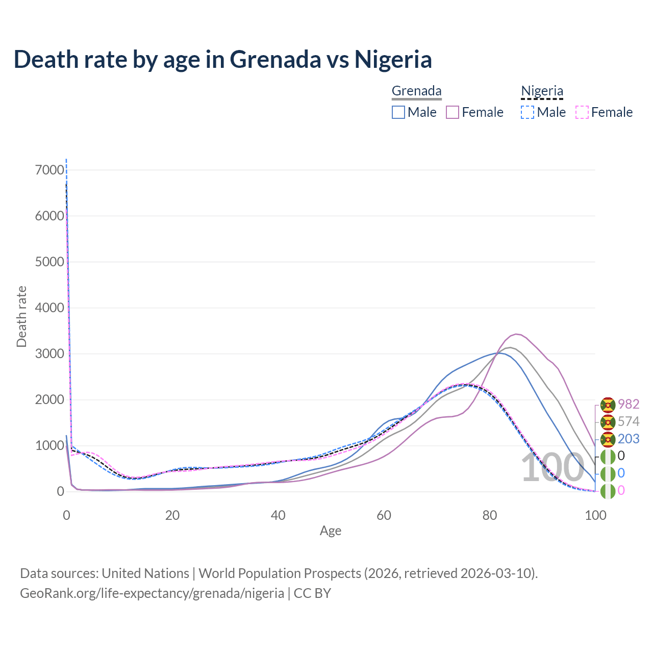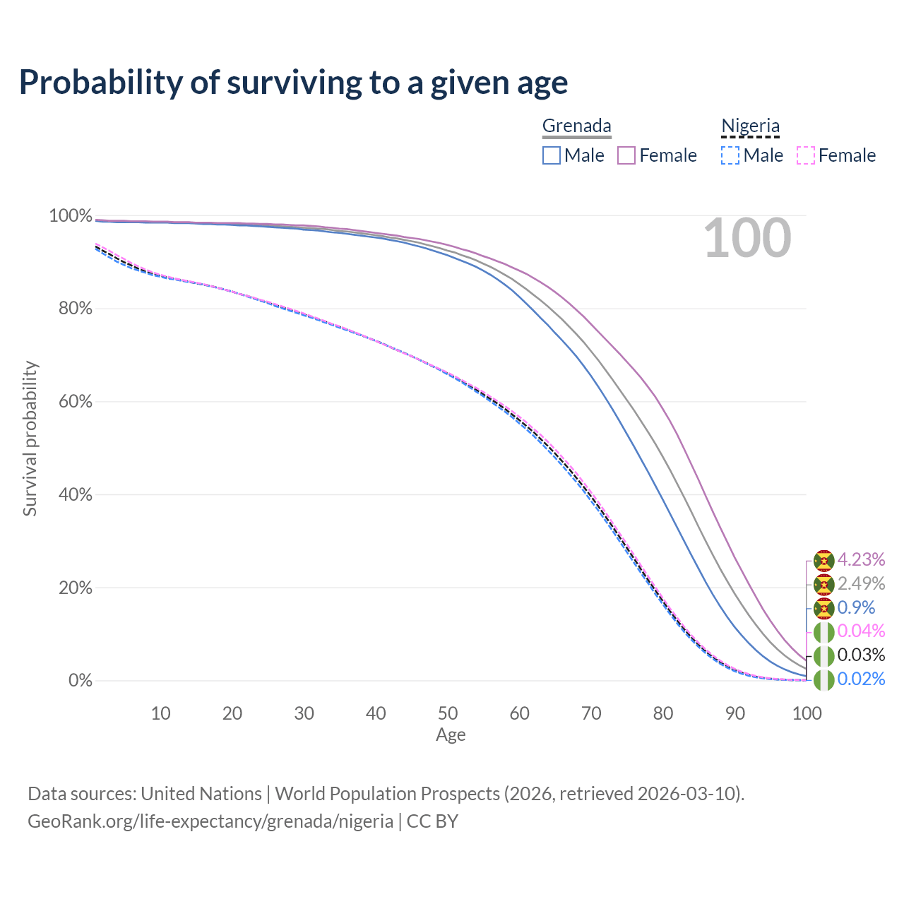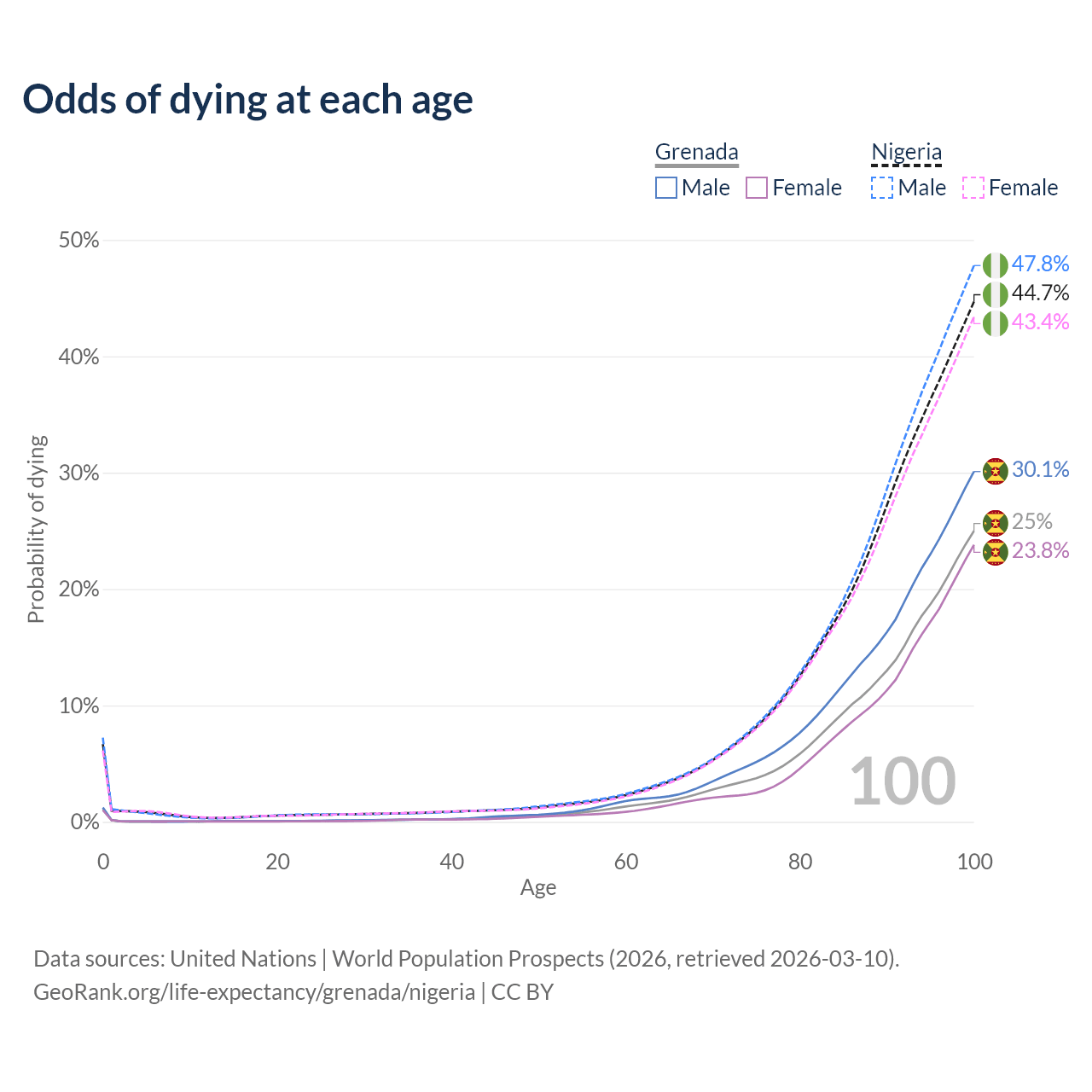 This life expectancy calculator shows the odds of living to 100, 95, 90, and below based on current age for both males and females in Grenada and Nigeria, along with mean and median age of death. The calculations are based on the 2026 life tables (actuarial tables) from the UN World Population Prospects.