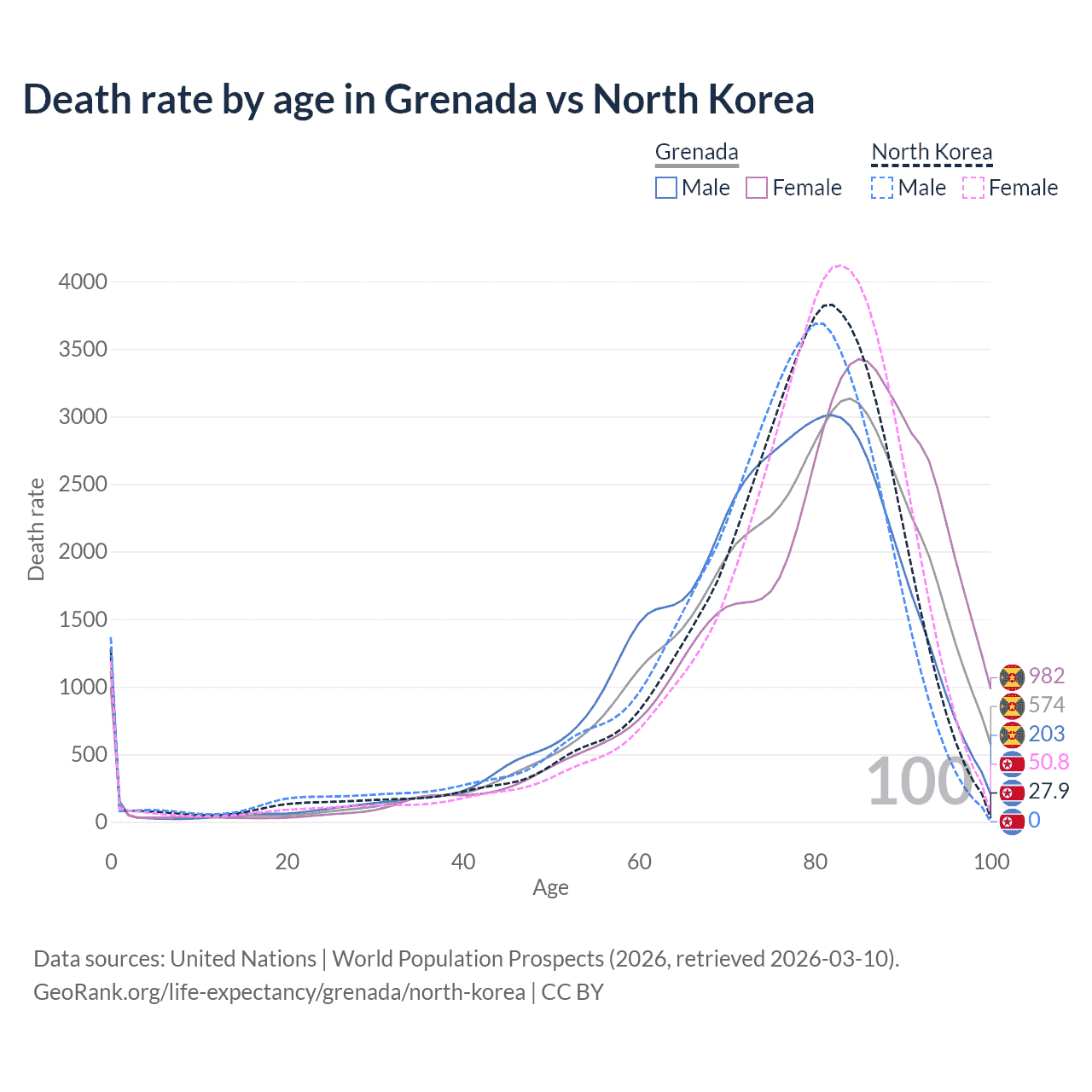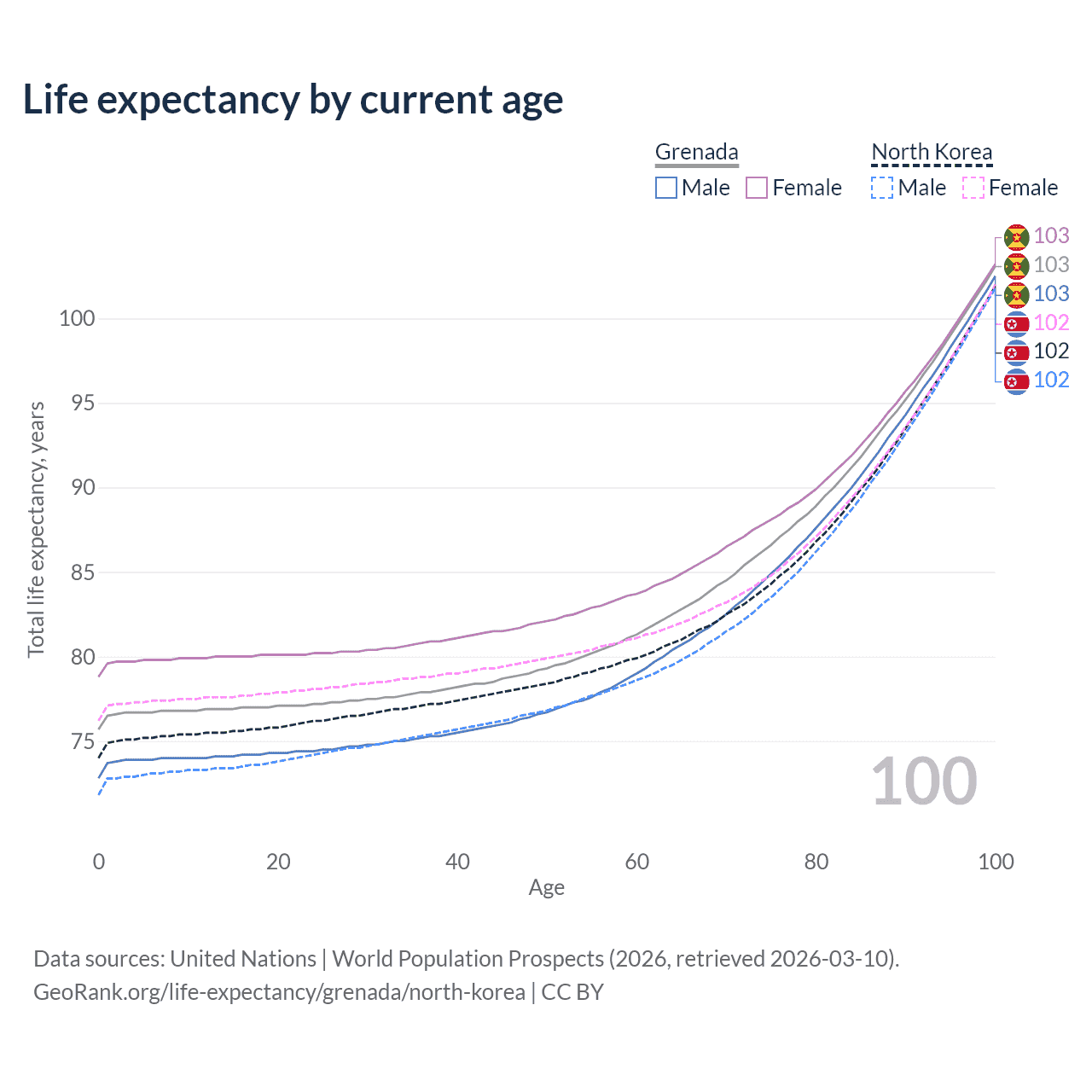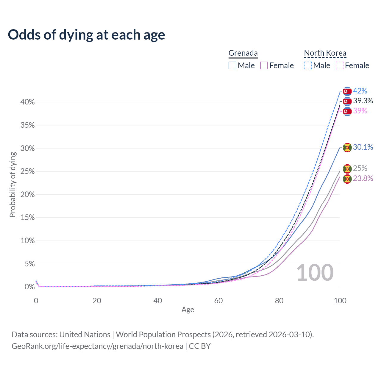 This life expectancy calculator shows the odds of living to 100, 95, 90, and below based on current age for both males and females in Grenada and North Korea, along with mean and median age of death. The calculations are based on the 2026 life tables (actuarial tables) from the UN World Population Prospects.