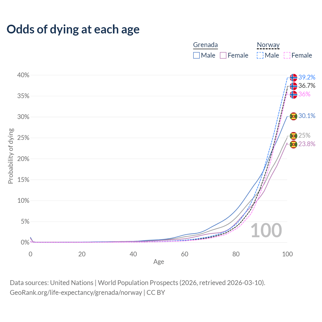 This life expectancy calculator shows the odds of living to 100, 95, 90, and below based on current age for both males and females in Grenada and Norway, along with mean and median age of death. The calculations are based on the 2026 life tables (actuarial tables) from the UN World Population Prospects.