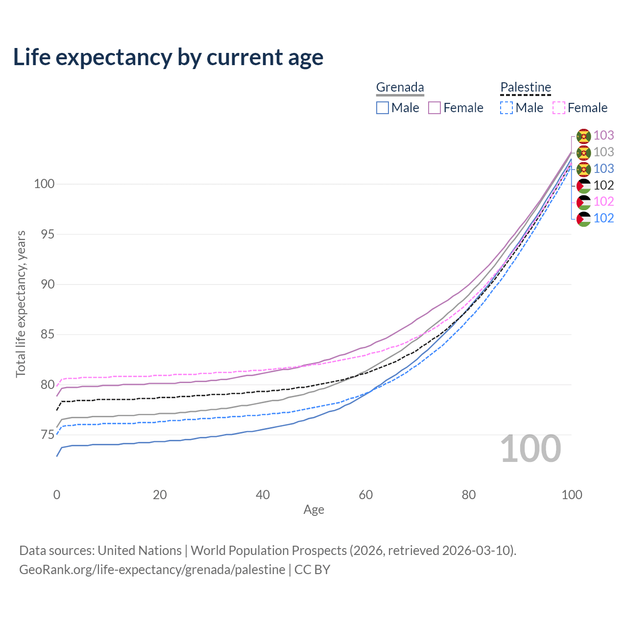 This life expectancy calculator shows the odds of living to 100, 95, 90, and below based on current age for both males and females in Grenada and Palestine, along with mean and median age of death. The calculations are based on the 2026 life tables (actuarial tables) from the UN World Population Prospects.