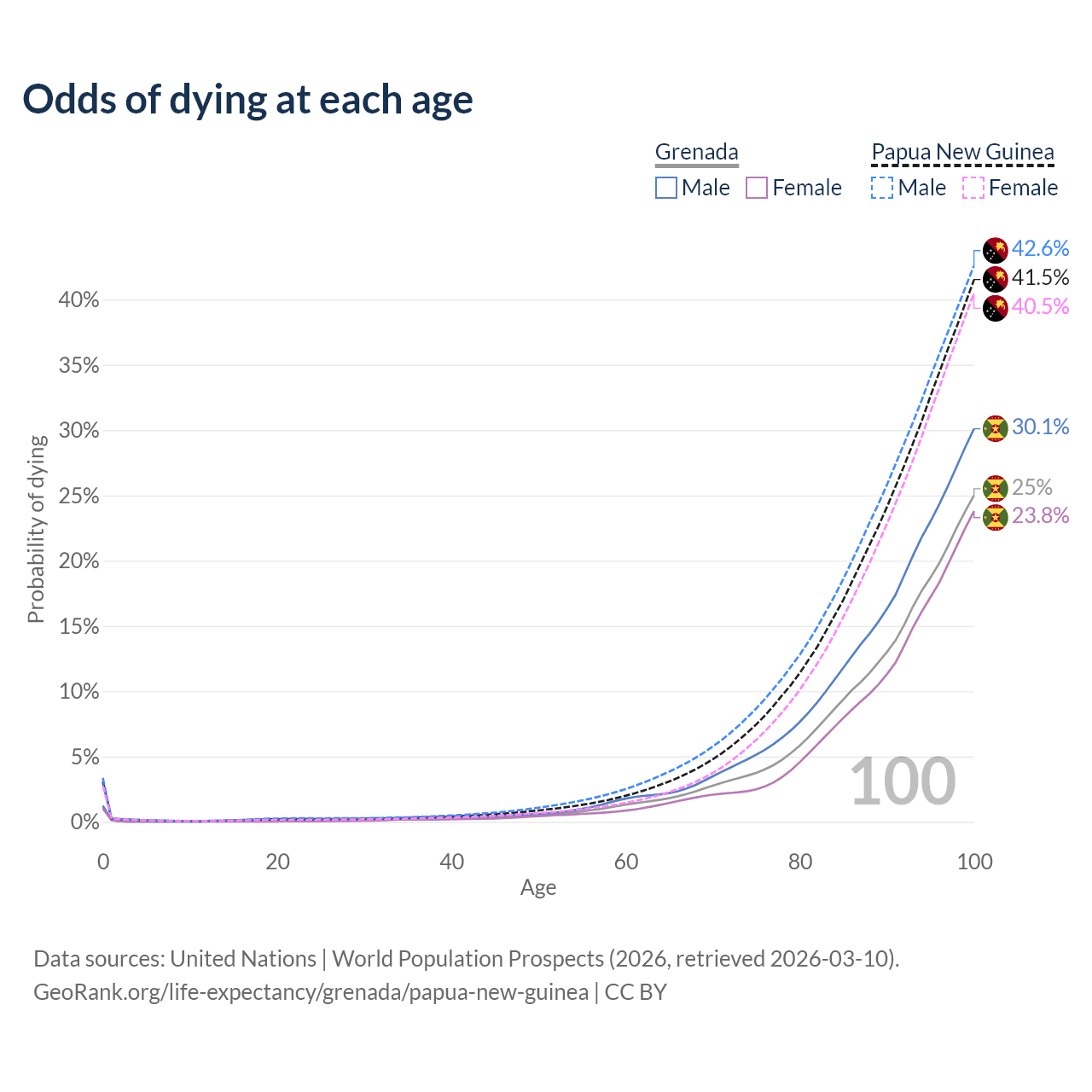 This life expectancy calculator shows the odds of living to 100, 95, 90, and below based on current age for both males and females in Grenada and Papua New Guinea, along with mean and median age of death. The calculations are based on the 2026 life tables (actuarial tables) from the UN World Population Prospects.
