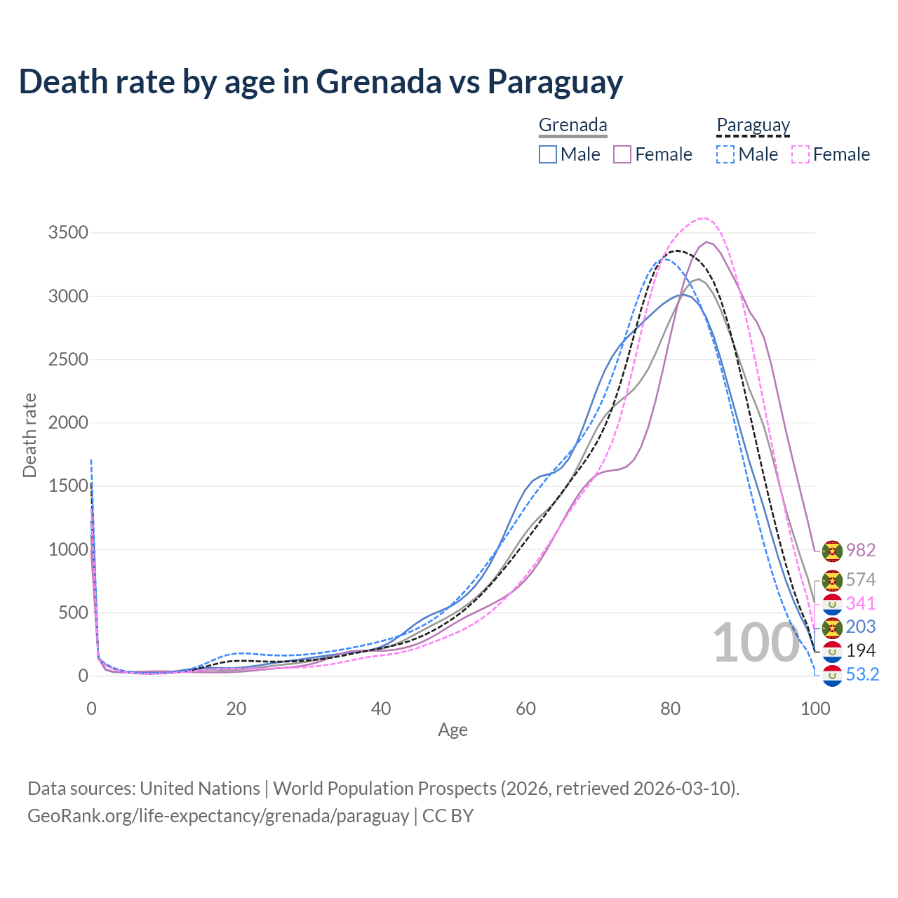 This life expectancy calculator shows the odds of living to 100, 95, 90, and below based on current age for both males and females in Grenada and Paraguay, along with mean and median age of death. The calculations are based on the 2026 life tables (actuarial tables) from the UN World Population Prospects.