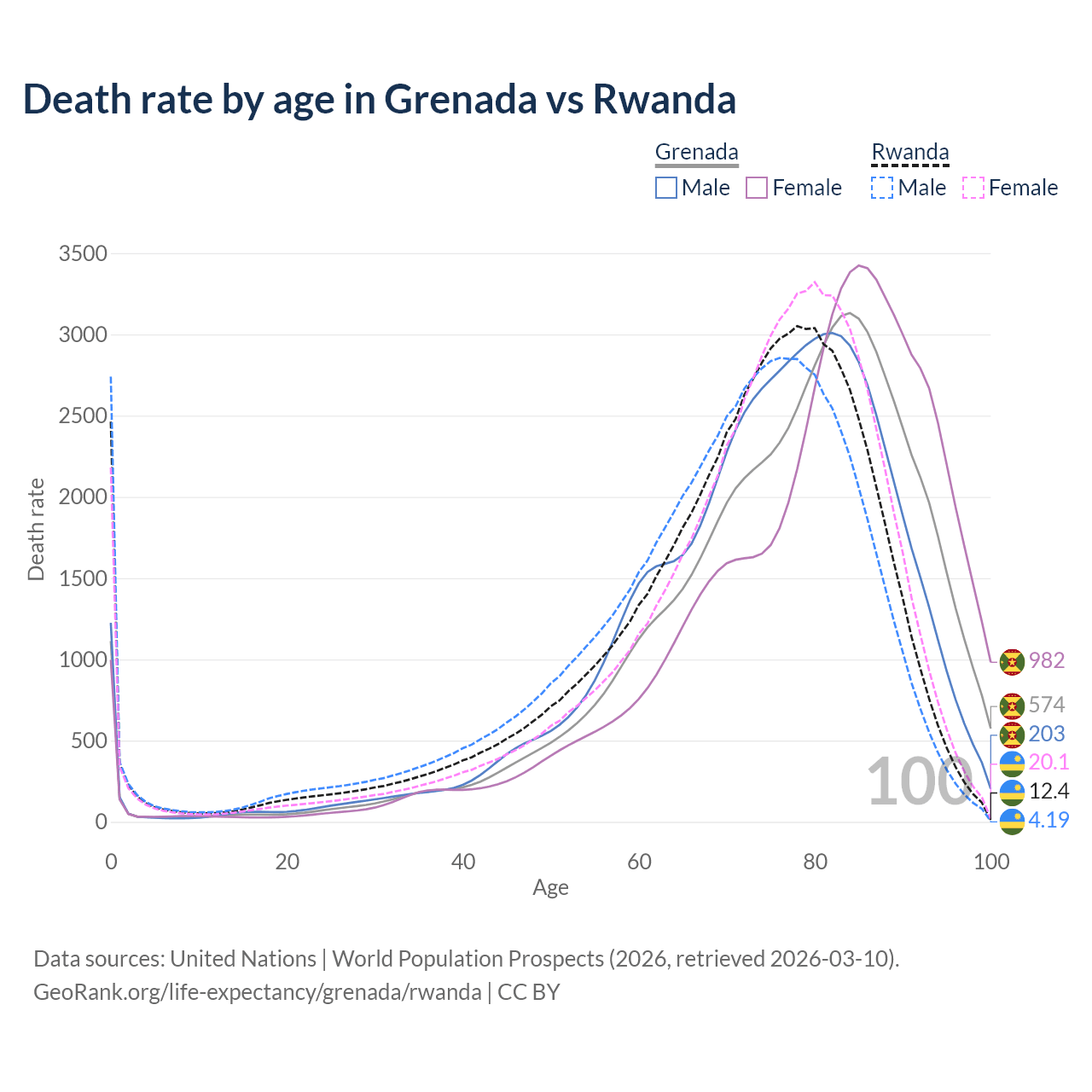 In Grenada, the most common age of death is 84, compared to 78 in Rwanda. The median age of death is 79.3 in Grenada and 73.5 in Rwanda, meaning only half of each cohort is expected to live past that age.