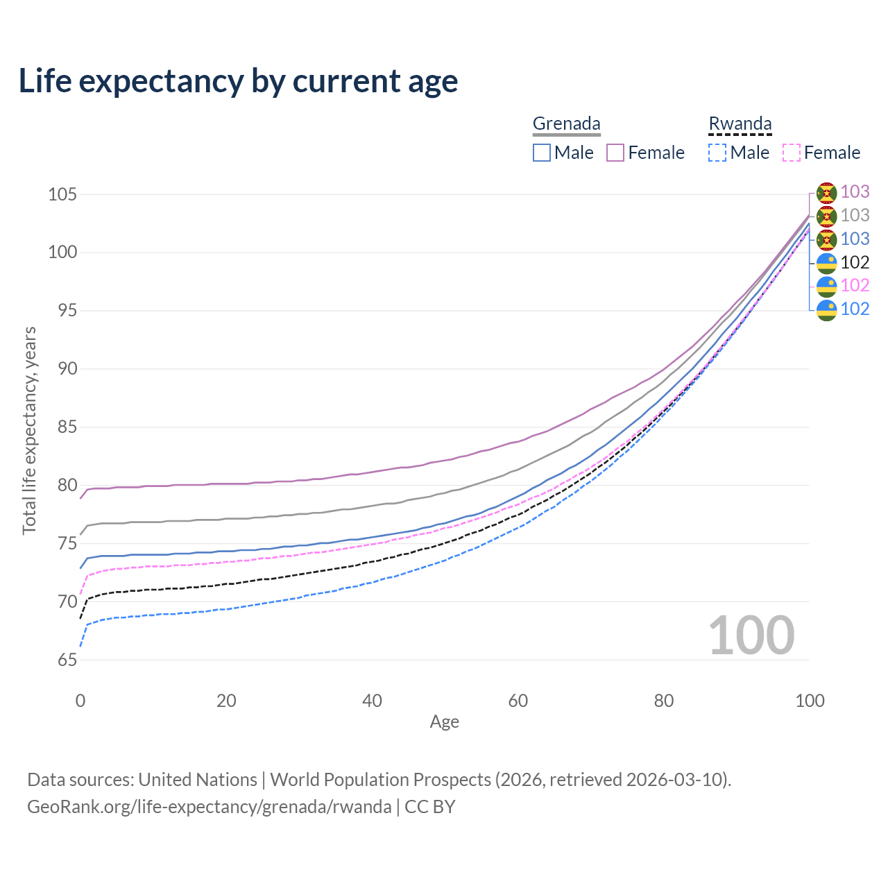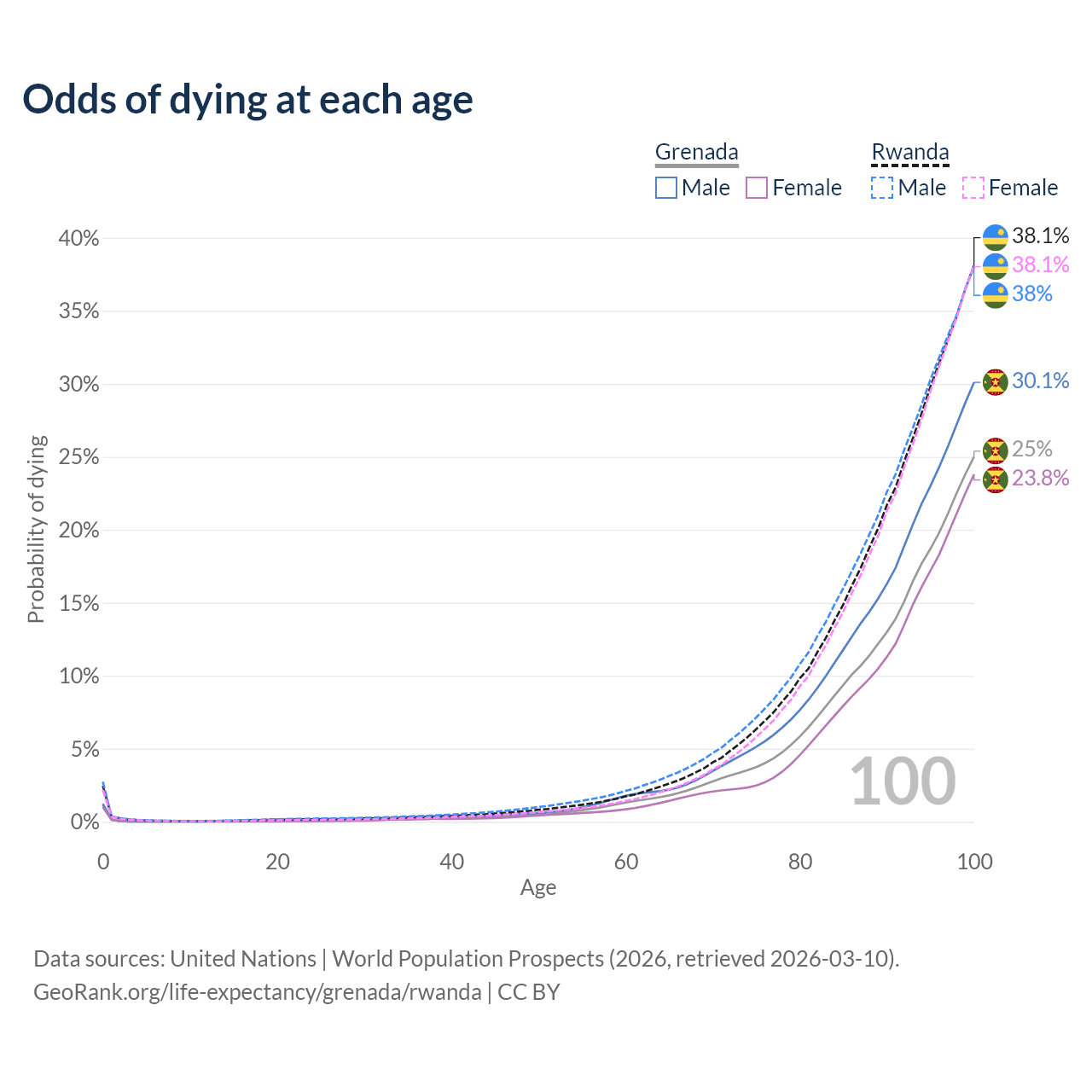 This life expectancy calculator shows the odds of living to 100, 95, 90, and below based on current age for both males and females in Grenada and Rwanda, along with mean and median age of death. The calculations are based on the 2026 life tables (actuarial tables) from the UN World Population Prospects.
